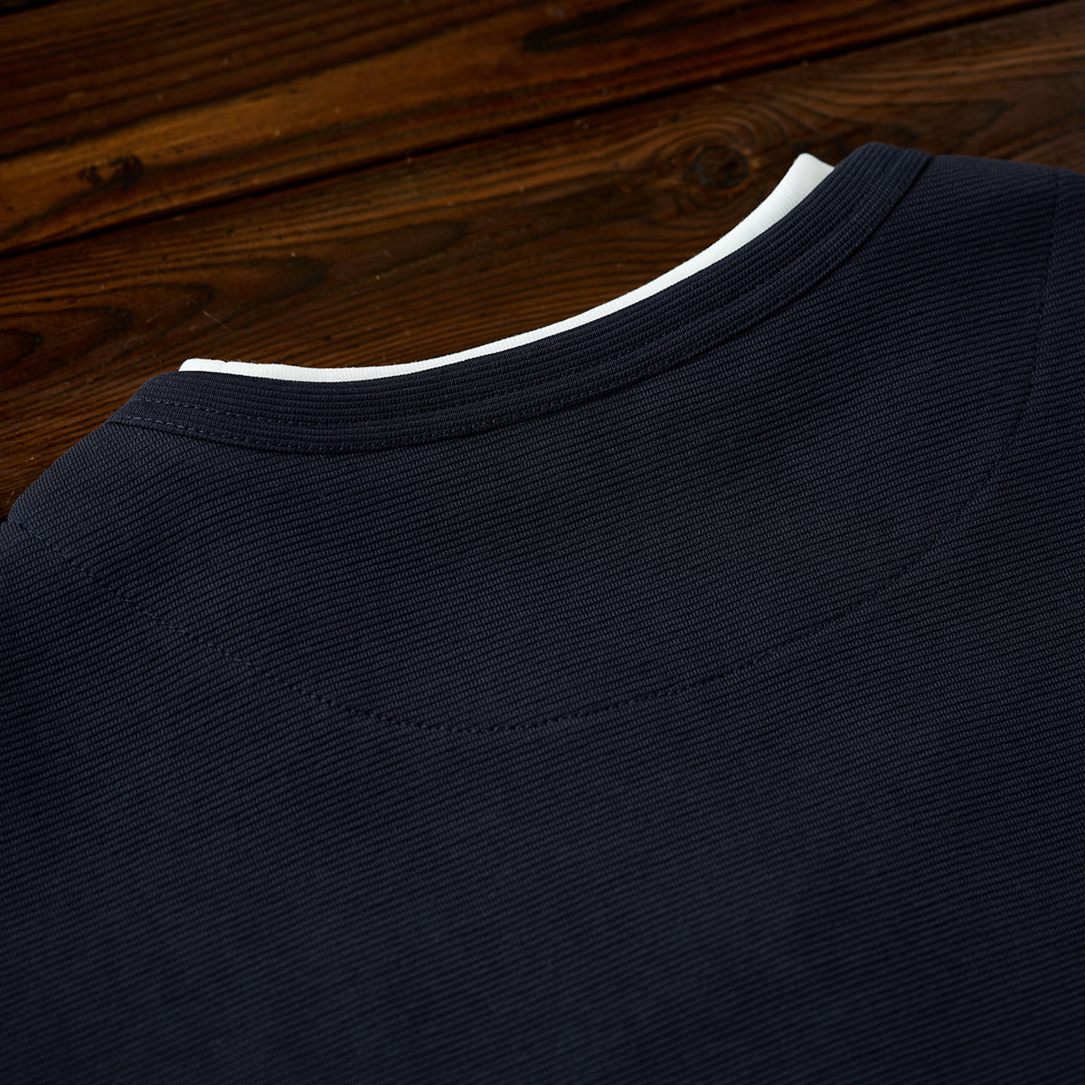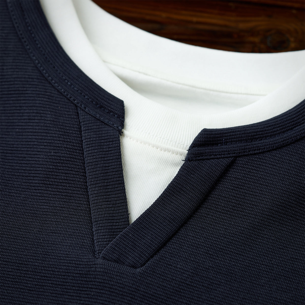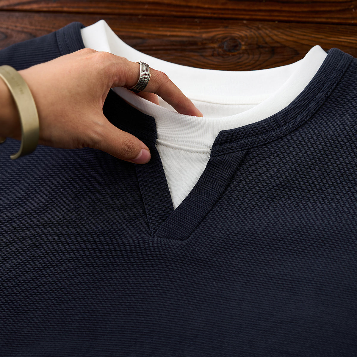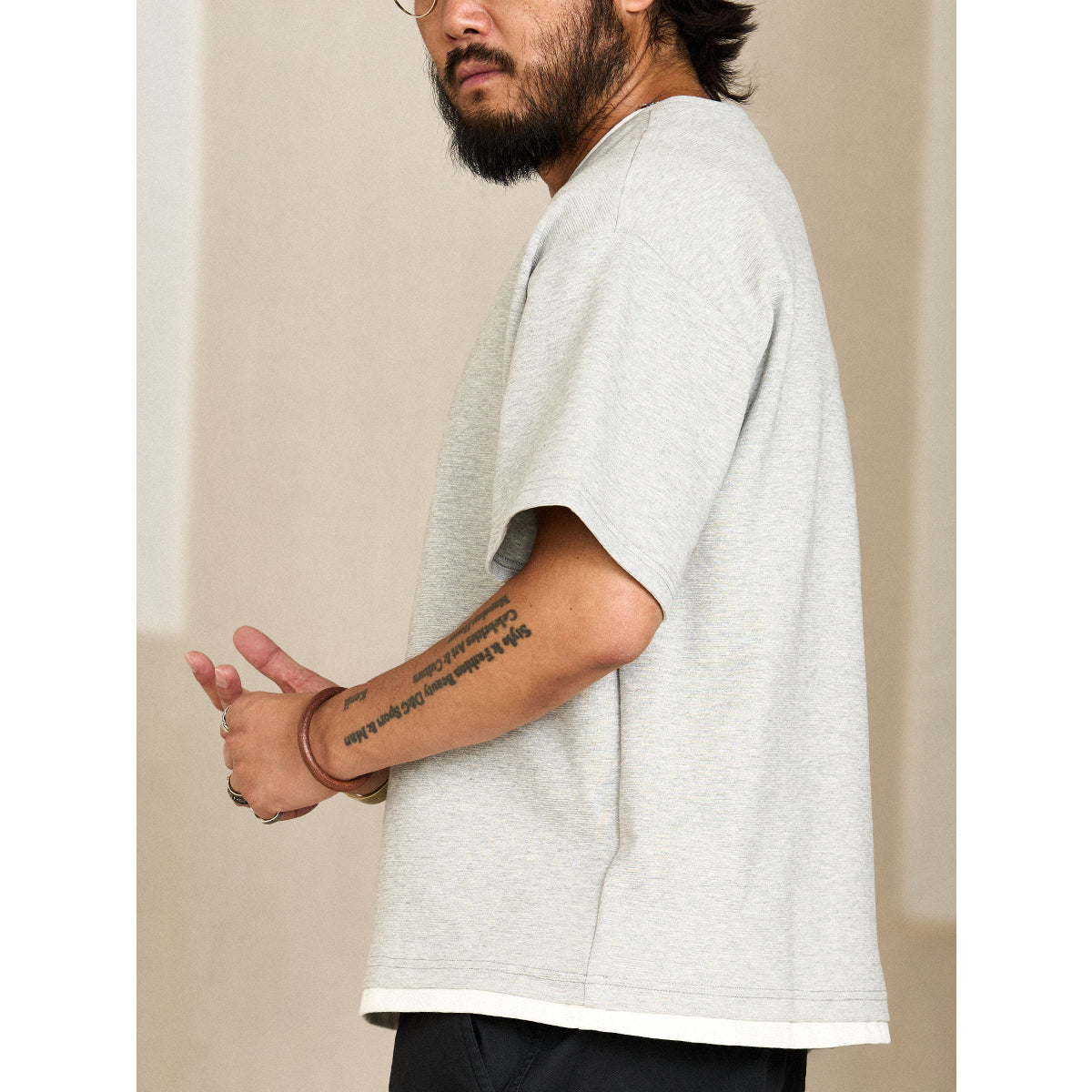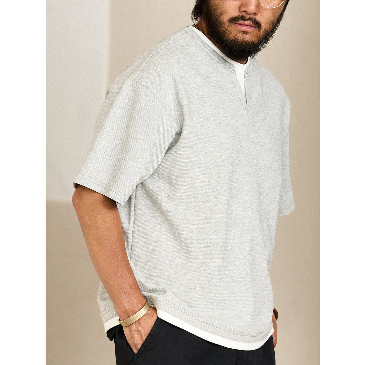 首元に浅いV字の切り込みを加えることで、アクセントをプラス。首元と裾部分に、インナーシャツを重ね着したように見えるデザインを採用。実際には1枚のTeeであり、重ね着による不快感を軽減しつつ、スタイリッシュなレイヤード効果を楽しめる。