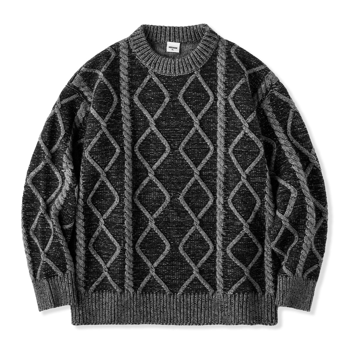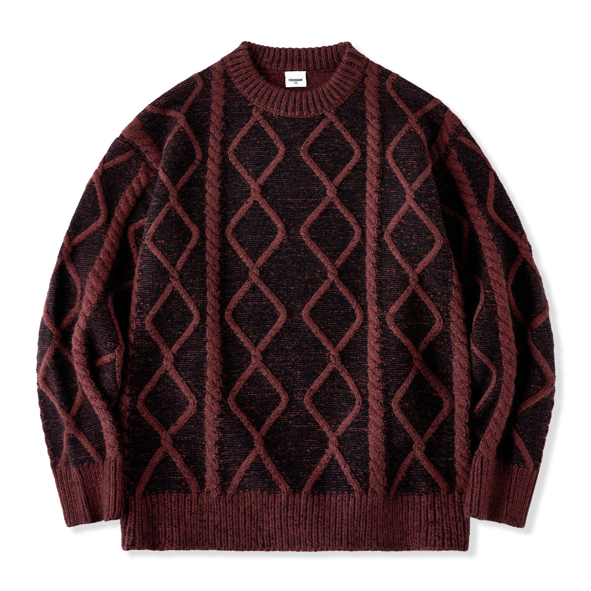 3色展開 ダイヤモンドケーブル柄編みクルーネックニットセーター