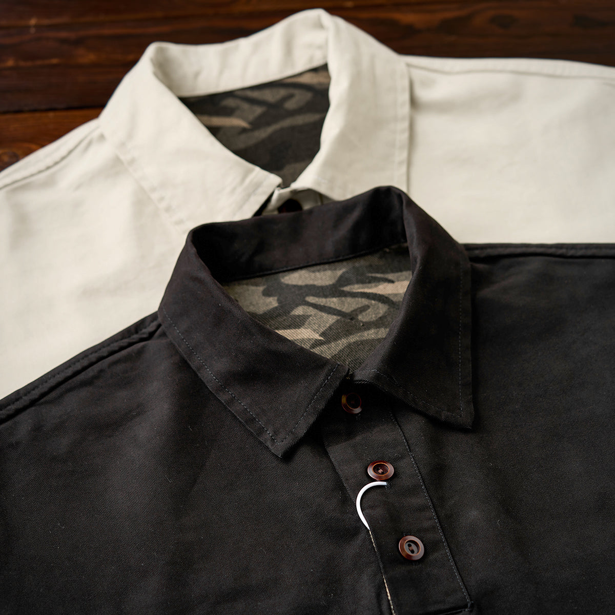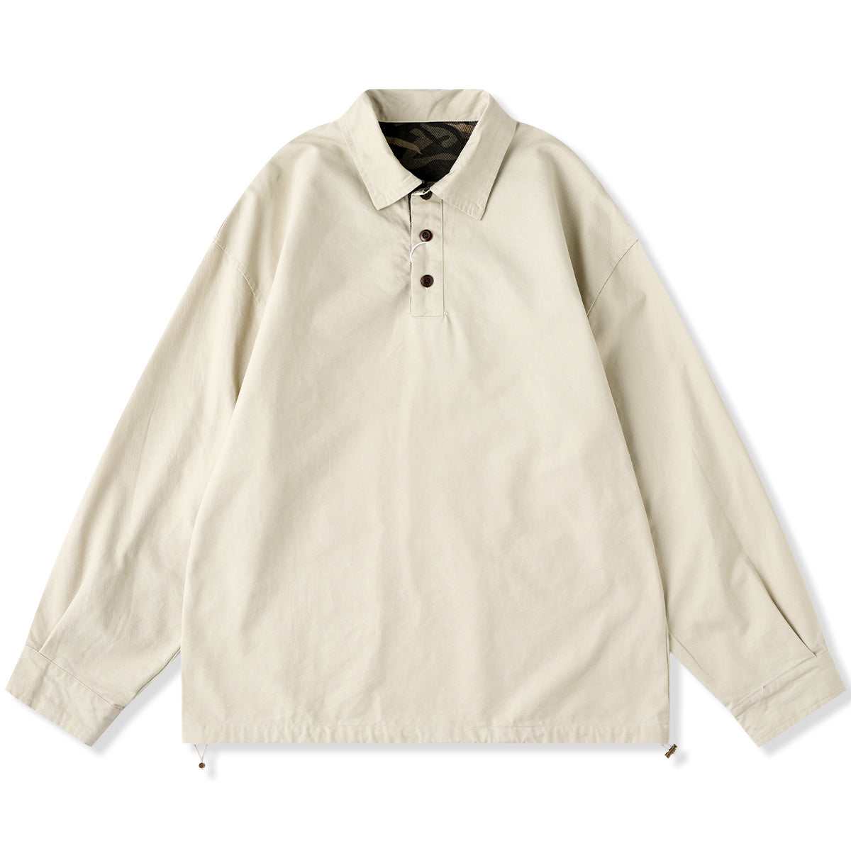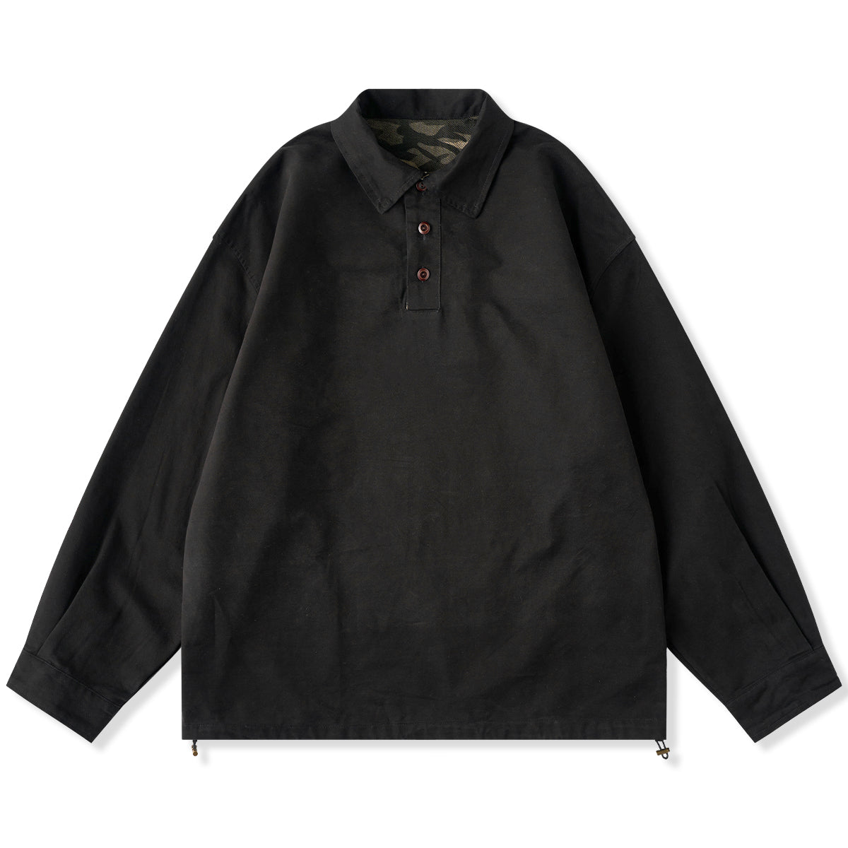 裏地カモ柄 裾ドローコード付きハーフボタンプルオーバー