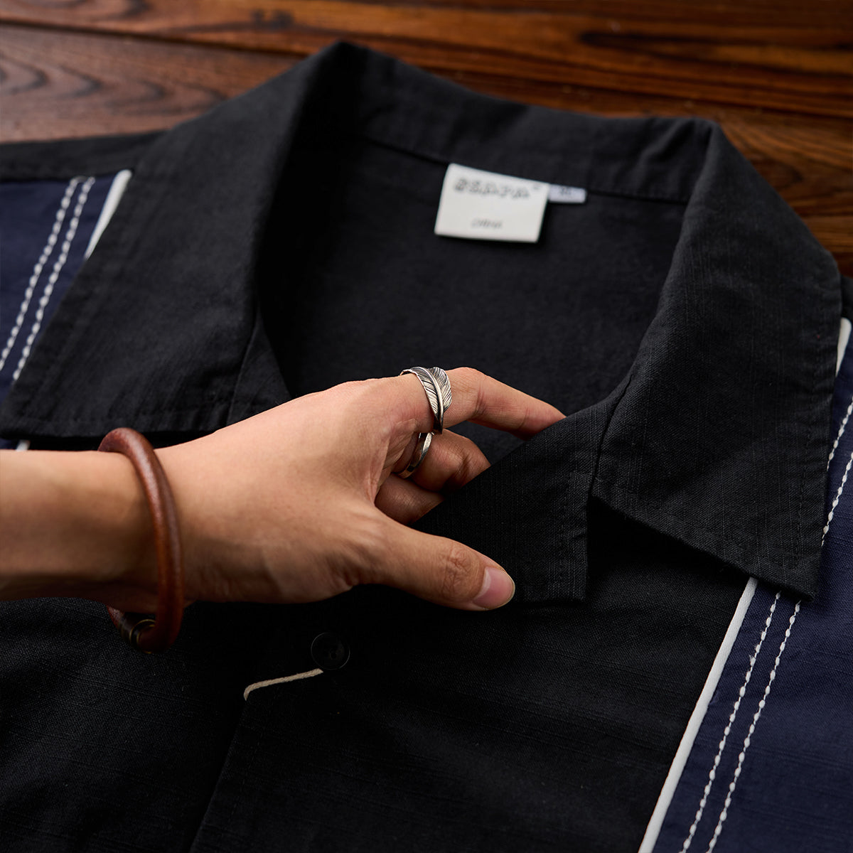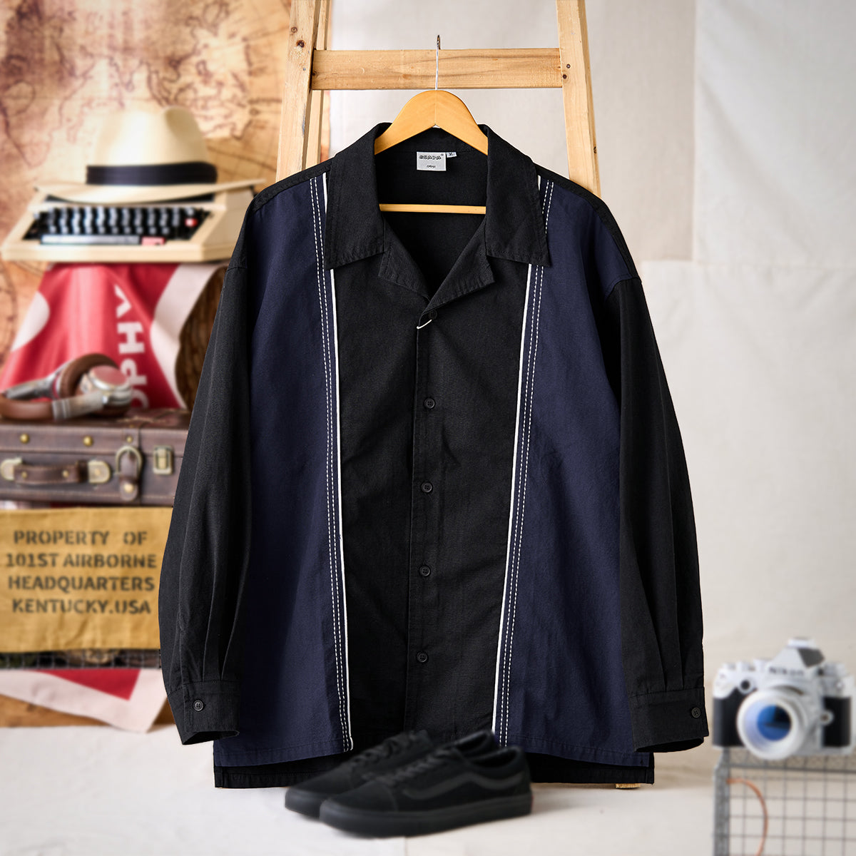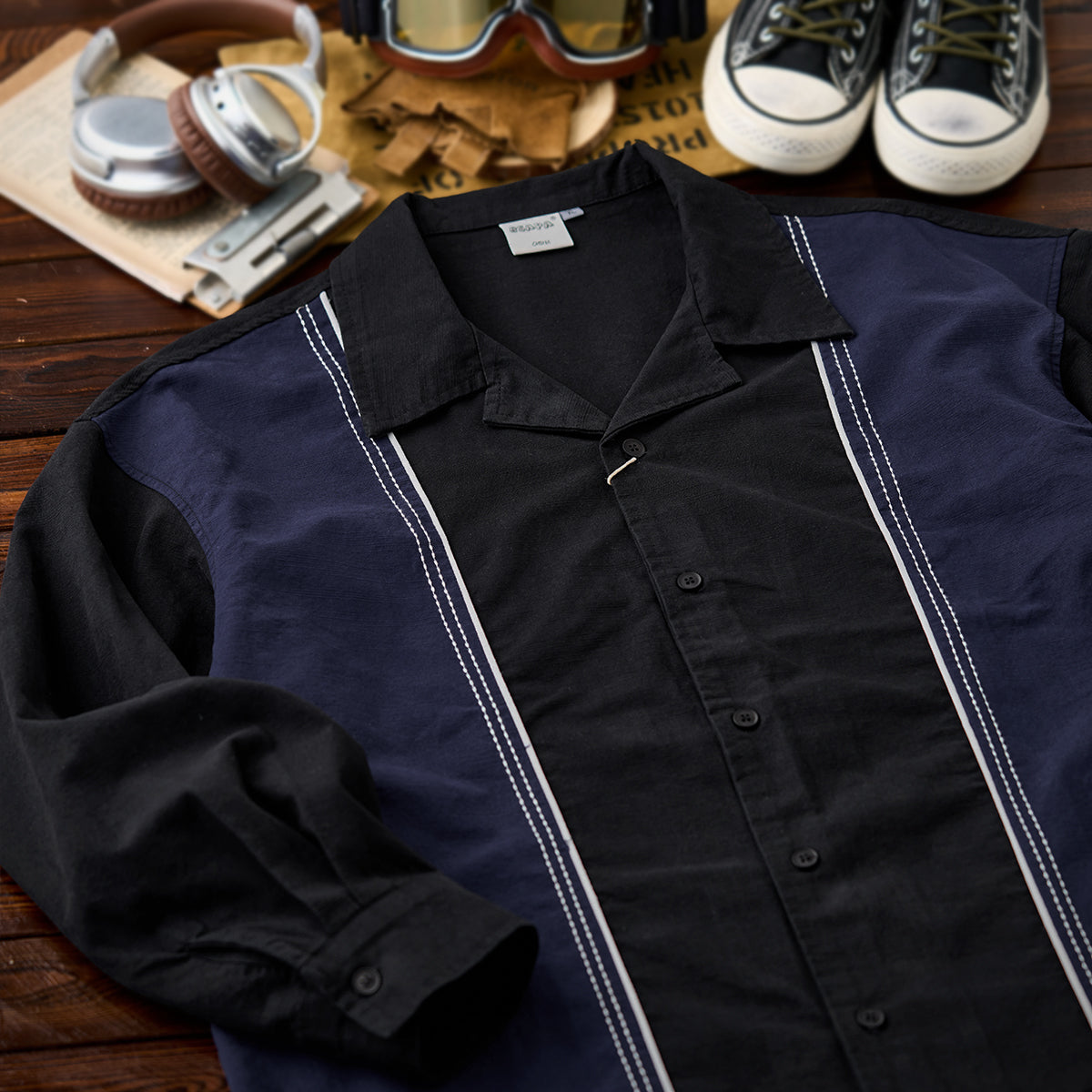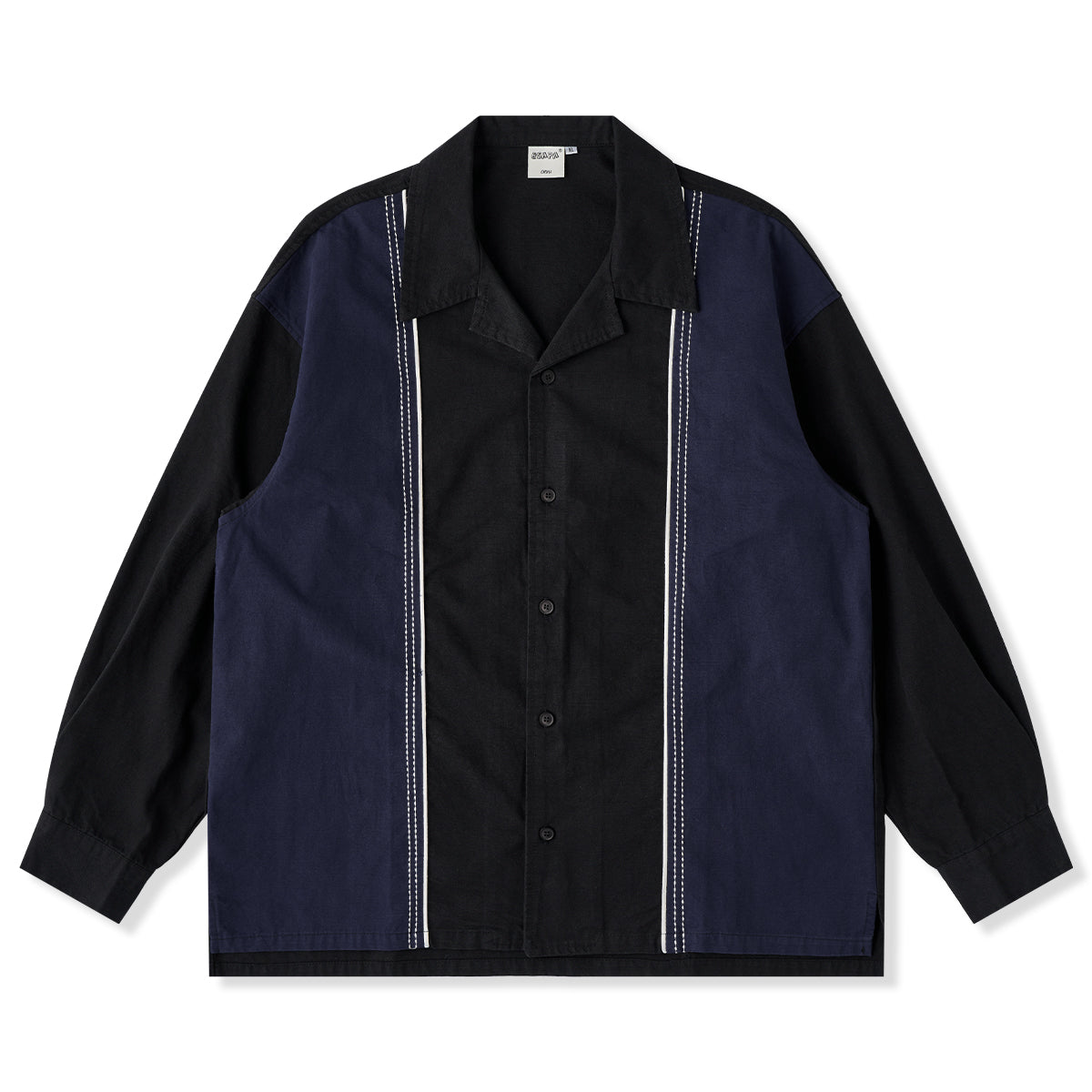 飾りステッチ ツートン配色切替オープンカラー長袖シャツ