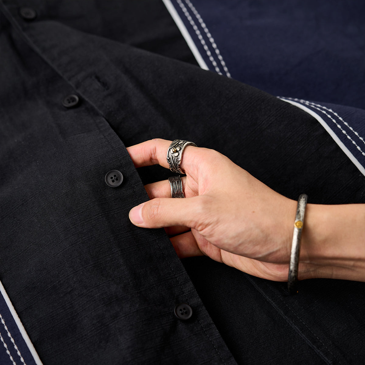 木調トグルダッフルボタン付き ペイズリー柄ジャカード織りデニムシャツ
