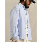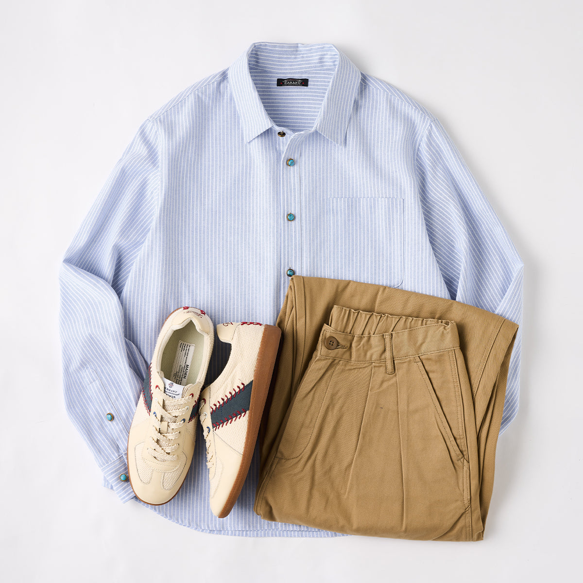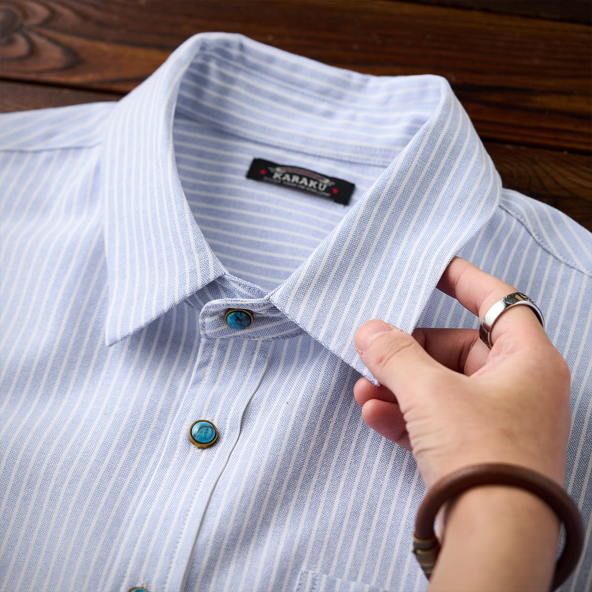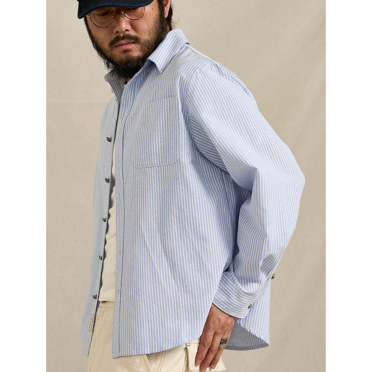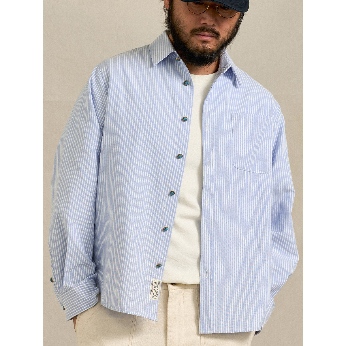 ベーシックなオックスフォード生地に、シングルストライプ柄をあしらったワークシャツ。さりげない縦ラインが清潔感を生み、カジュアルながらも上品な印象を与えます。ターコイズ調のボタンをアクセントに配し、控えめながらも個性を感じさせるディテールに。着こなし次第で、シャツ単体のきれいめスタイルから、ジャケットやニットのインナーまで幅広く対応します。丈夫なオックスフォード素材で長く着用でき、デイリーユースにぴったり。ワークシャツ由来のデザインながら、細部の仕上げにこだわった一枚は、シンプルながらも洗練された雰囲気を演出します。
