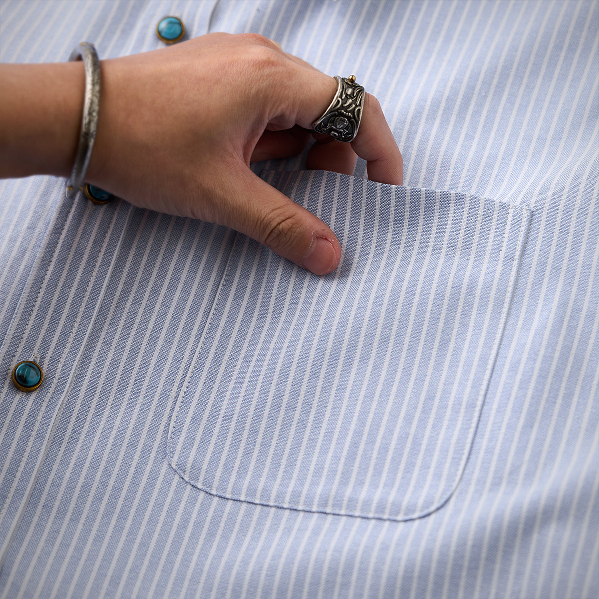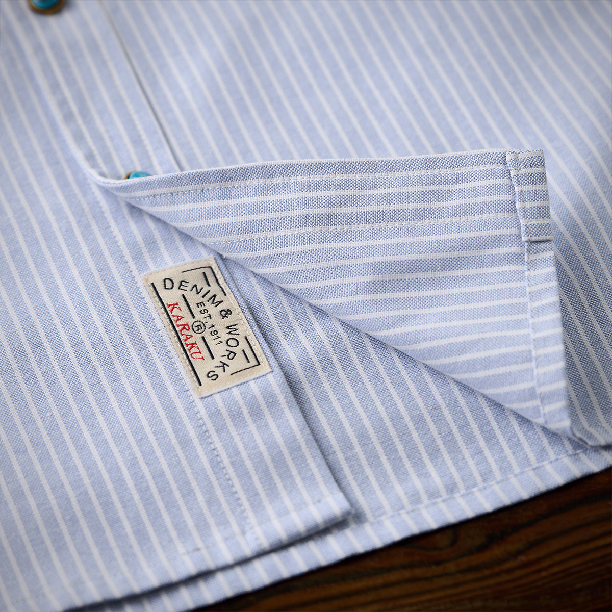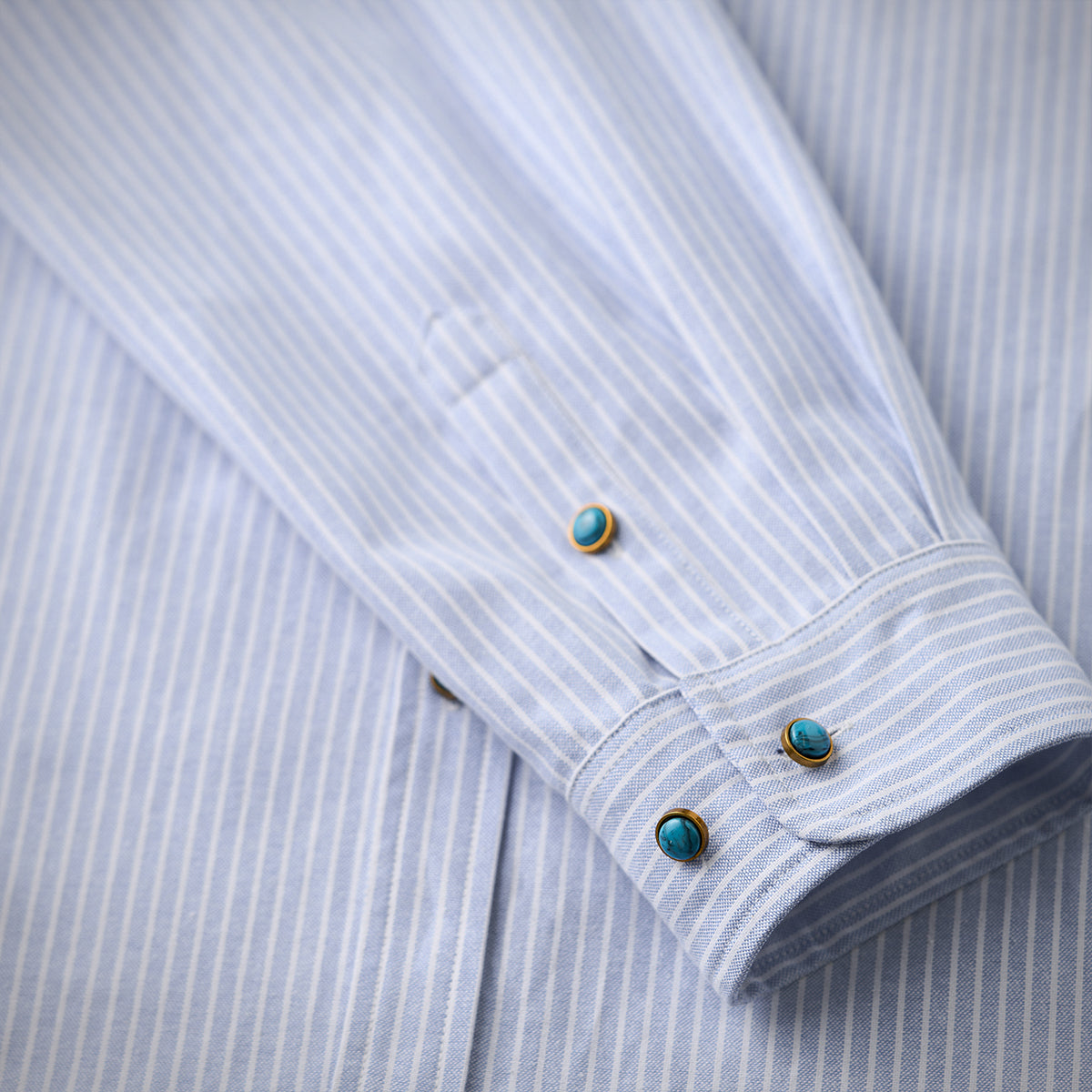 ターコイズ調ボタン付き シングルストライプ柄オックスフォードワークシャツ