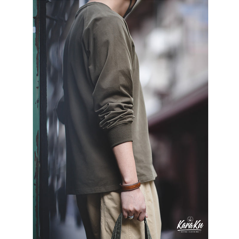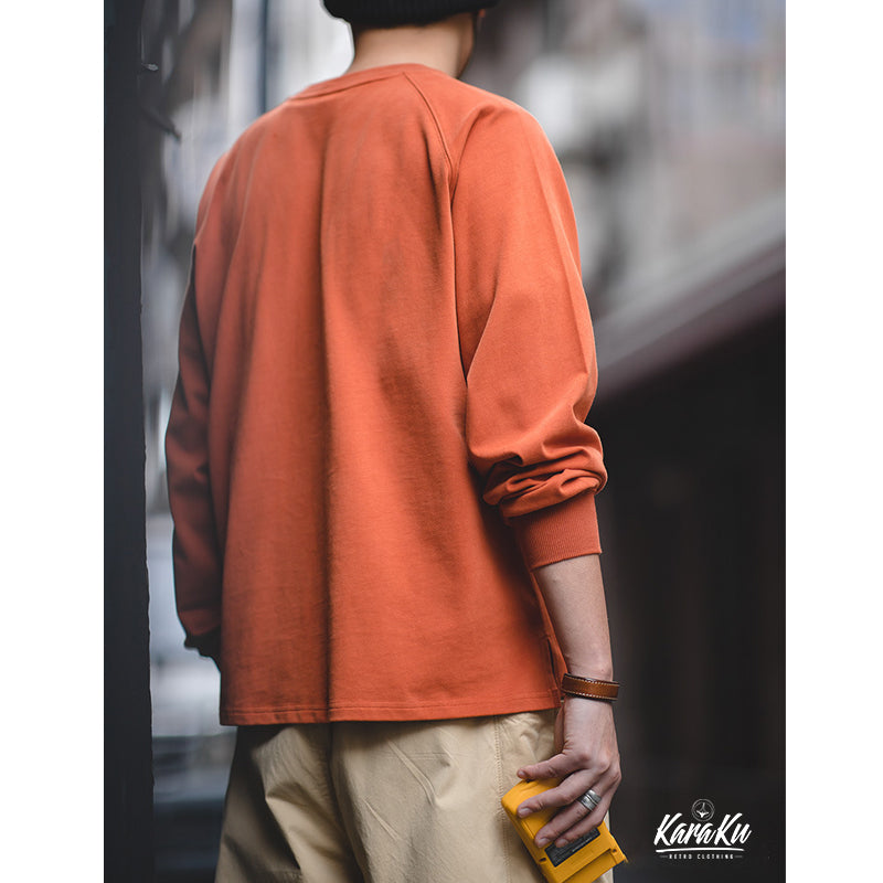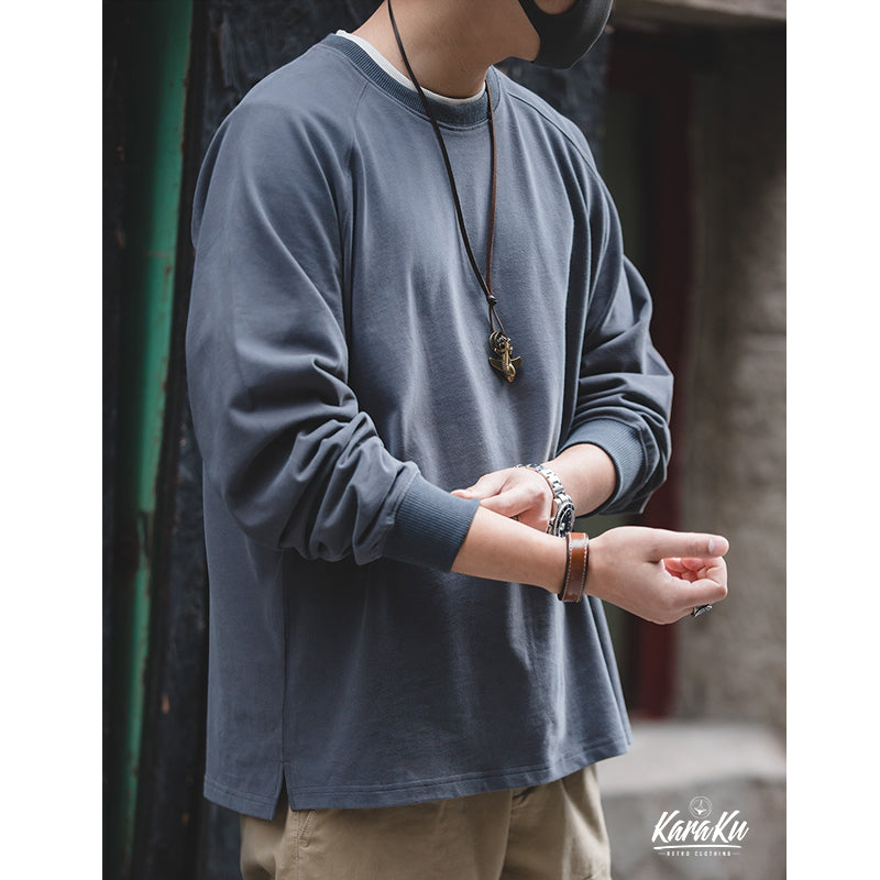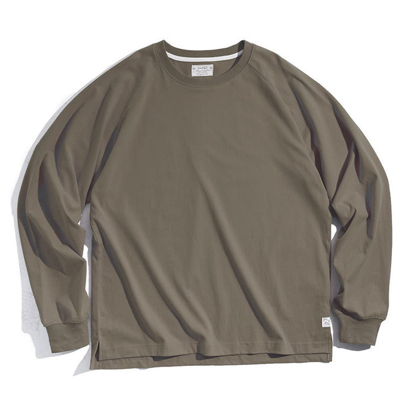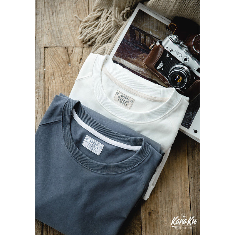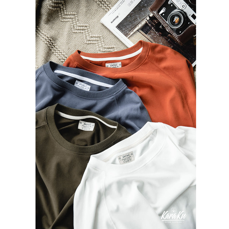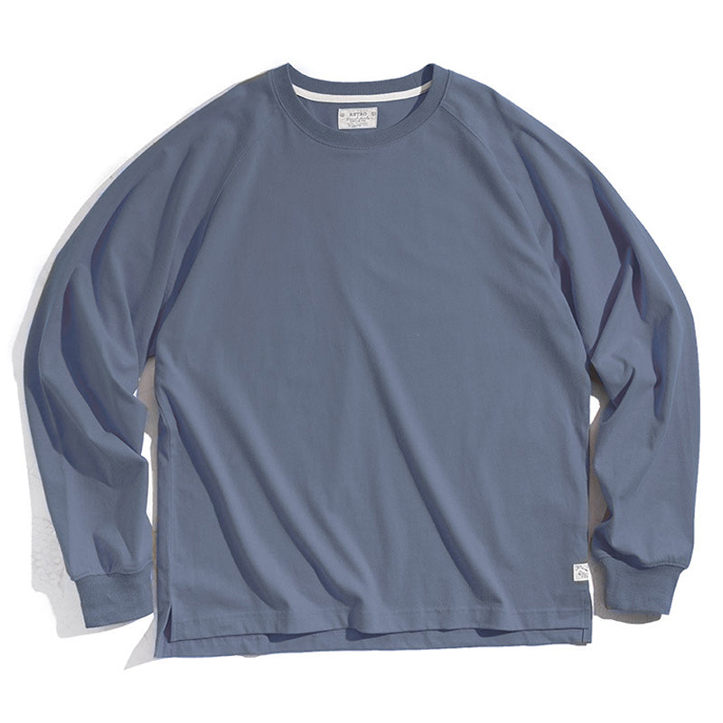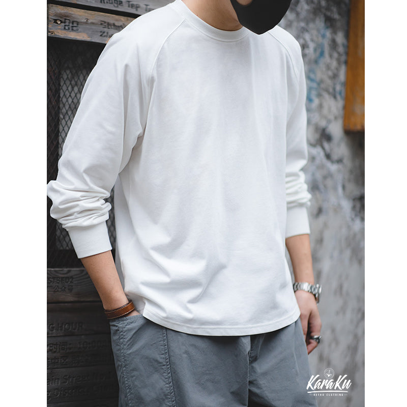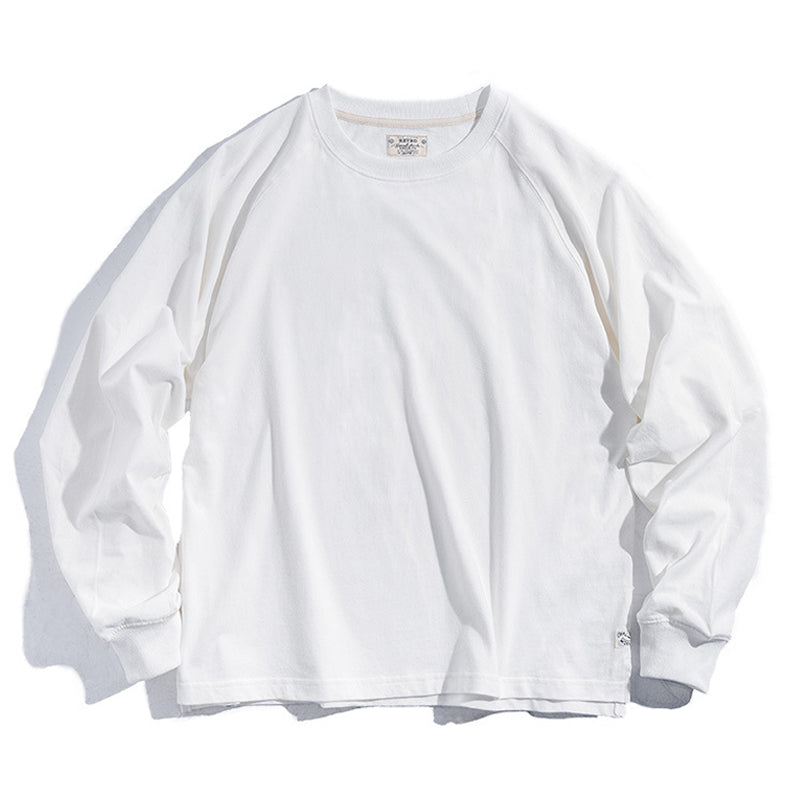 襟元、袖口や裾にリブを配置し、ボディは洗濯を繰り返してもヘタれにくい肉厚カットソー生地で、型崩れもしにくいようダブルステッチで仕上げられている。