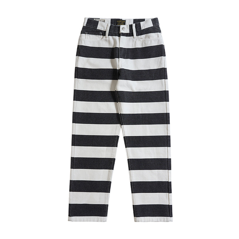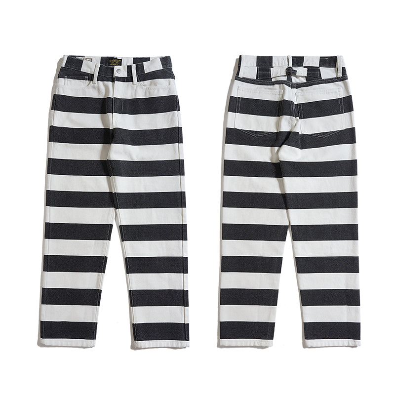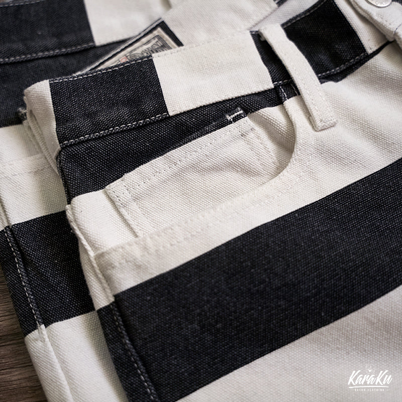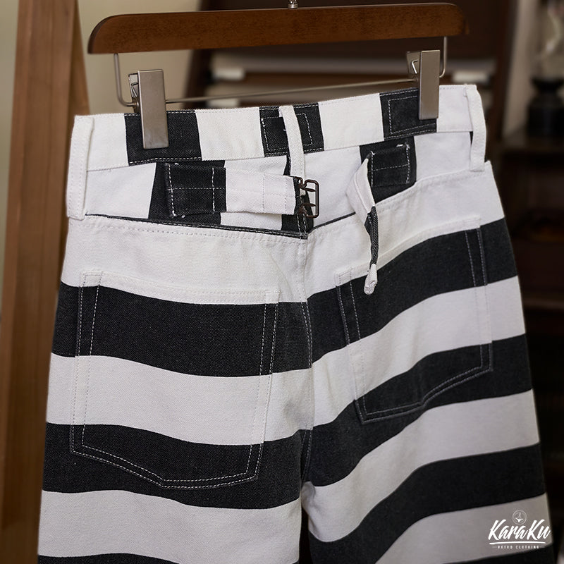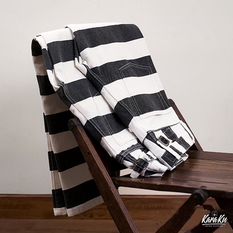 ヴィンテージ市場でも非常に人気が高いプリズナーパンツが登場!ファッションアイテムとしても認知されているプリズナーパンツ。バイカーファッションとしても高い人気を誇ります。アメカジに欠かせないアイテムです!目を引くボーダー柄が最大のポイント。シンチバックのディテールはもちろん、YKKジップ、前後ポケットなど、細部にもこだわって、質感が満ちる。シルエット・ディテール・素材使いとクオリティの高い仕上がりとなって、アメカジ、バイカーの方にオススメ。