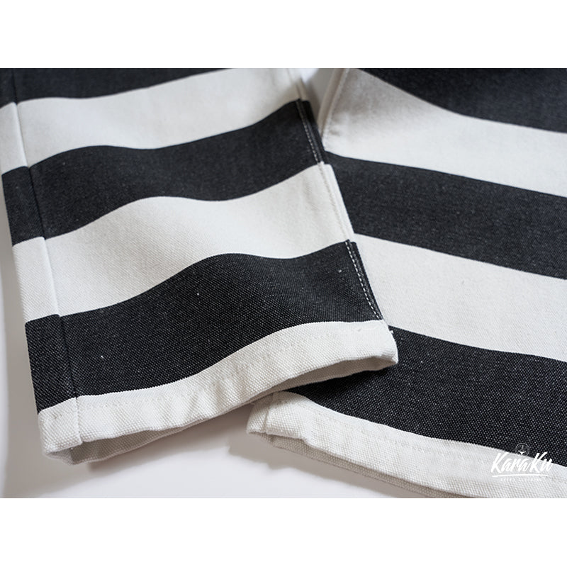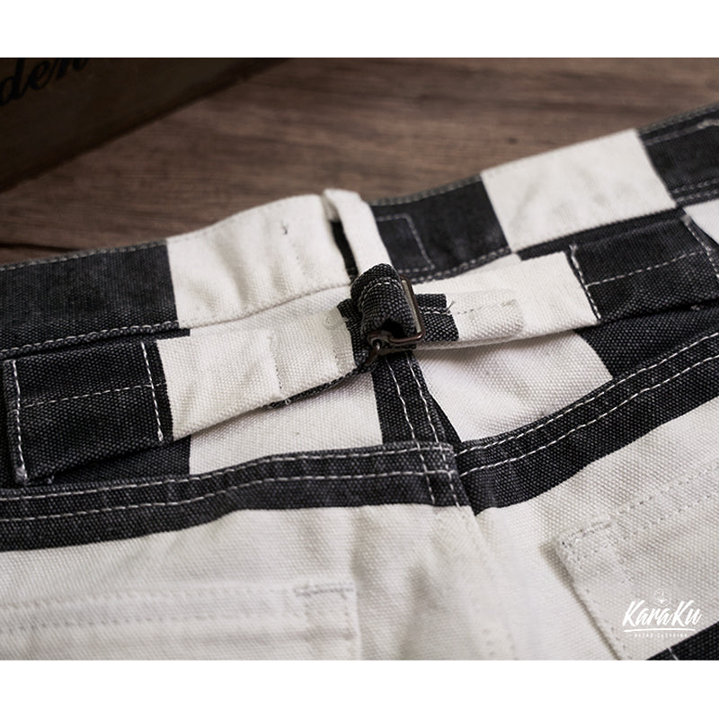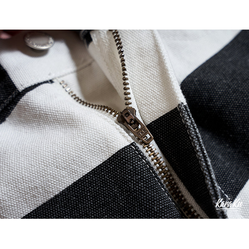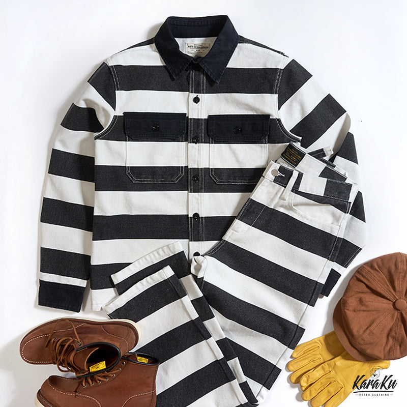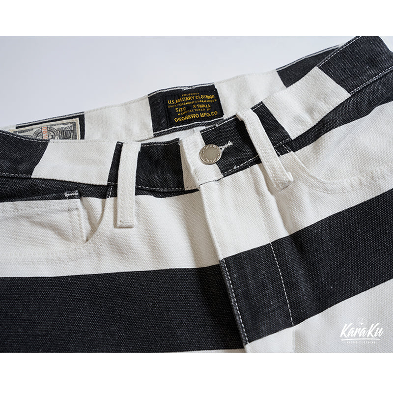 ヴィンテージ市場でも非常に人気が高いプリズナーパンツが登場!ファッションアイテムとしても認知されているプリズナーパンツ。バイカーファッションとしても高い人気を誇ります。アメカジに欠かせないアイテムです!目を引くボーダー柄が最大のポイント。シンチバックのディテールはもちろん、YKKジップ、前後ポケットなど、細部にもこだわって、質感が満ちる。シルエット・ディテール・素材使いとクオリティの高い仕上がりとなって、アメカジ、バイカーの方にオススメ。