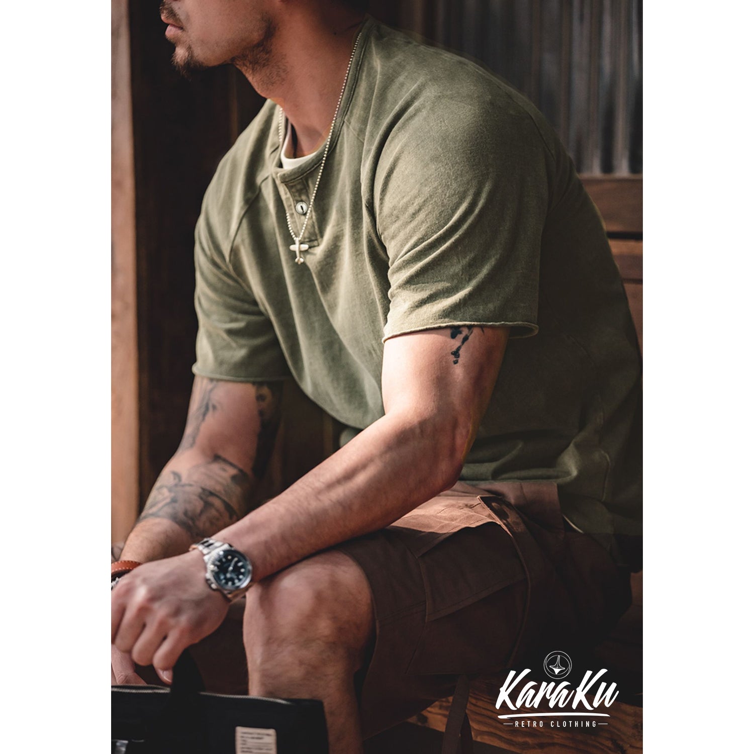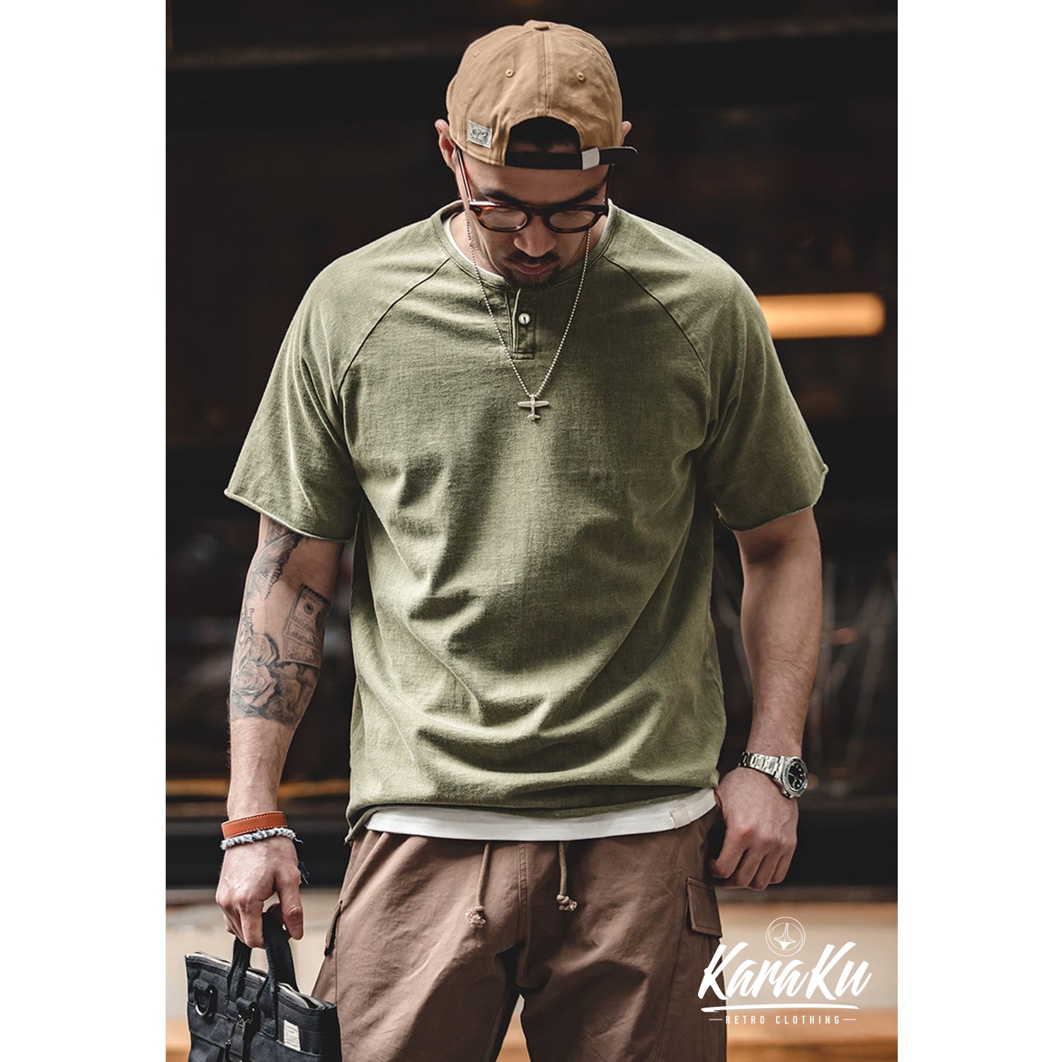 本アイテムはオリジナルコットン生地を使用し、柔らかさと質感で現れ、丈夫さと暖かさを併せ持った質感が特徴で、独自に編み立てた詰め生地を使用したシンプルなヘンリーネックポケットTシャツ。ネックラインが変わることでガラっと印象が変わるヘンリーネックは、ボタンの開閉次第でラフでワイルドな印象からシャツのような大人っぽい印象にもアレンジが可能。クルーネックTシャツに偏りがちな春夏のコーディネートのアクセントにも最適で、ワークやミリタリーテイストのアイテムと相性抜群。