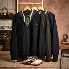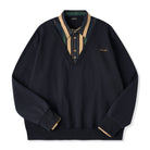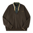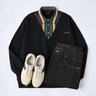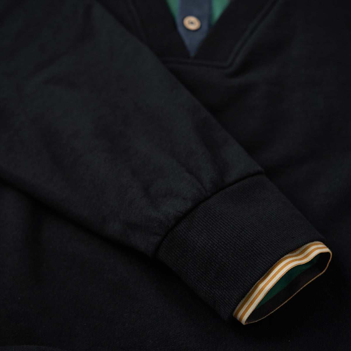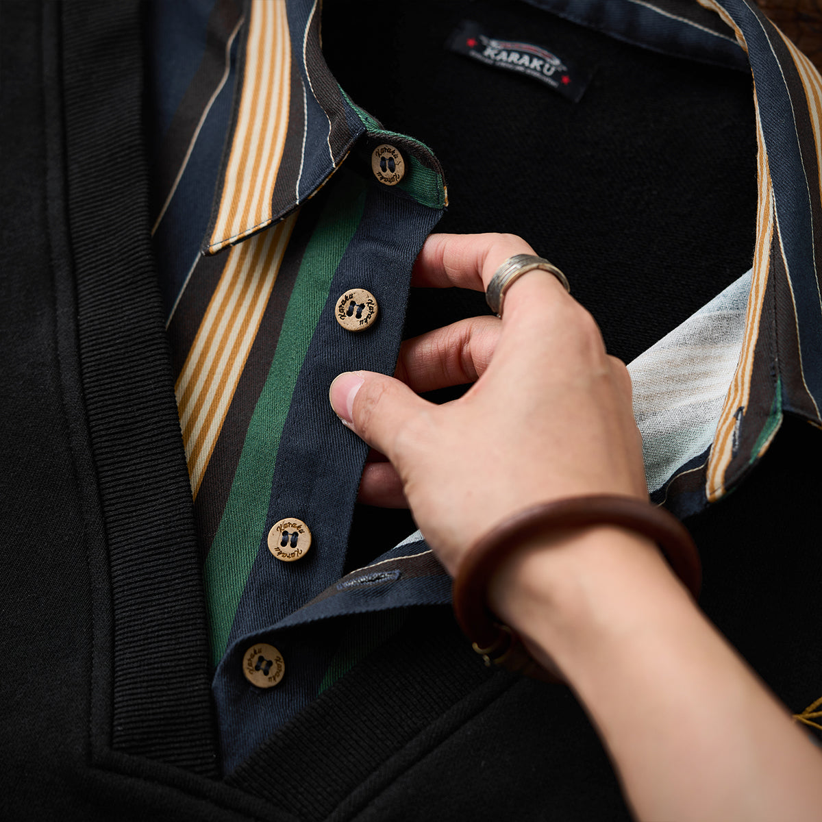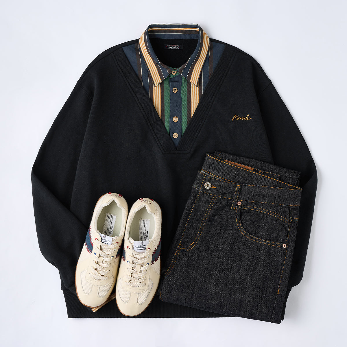 1枚で重ね着風のスタイルが完成する、フェイクレイヤード仕様のVネックプルオーバースウェット。ネック・袖口にマルチストライプ柄のシャツ生地を組み合わせ、まるでシャツをインしたような立体感あるレイヤードを演出しています。スウェット本体は程よい厚みで柔らかな肌触り。カジュアルな着こなしから、きれいめの抜け感づくりまで幅広く活躍します。コーデの手間を省きながらも、こなれた印象に仕上がる便利な一枚です。