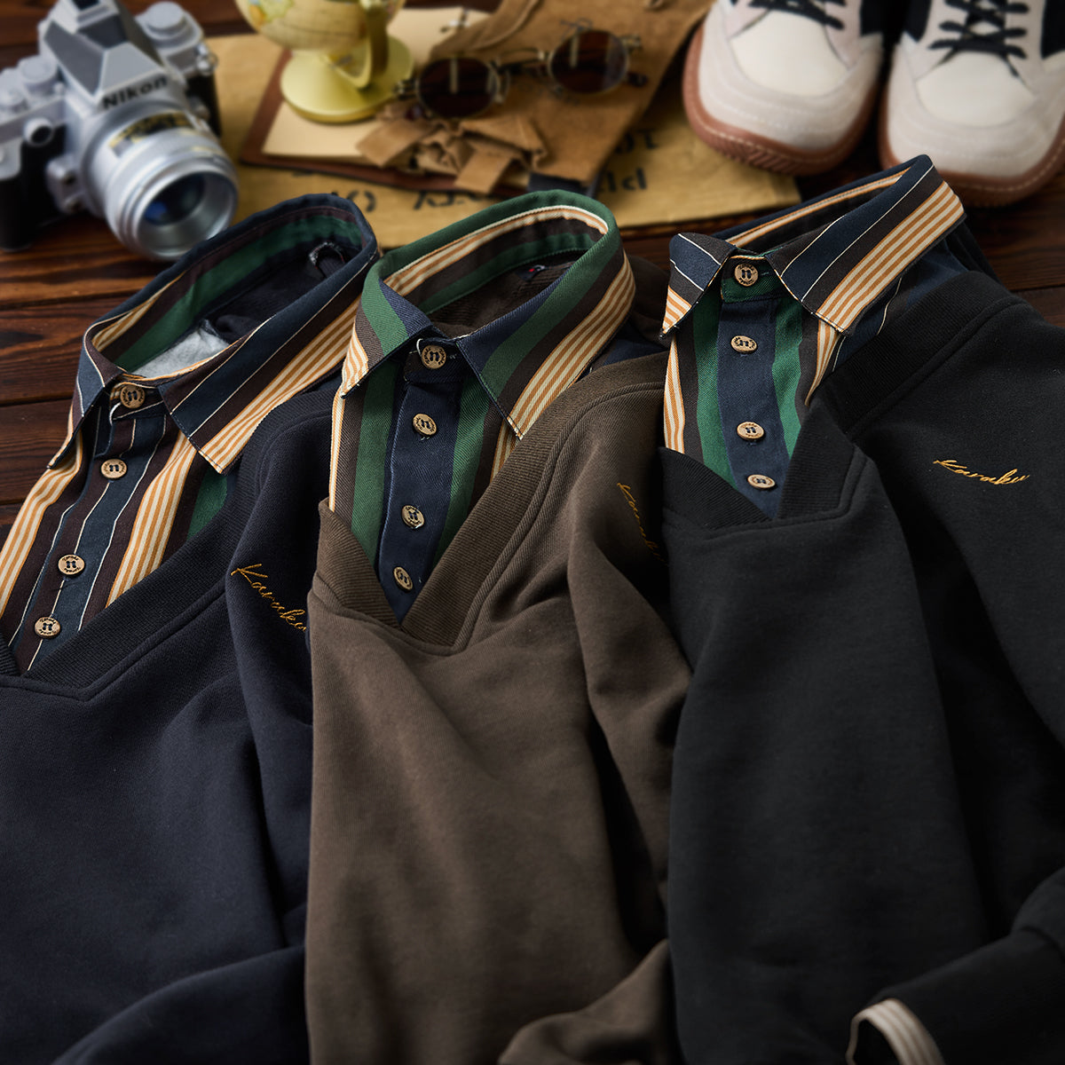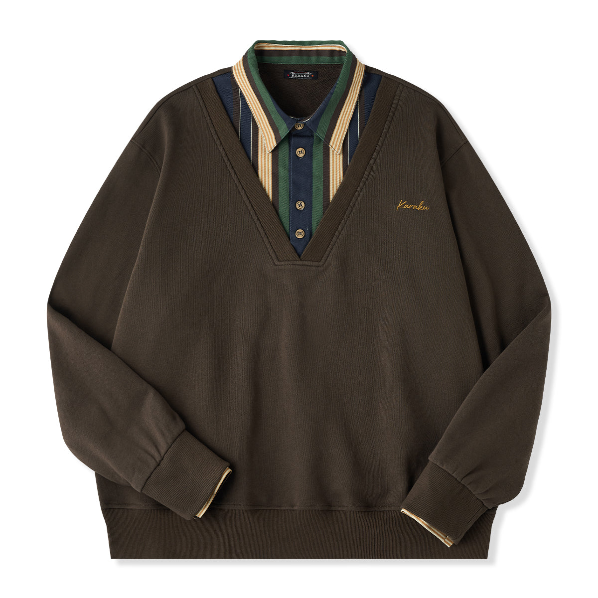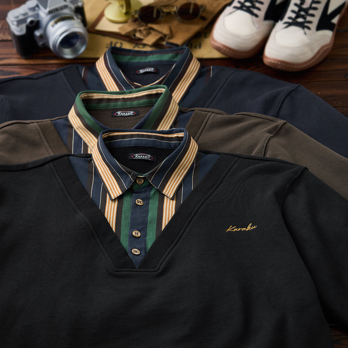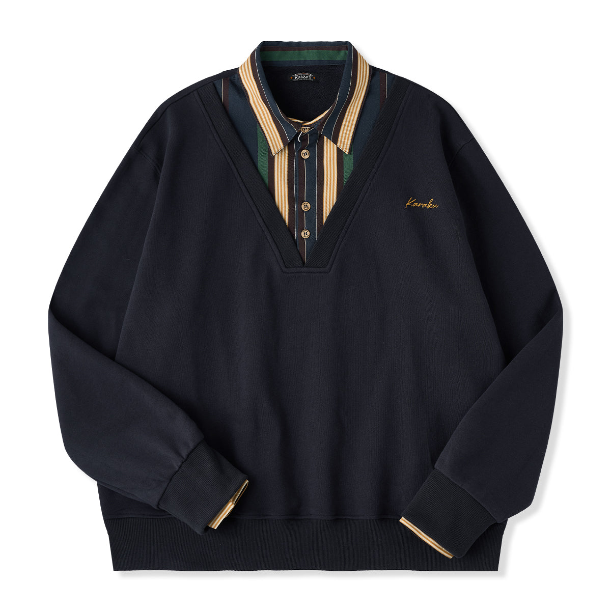 【予約】フェイクレイヤード仕様 マルチストライプシャツ&Vネックプルオーバースウェット