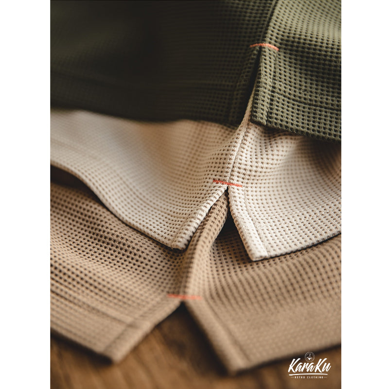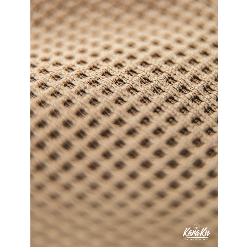 ワッフル生地を使用し、柄は小さく凹凸がはっきりしているので、糸を立体的に丁寧に編み上げる事でもっちりとした肌なじみの良さを感じていただける着心地に。