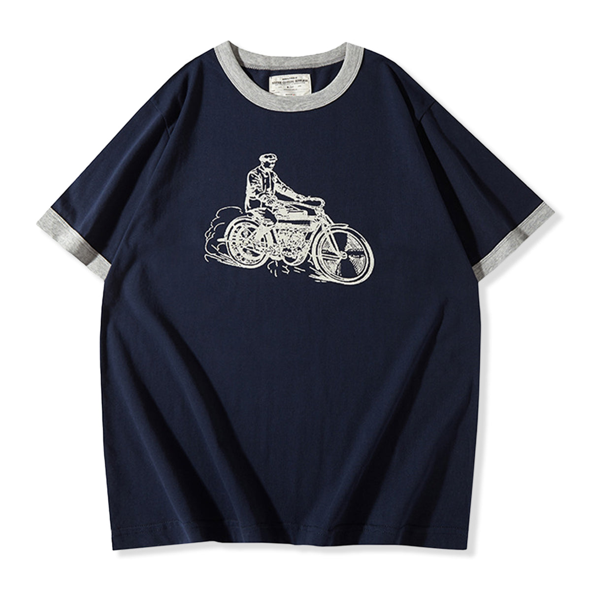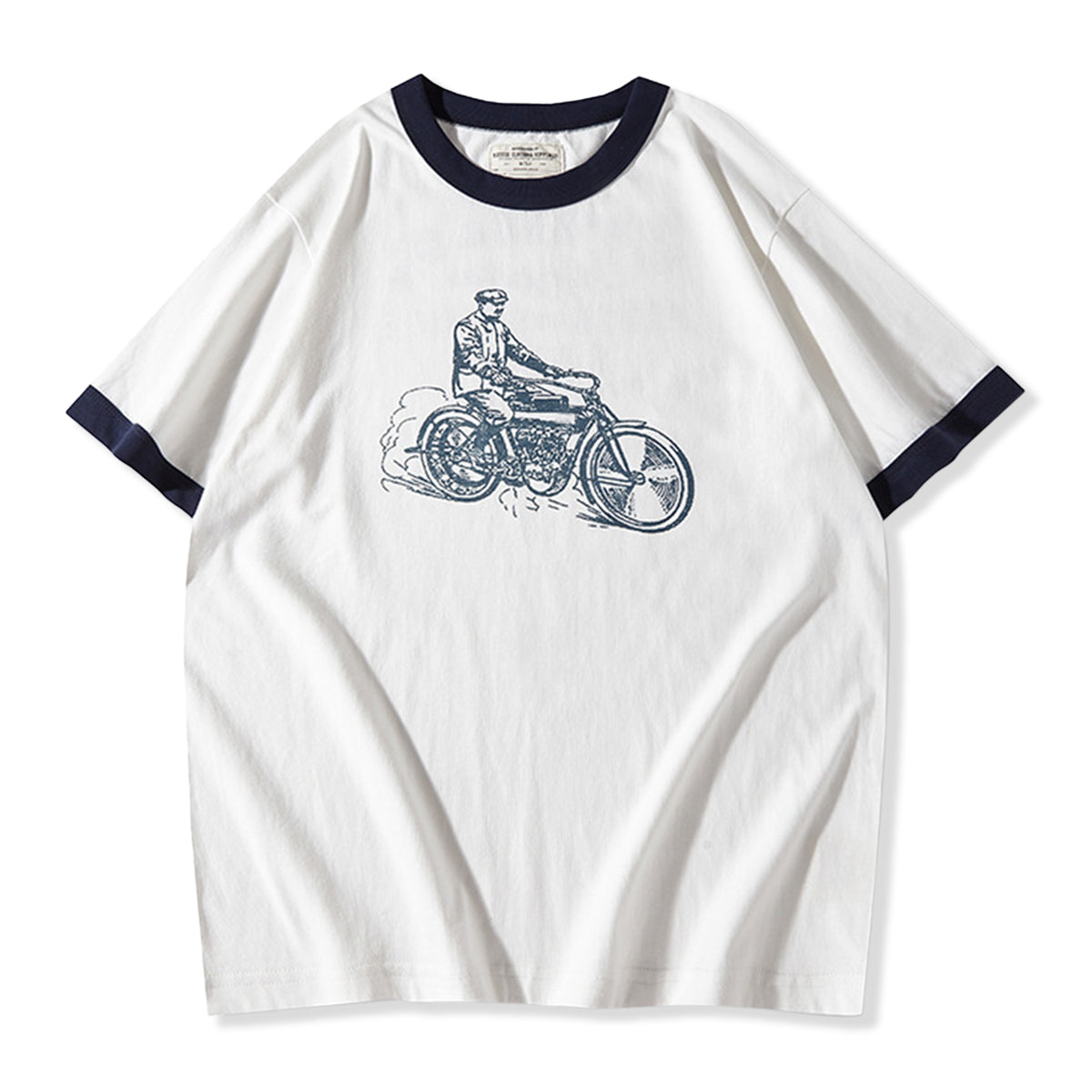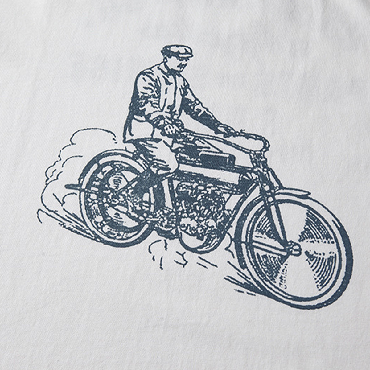 フロントに手描き風のクラシックバイクとライダー線画は、バイクの構造やライダーの服装には、20世紀初頭のレトロな雰囲気が漂います。