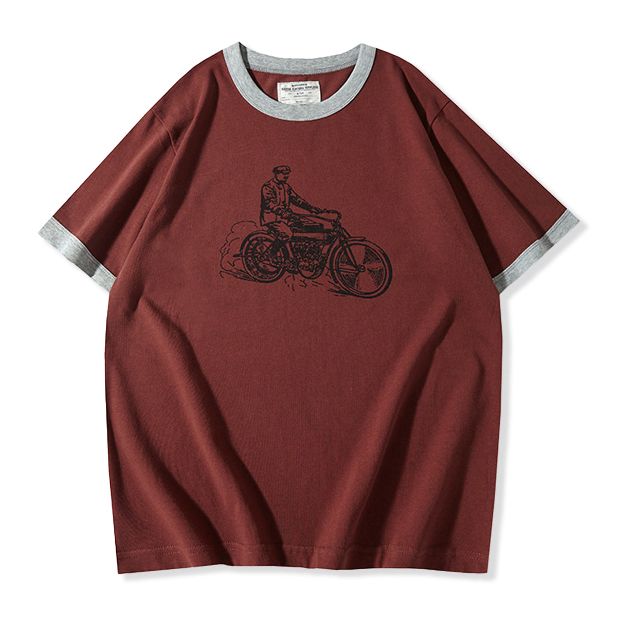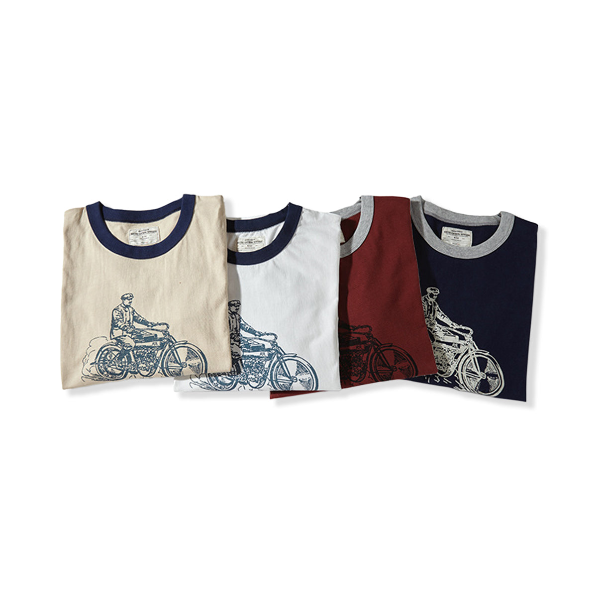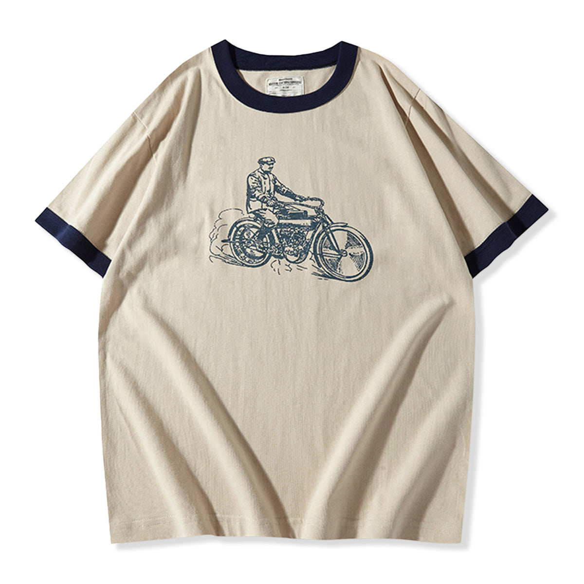 フロントに手描き風のクラシックバイクとライダー線画は、バイクの構造やライダーの服装には、20世紀初頭のレトロな雰囲気が漂います。