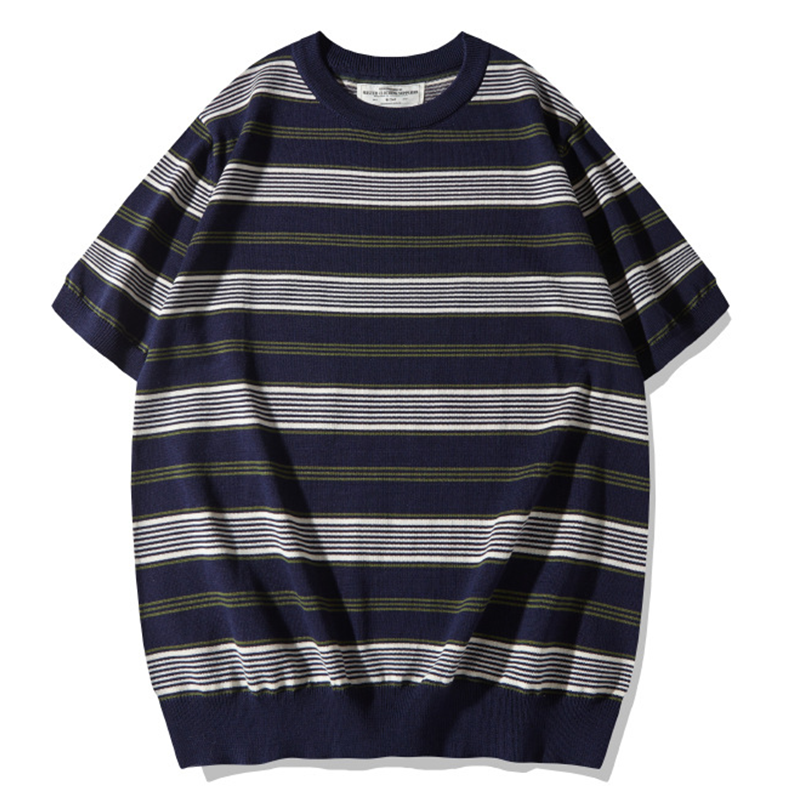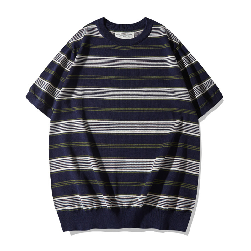 太めの糸を使った編み地で、柔らかく弾力のある手触り。通気性がありつつも適度な保温性を持つため、春から秋にかけての季節に理想的。ニット特有の伸縮性があり、動きやすさを確保。