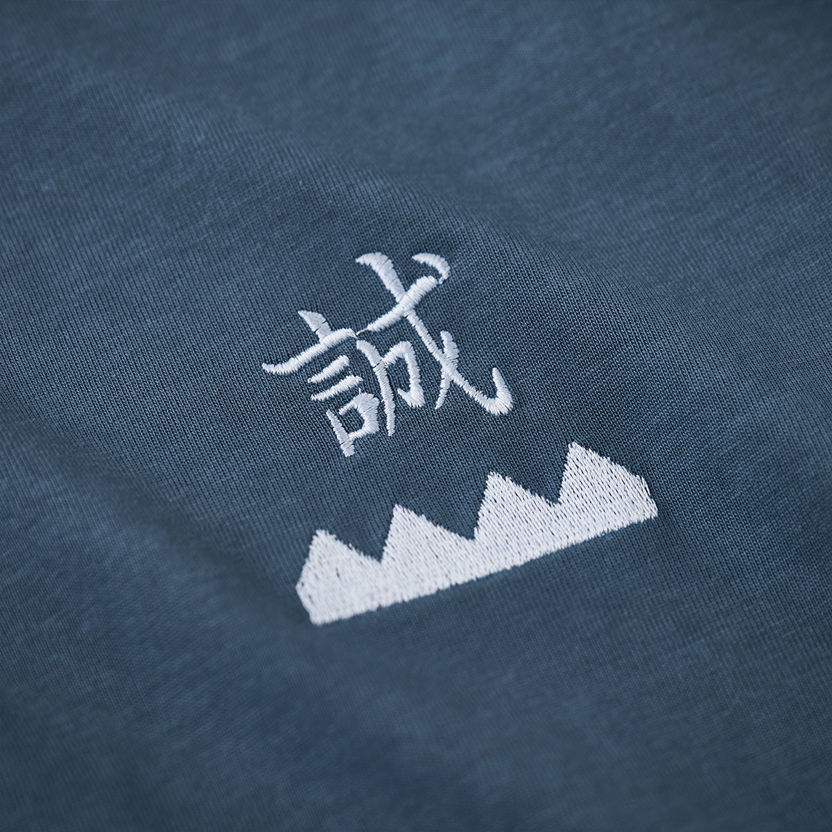 「誠」という漢字は、日本の武士道や誠実さを象徴する文字で、日本的なアイデンティティを強く感じさせます。刺繍のフォントはシンプルで、手書き風のような親しみやすさを持つもの。山を連想させる幾何学模様で、モダンアートのような洗練された印象。誠の文字の下部に配置することで、全体のバランスをとっています。
