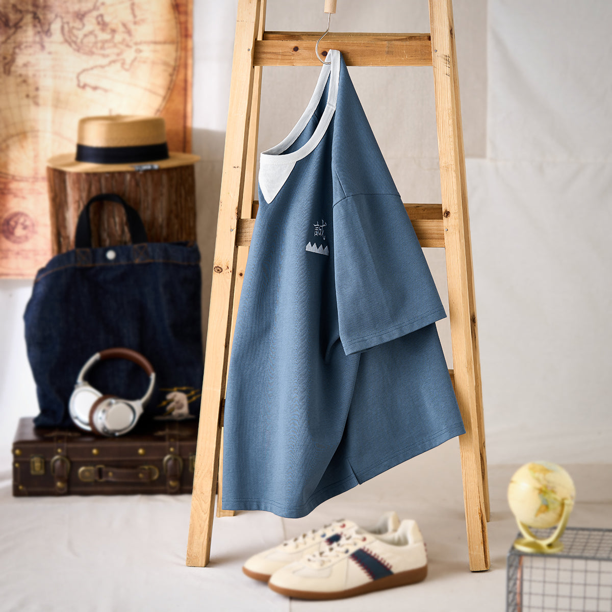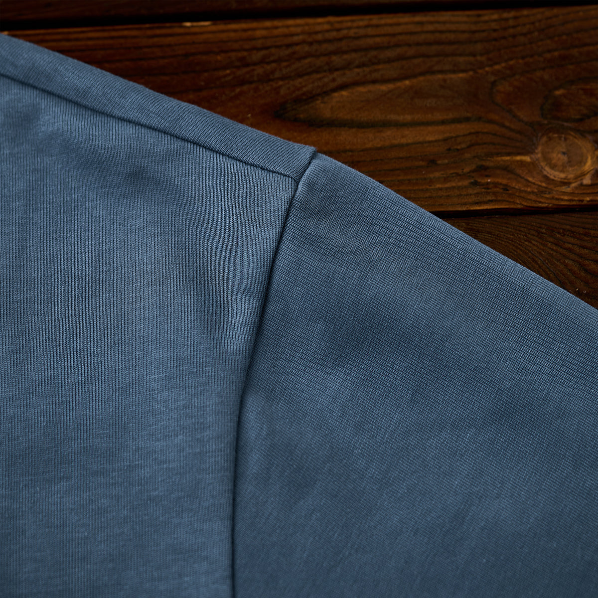 襟周りにグレーを使うことで、全体のデザインに軽快さをプラス。シンプルなブルーの中に微妙なコントラストを生み出し、視覚的なメリハリを提供。三角パッチを加えることでクラシックなデザインにモダンなひねりを加えています。