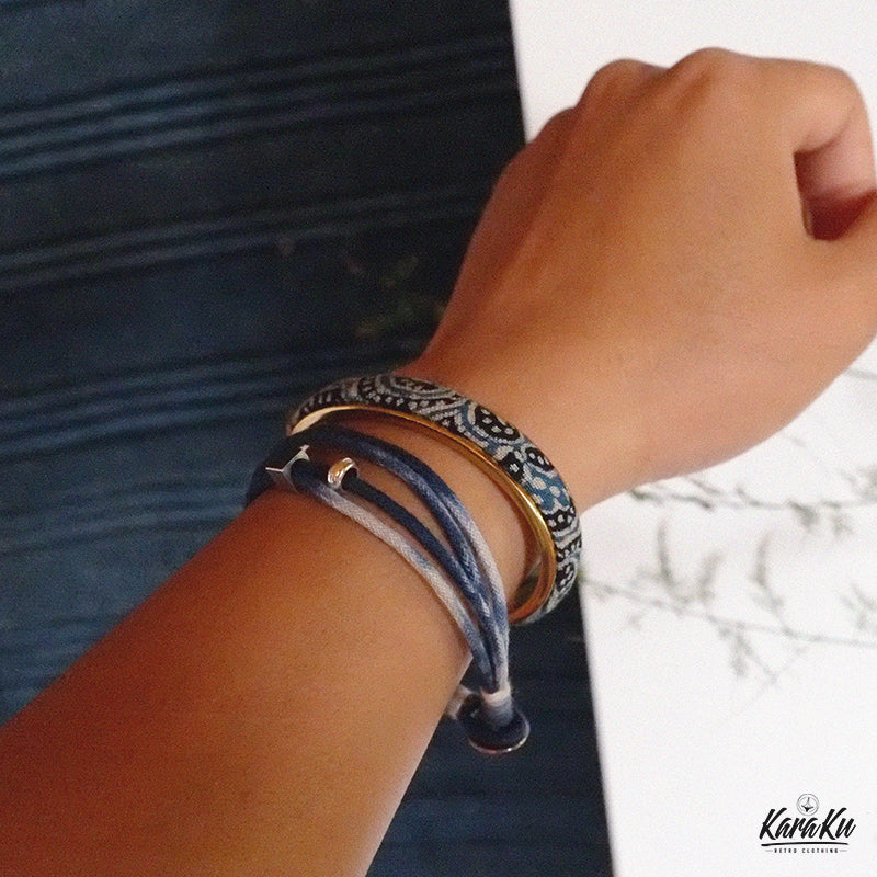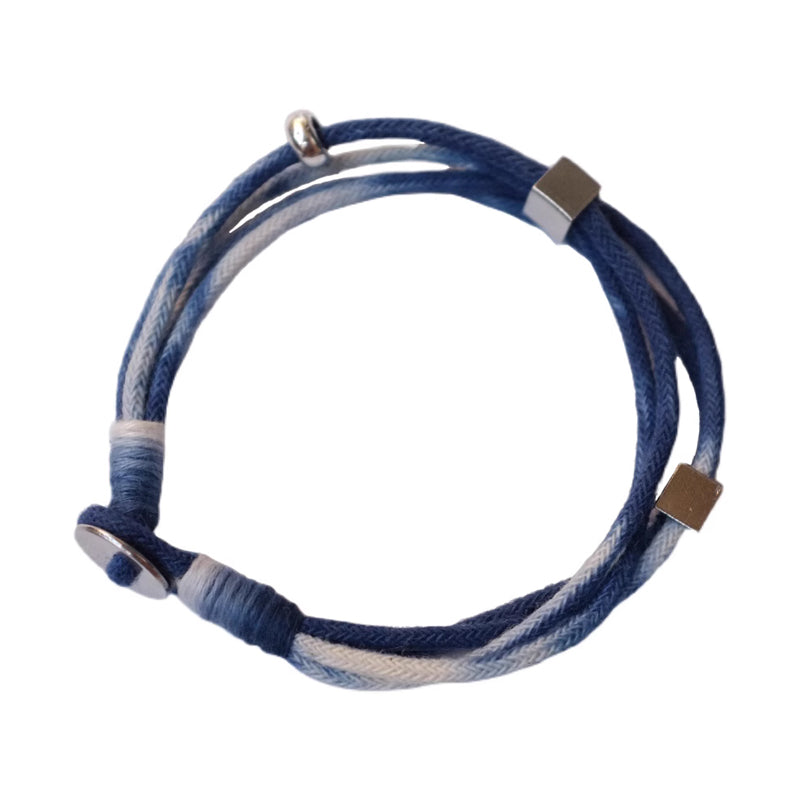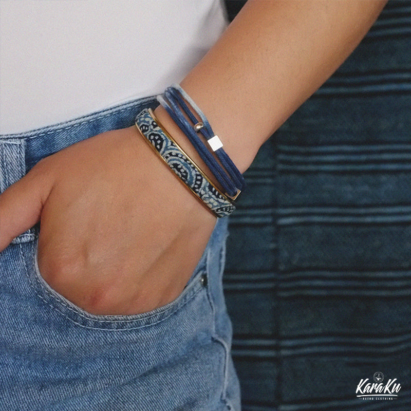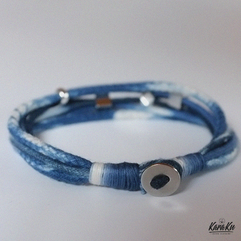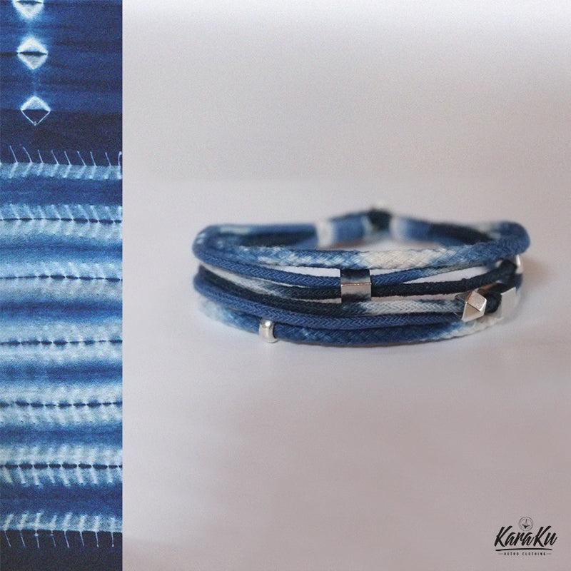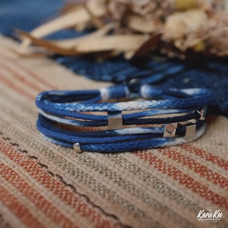 藍染のブレスレットが登場!植物藍染ならではの風合いを活かし、加えて、1本1本手作業で製作されており、ハンドメイドならではの温かみを感じられるところも魅力的、シンプルなスタイリングを引き締める役割を持っている。ブレスレットにオリジナルのビーズを加えました。小さなビーズはアクセントになります。藍染したブレスレットなので、使っていくにつれ、艶が出てきます。シルバービーズも経年変化していくので、二つの素材の変化を楽しんでください。