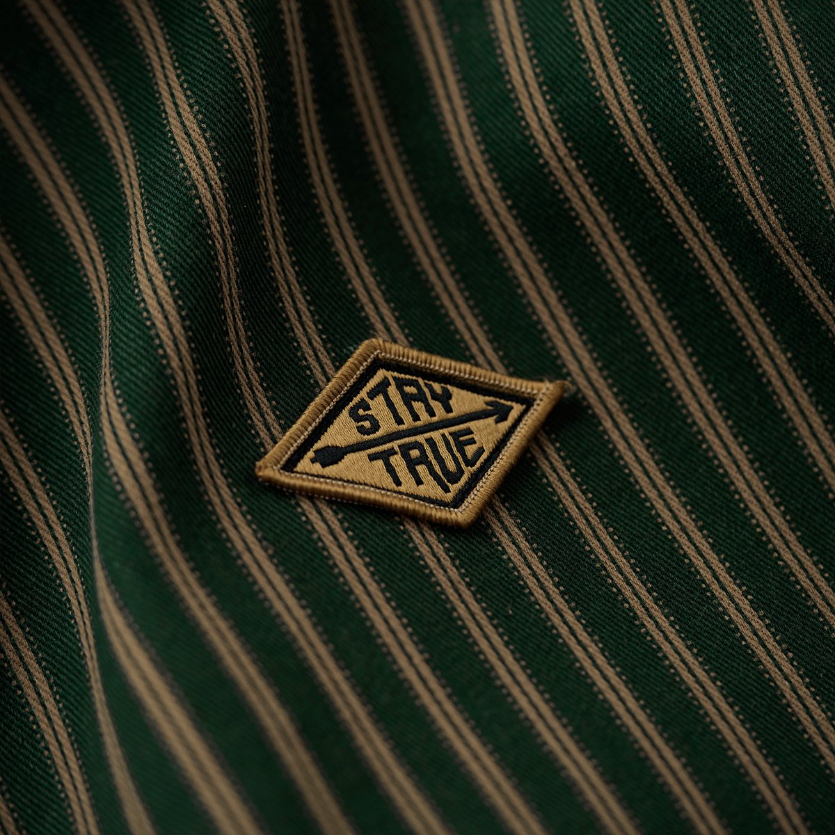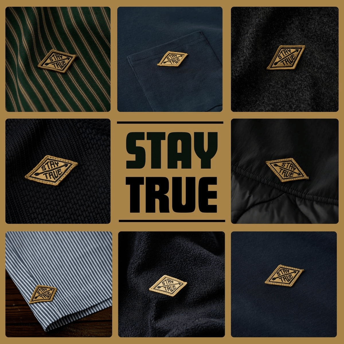 存在感を放つ「STAY TRUE」刺繍ワッペンが左胸に配置されたデザイン。