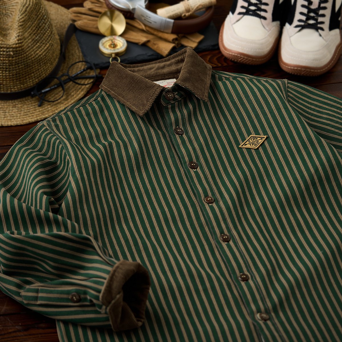 ①「STAY TRUE」刺繍ワッペン コーデュロイ切替裏フリースストライプシャツ
