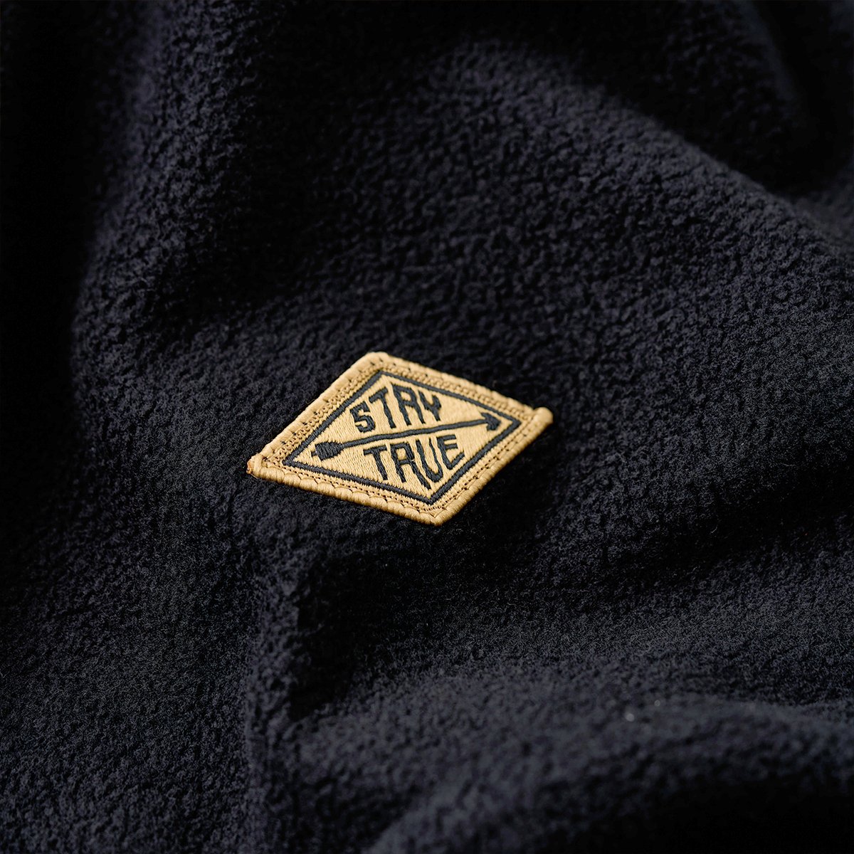 「STAY TRUE」の刺繍ワッペンが胸元にあしらわれた、