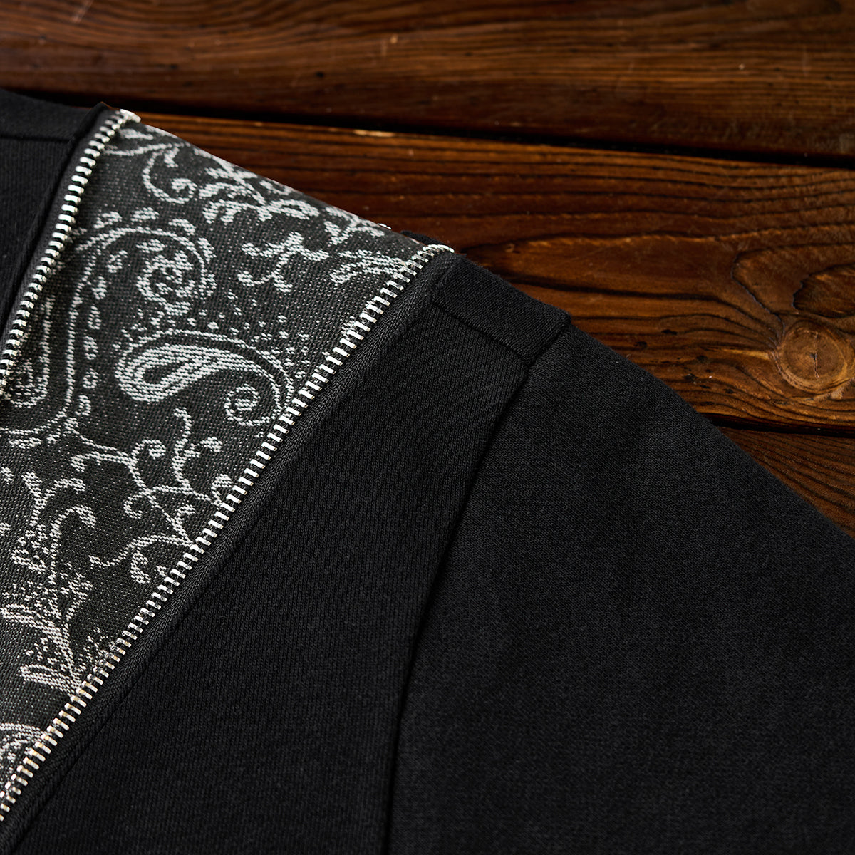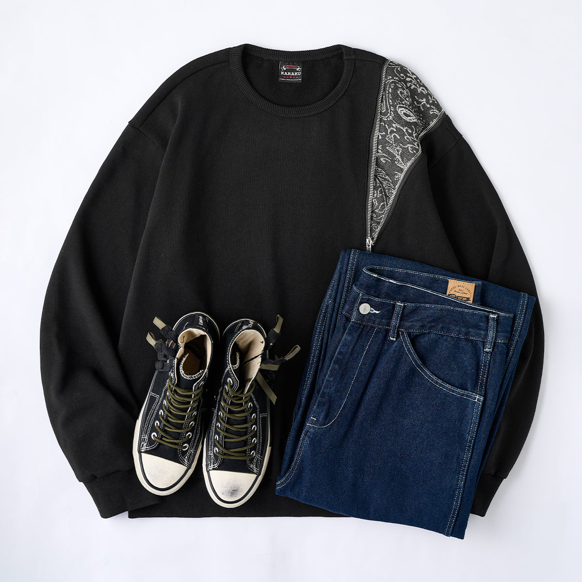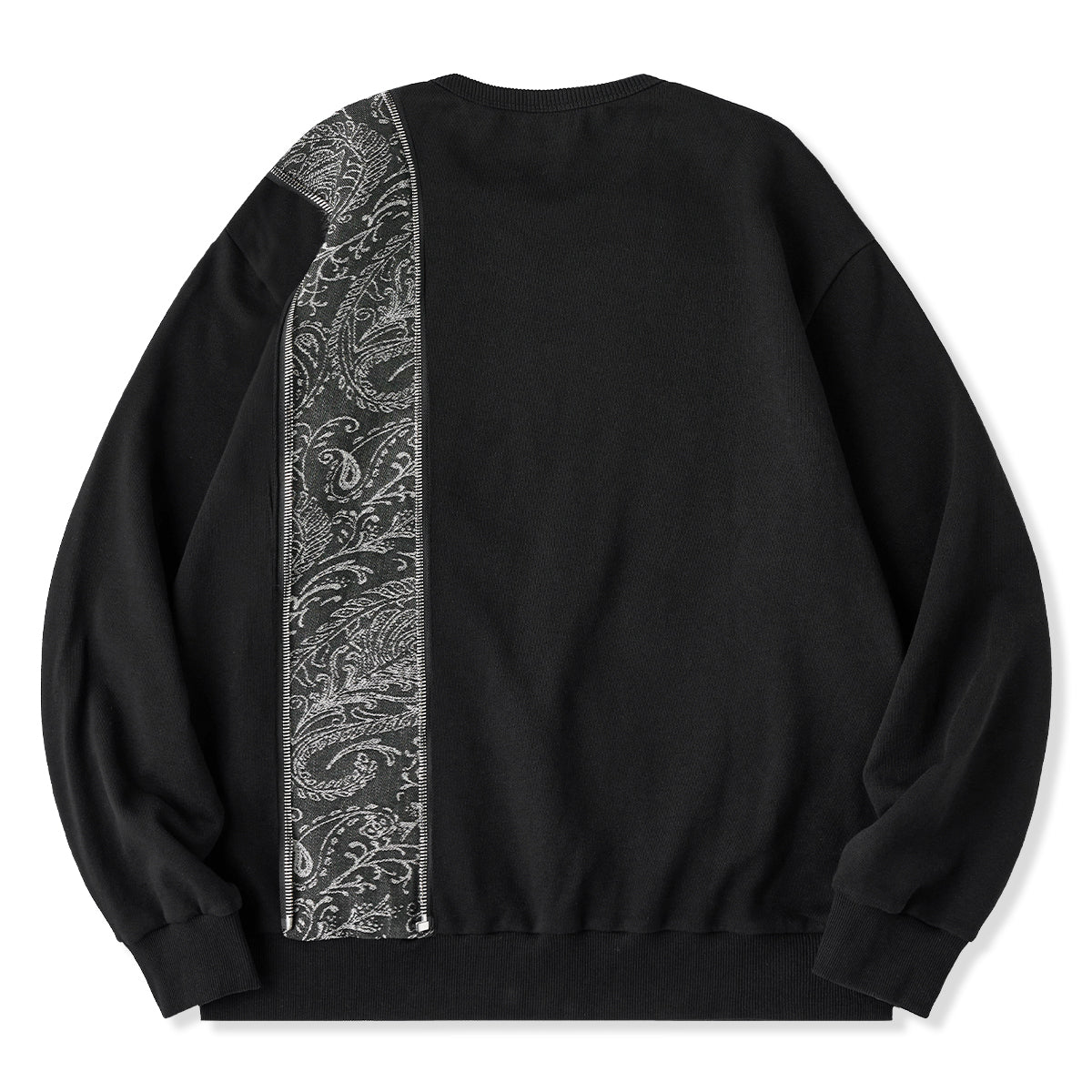 コットン素材を使用したクルーネックプルオーバースウェット。左肩からバックにかけてペイズリー柄デニムを切替え、ジップをあしらったデザインがポイント。スウェットとデニムの異素材コンビネーションがアクセントとなり、シンプルながら遊び心のある一着です。落ち着いた配色でまとめられているため、ユニークさを楽しみつつも大人のデイリーウェアとして取り入れやすく、カジュアルコーデに幅広く活躍します。