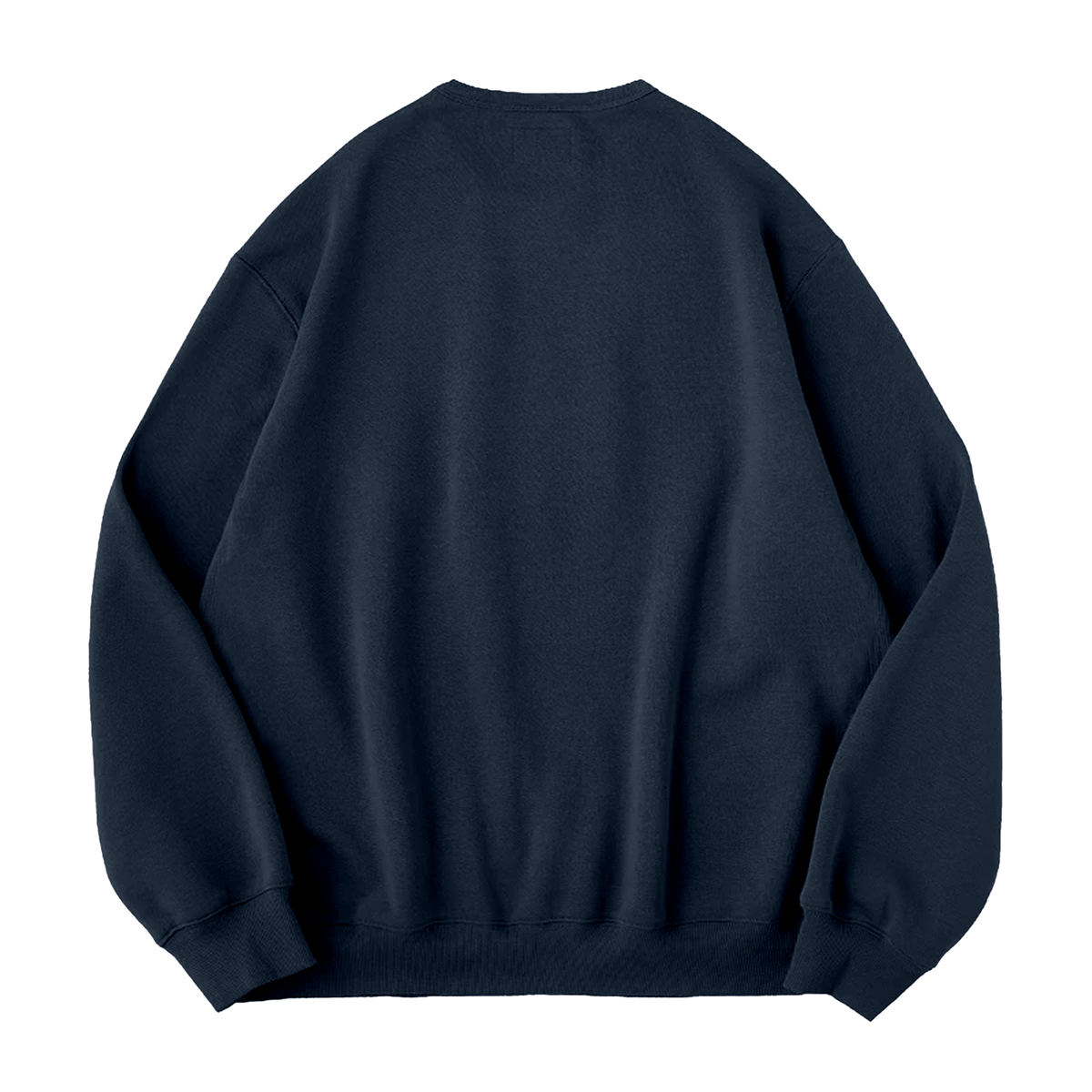 クルーネックスタイルで、リラックスしたカジュアルな印象を与えるシルエットです。背面はシンプルで装飾がなく、ミニマルなデザインを強調しています。袖口や裾はリブ編み仕様で、フィット感を高めつつカジュアルさを演出しています。