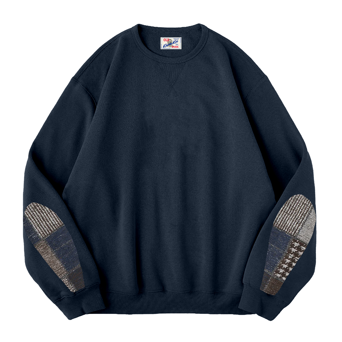 両袖の肘部分に施されたツイード素材のパッチが最大の特徴です。複数のチェック柄を組み合わせたパッチワークスタイルで、視覚的なアクセントを提供します。ネイビー基調のスウェットに対し、ツイードパッチのブラウンやグレーのトーンが調和し、全体の色合いを引き締めています。