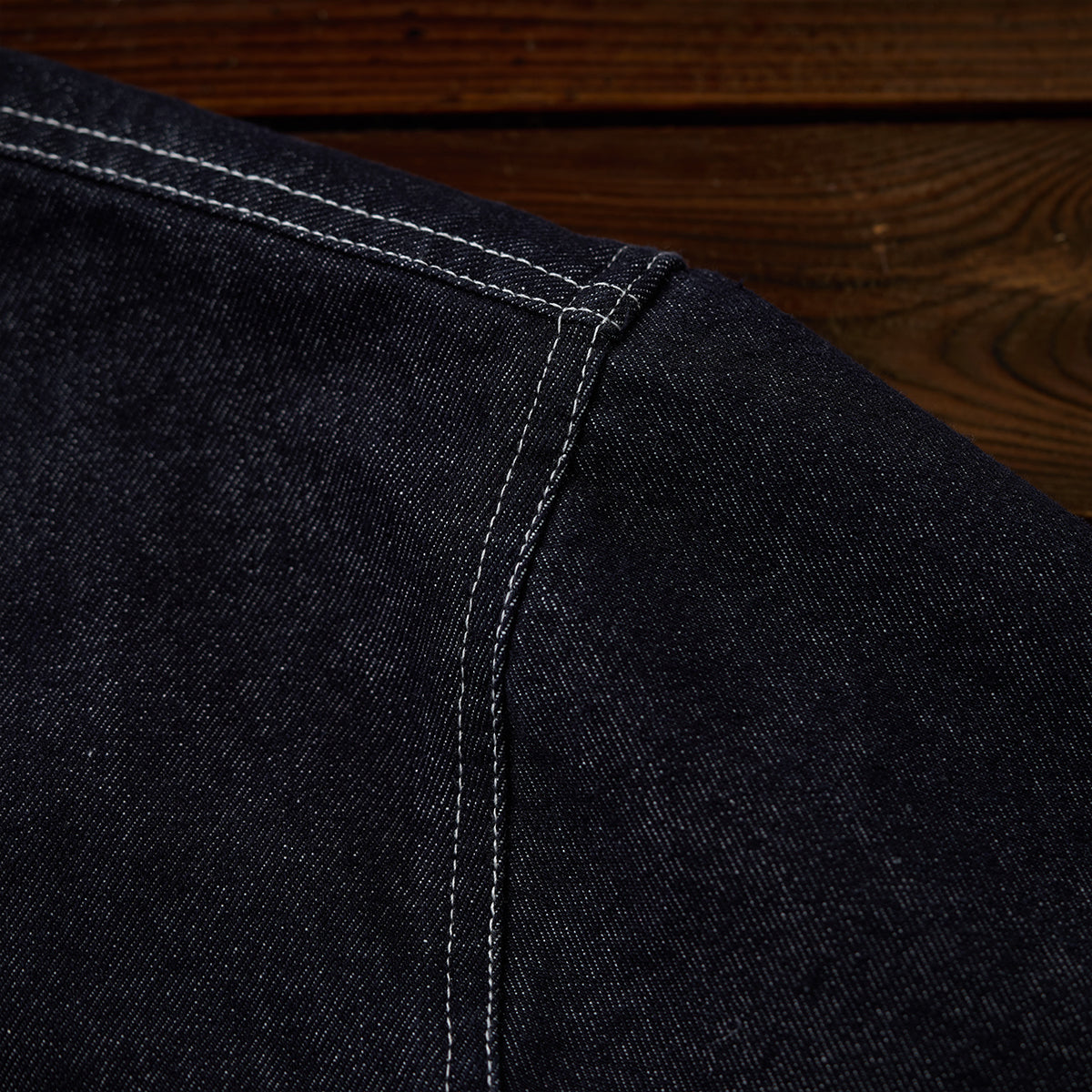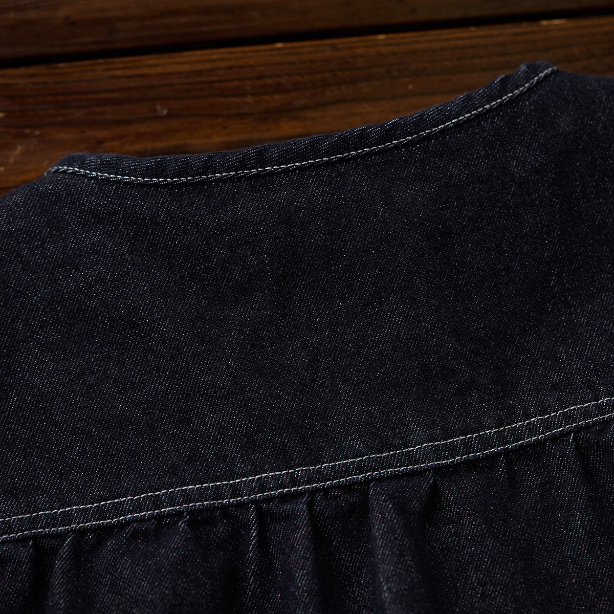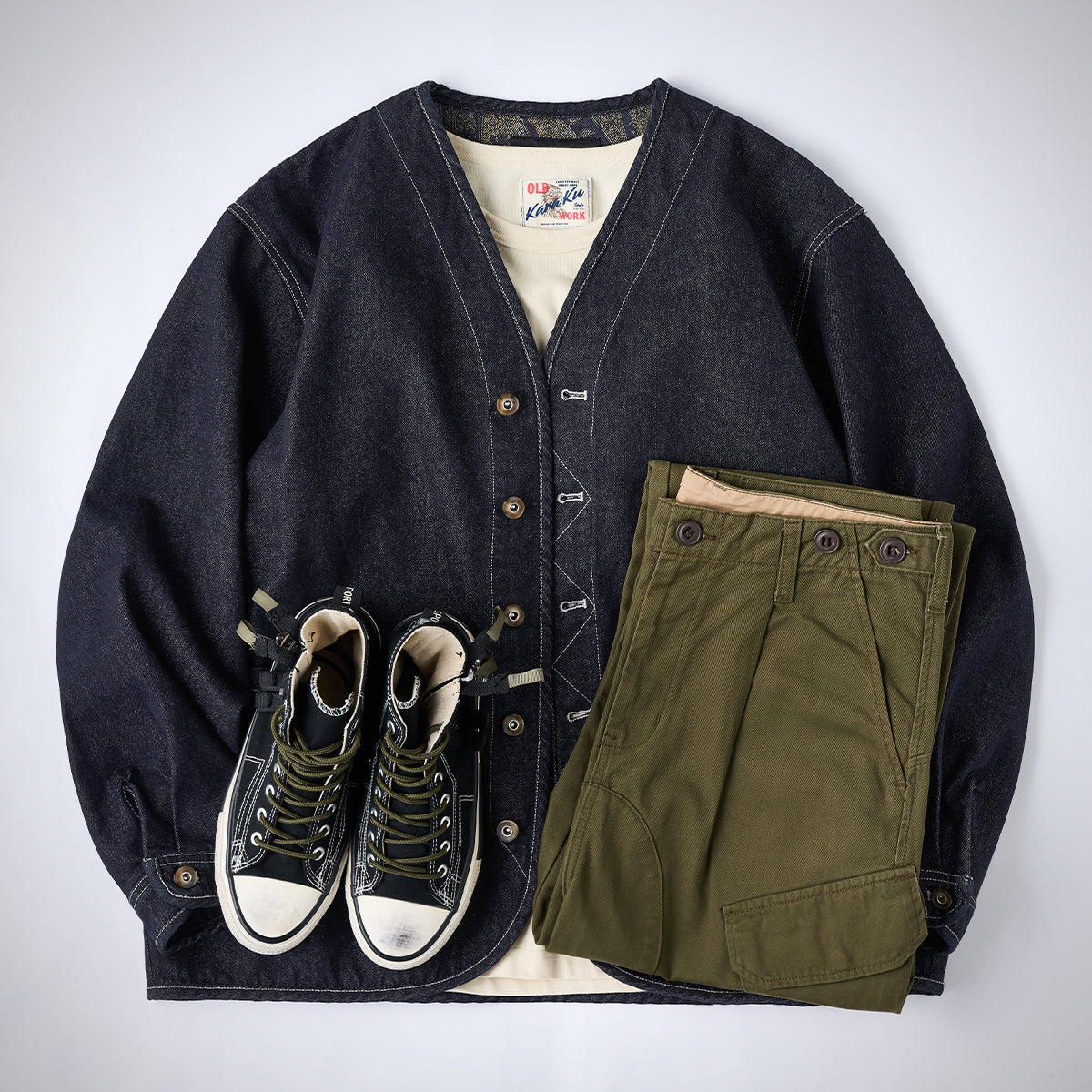 コットンデニム生地を使用し、湿気を放散しやすく速乾性に優れている、シワになりにくく扱いやすいのが特徴です。仕上げた服はウォッシュ加工されており、手触りは柔らかくて快適です。
