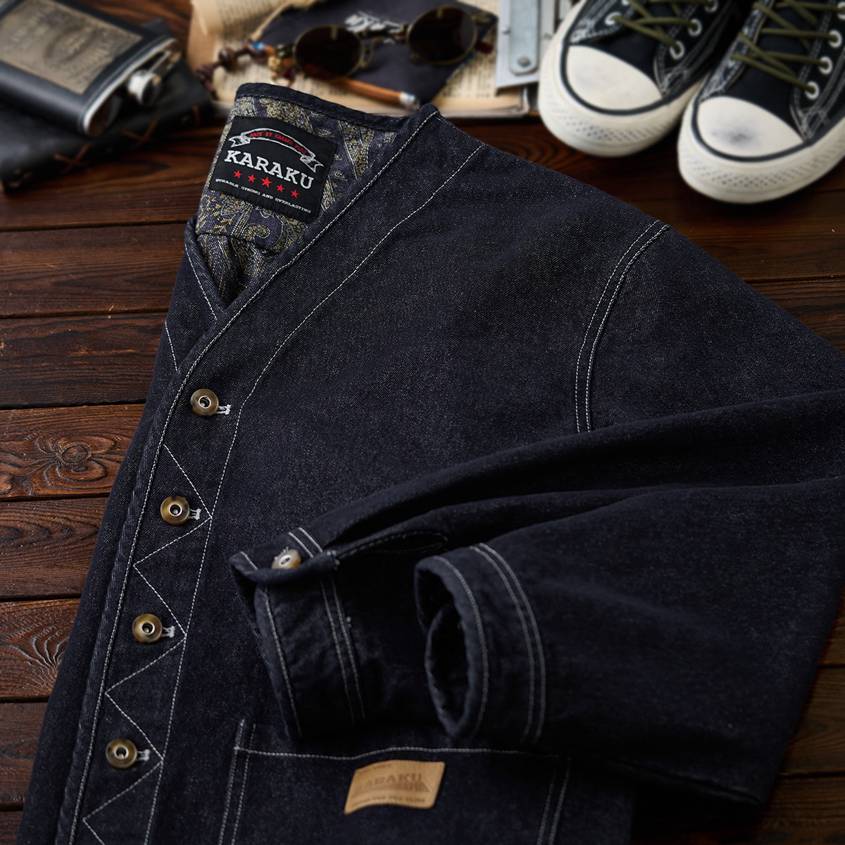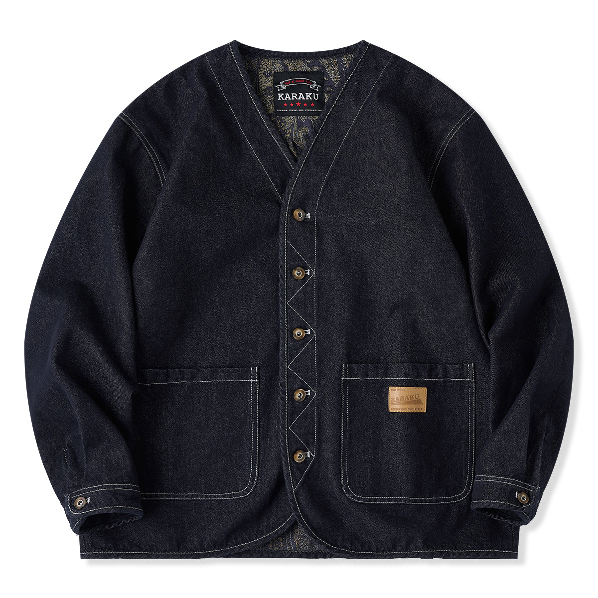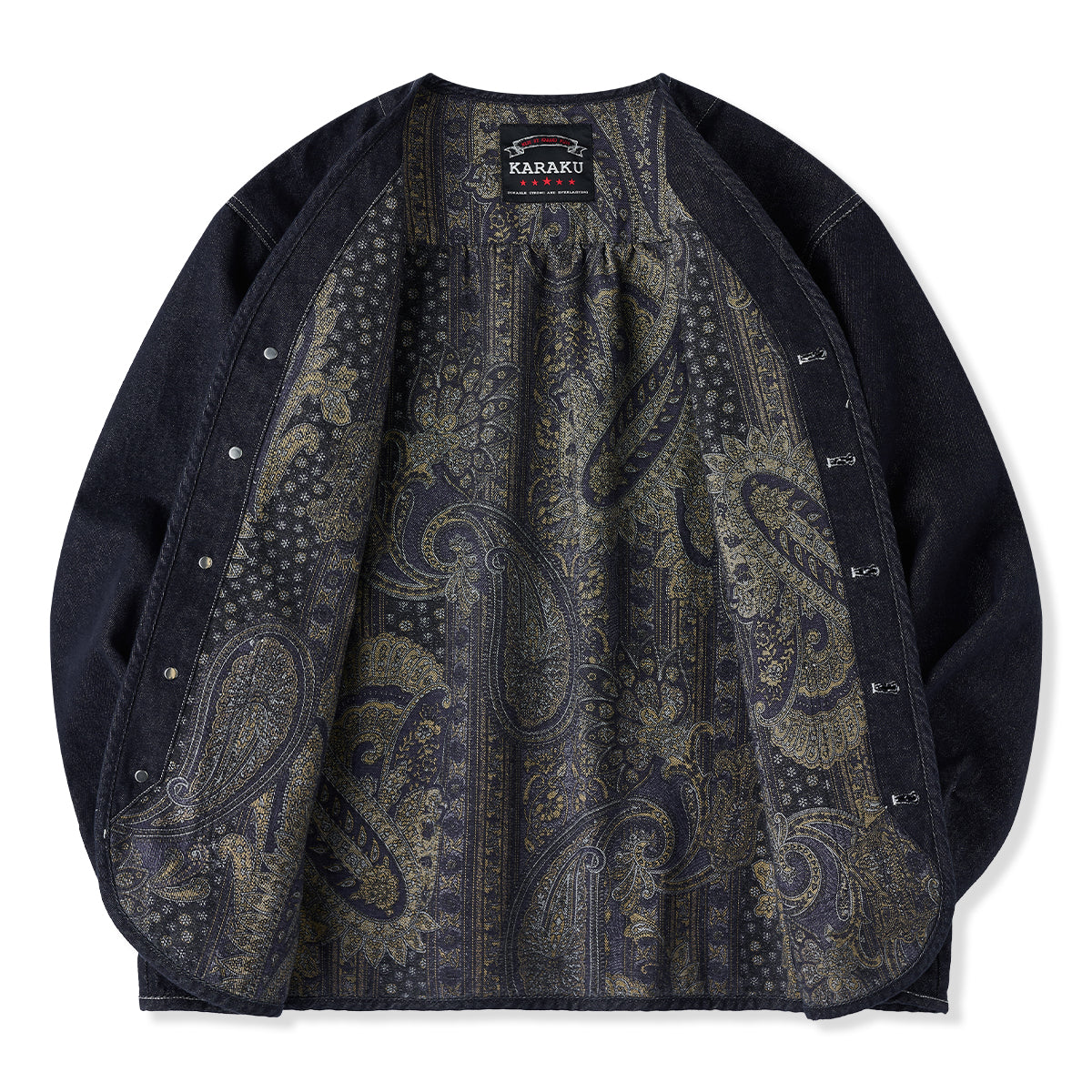 【予約】裏ペイズリー柄 ノーカラーⅤネックデニムジャケット