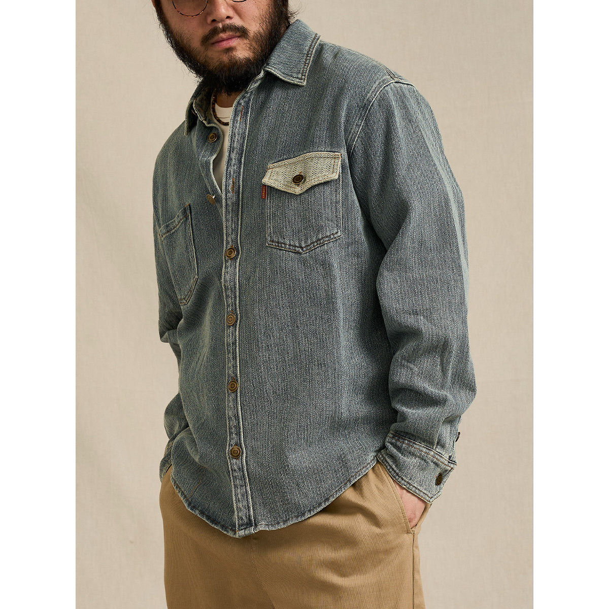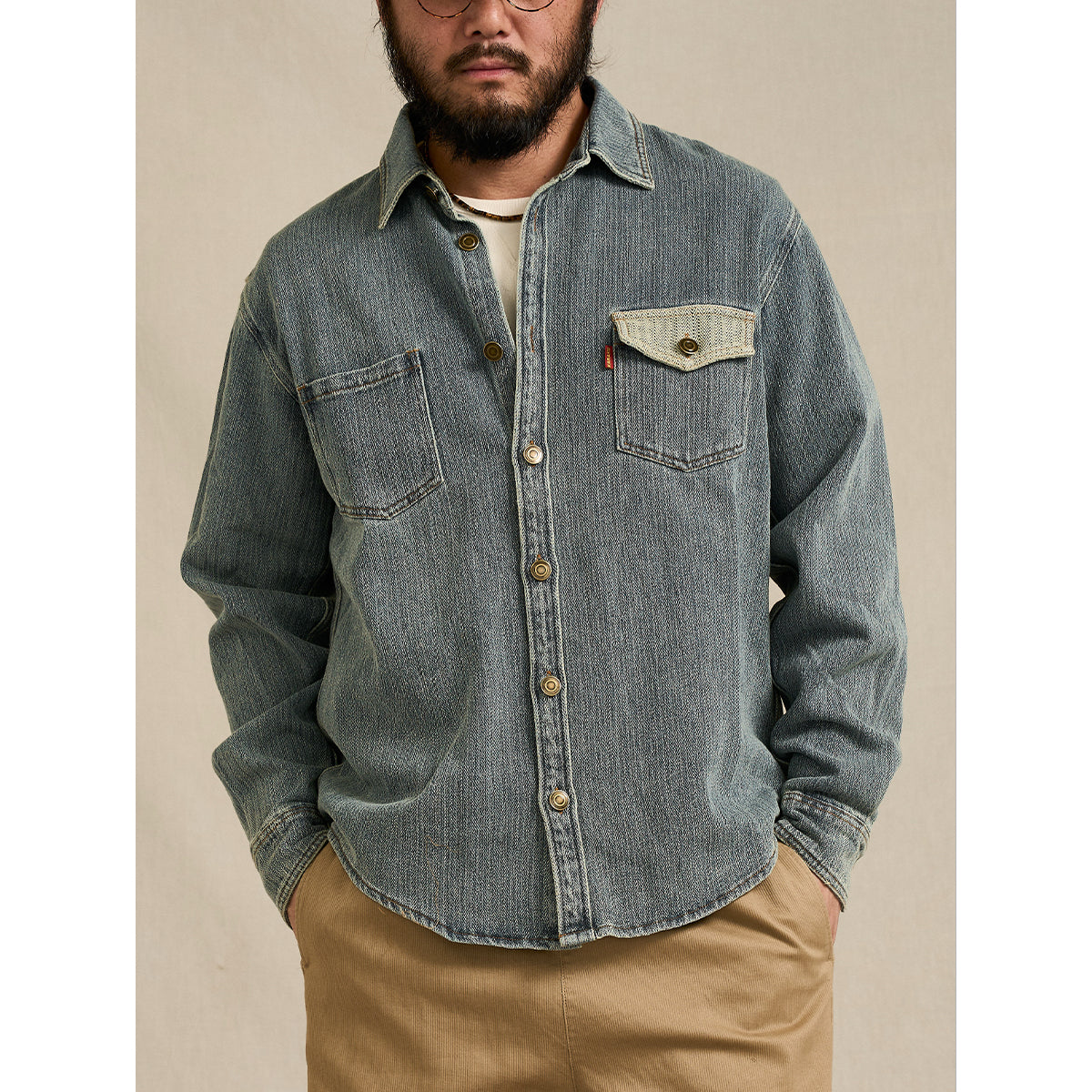 左右非対称ポケット ヘリンボーンジャガードデニムワークシャツ