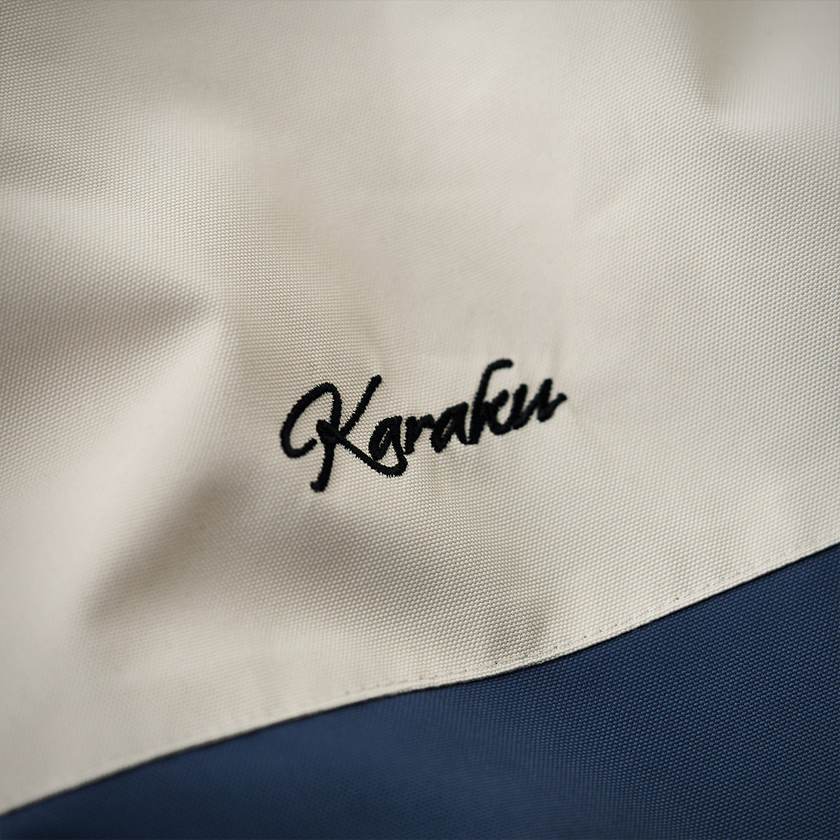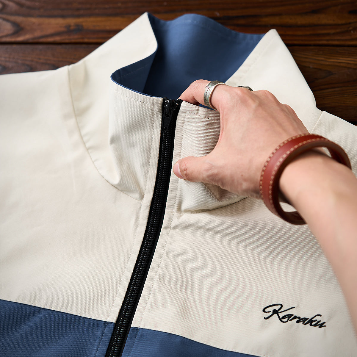 左胸部分に控えめな刺繍で「Karaku」のロゴが配置され、シンプルながらも上品な雰囲気を醸し出し、ミニマルデザインとして全体の調和を損なわないポイントになっています。