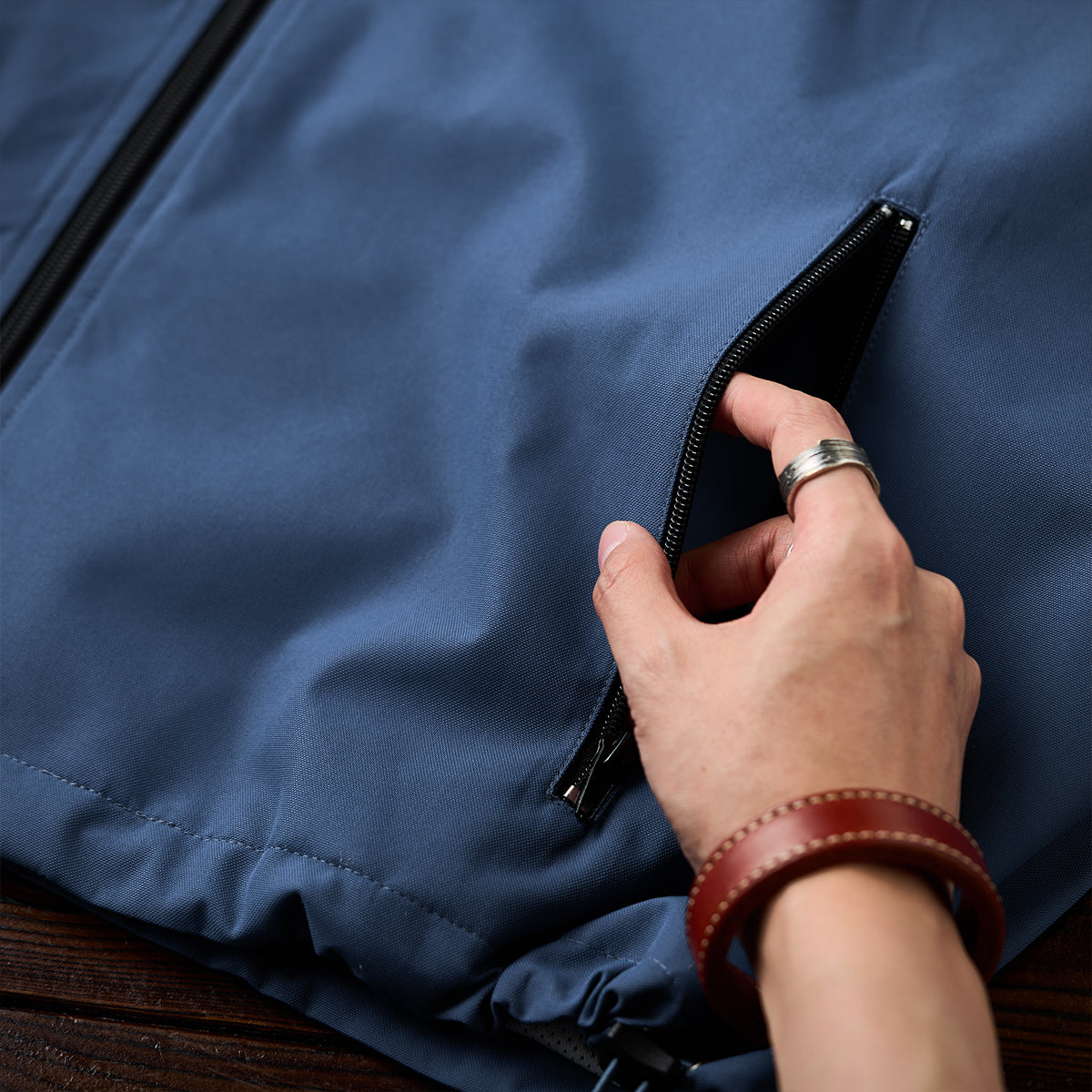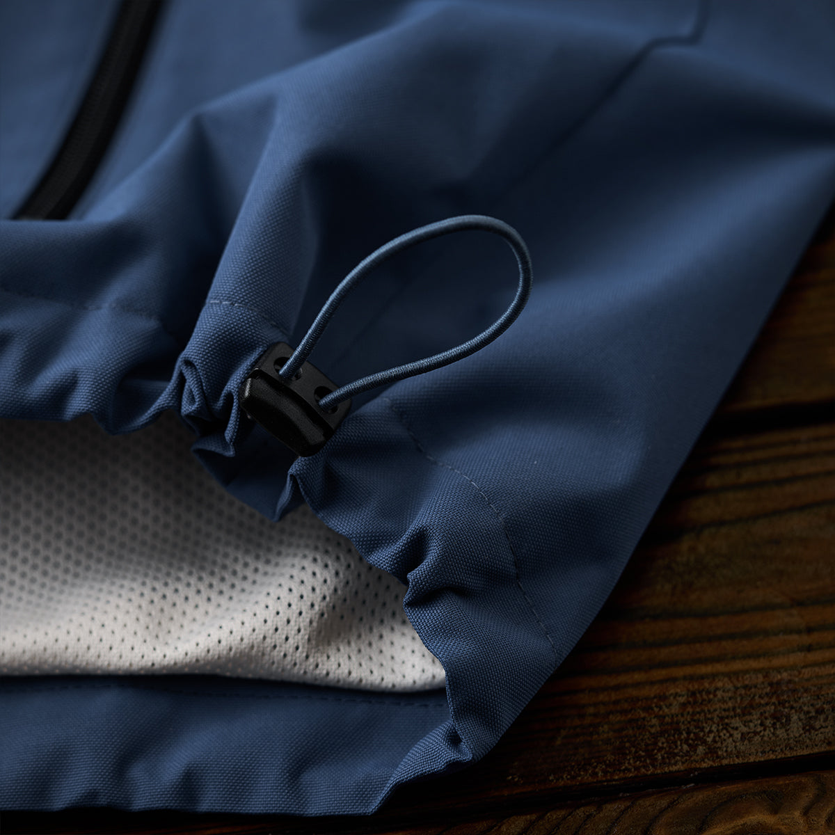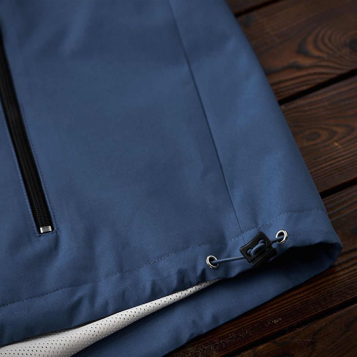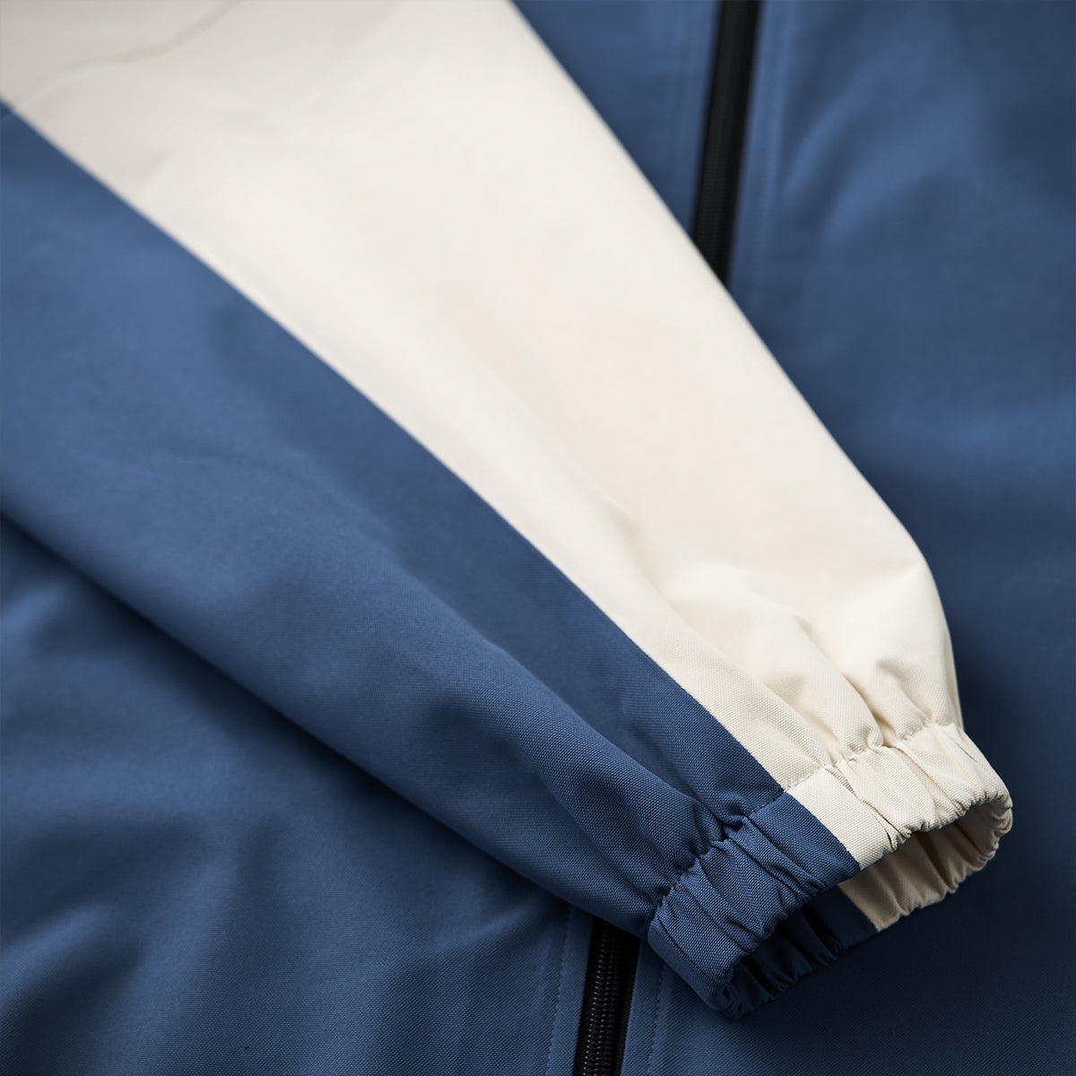 襟が立ったデザインにより、スポーティーかつモダンな印象を与えます。袖口はゴム、裾はドローコードで調節可能です。これにより、フィット感を調整でき、風の侵入を防ぐ構造になっています。