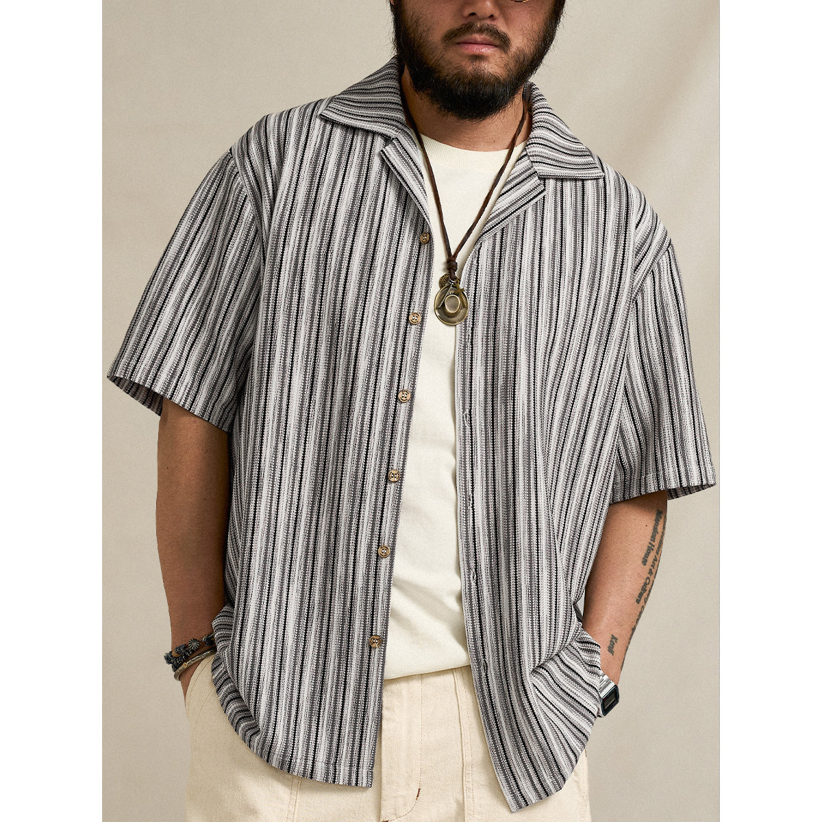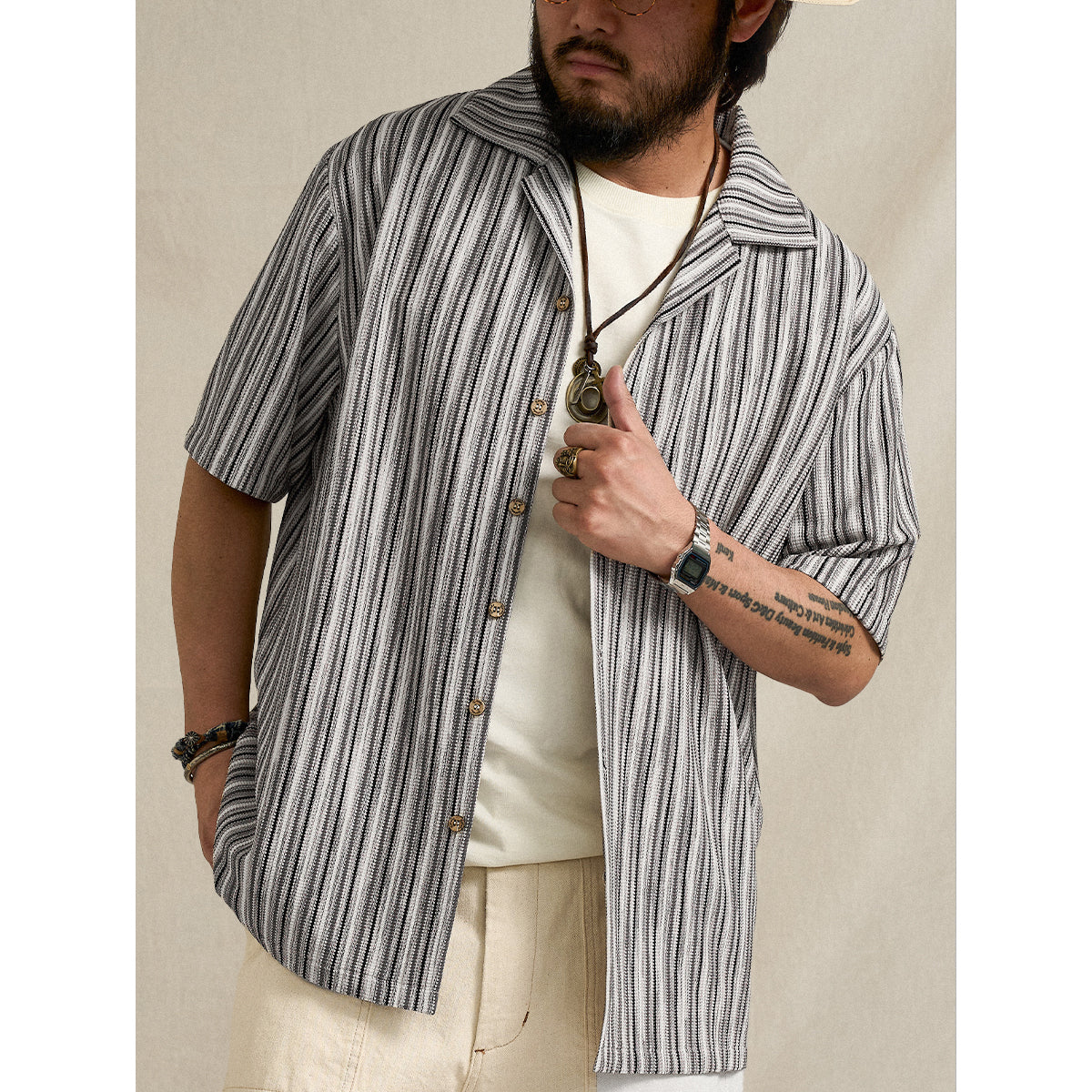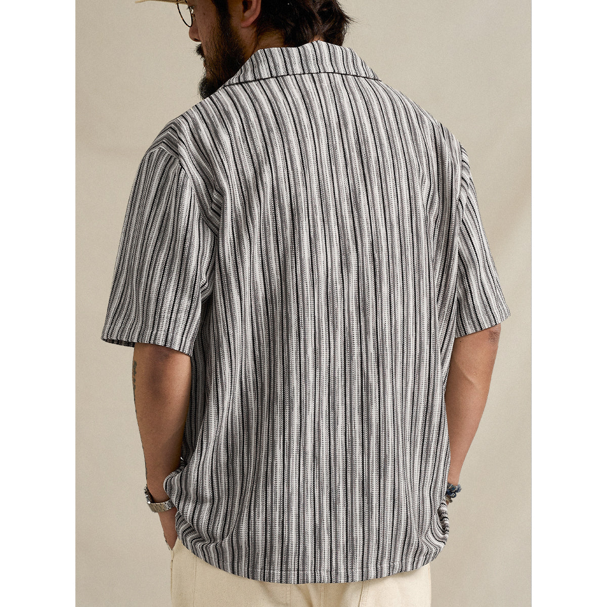 マルチストライプ柄をジャカード織りで表現した、奥行きのある表情が魅力のキューバカラー半袖シャツ。繊細な織りによって生まれる立体的なストライプが、シンプルな中にも上品な存在感を演出し、クラシックとモダンが融合した一着に仕上げました。襟元はリラックス感のあるキューバカラー仕様で、程よく抜け感のある大人のサマースタイルを演出。軽やかな半袖デザインとゆとりのあるシルエットが、暑い季節でも快適な着心地を実現します。一枚で着るだけでスタイリングが決まり、デニムやチノパン、ショーツとも相性抜群。リゾートからタウンユースまで幅広く活躍する、汎用性の高いデザインシャツです。