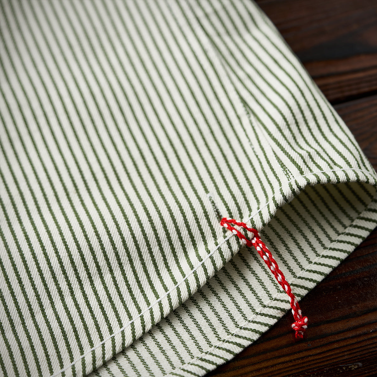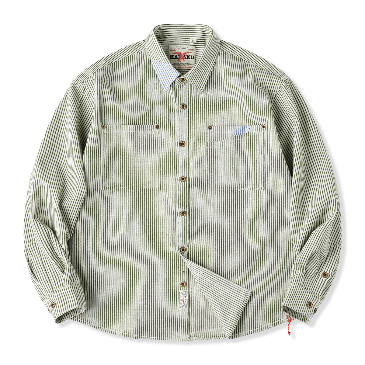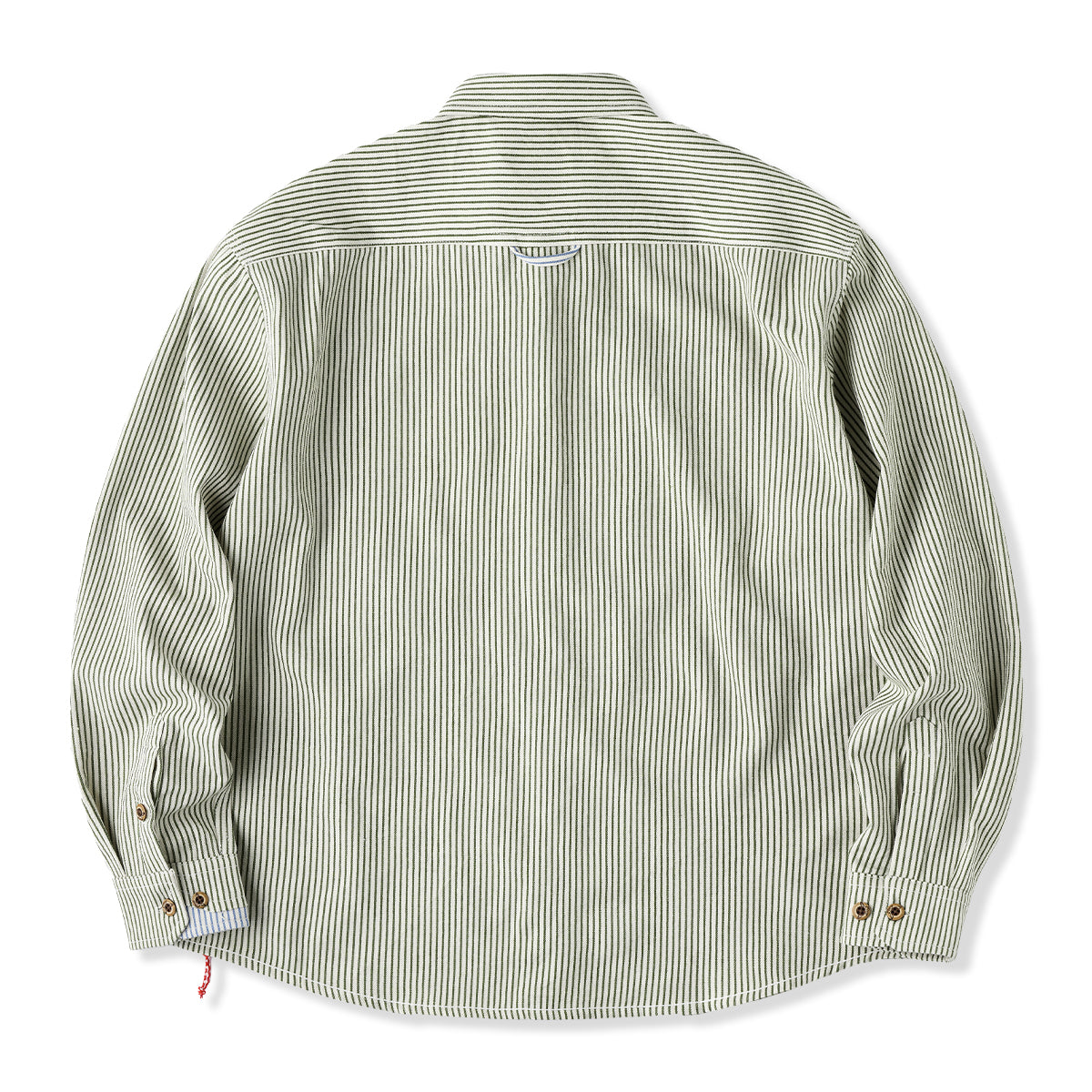 紅白ヒモ付き 襟・袖口・ポケット配色切替 先染めストライプワークシャツ