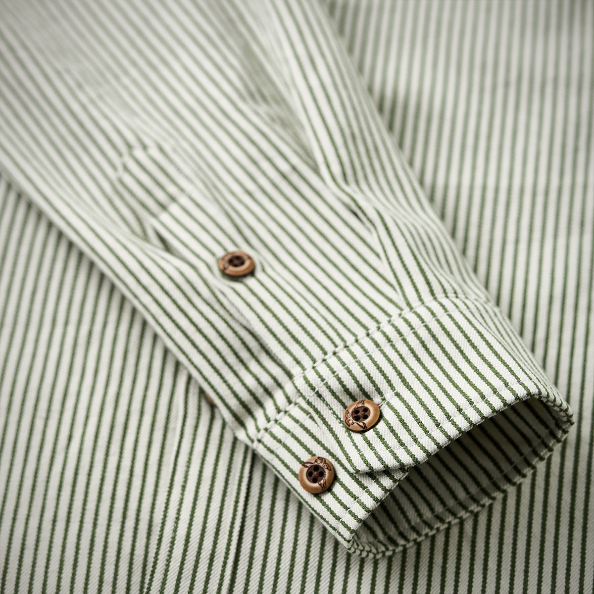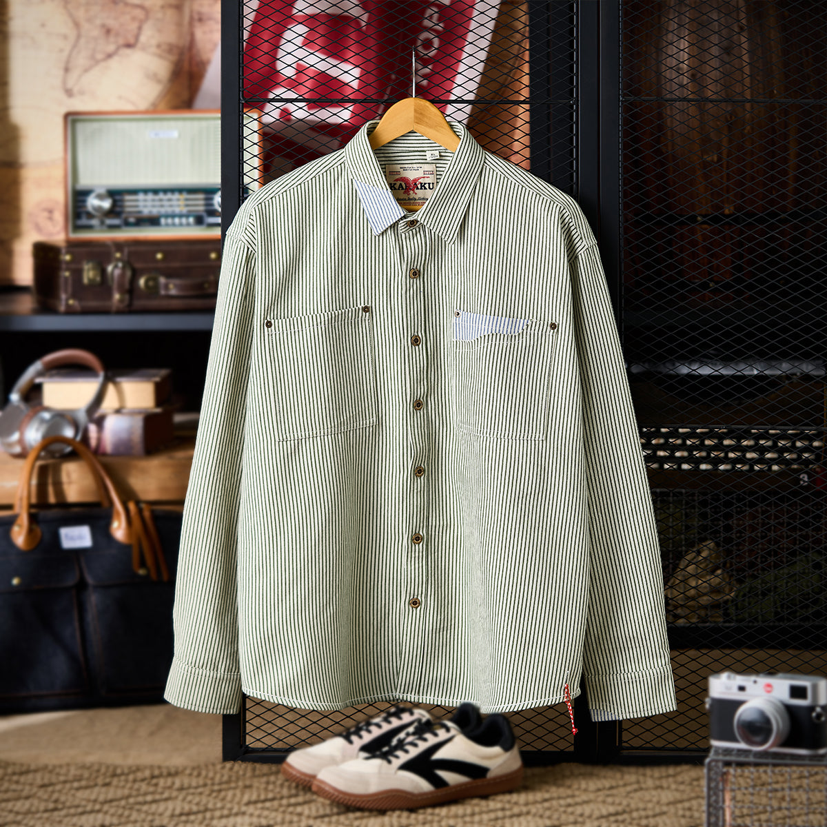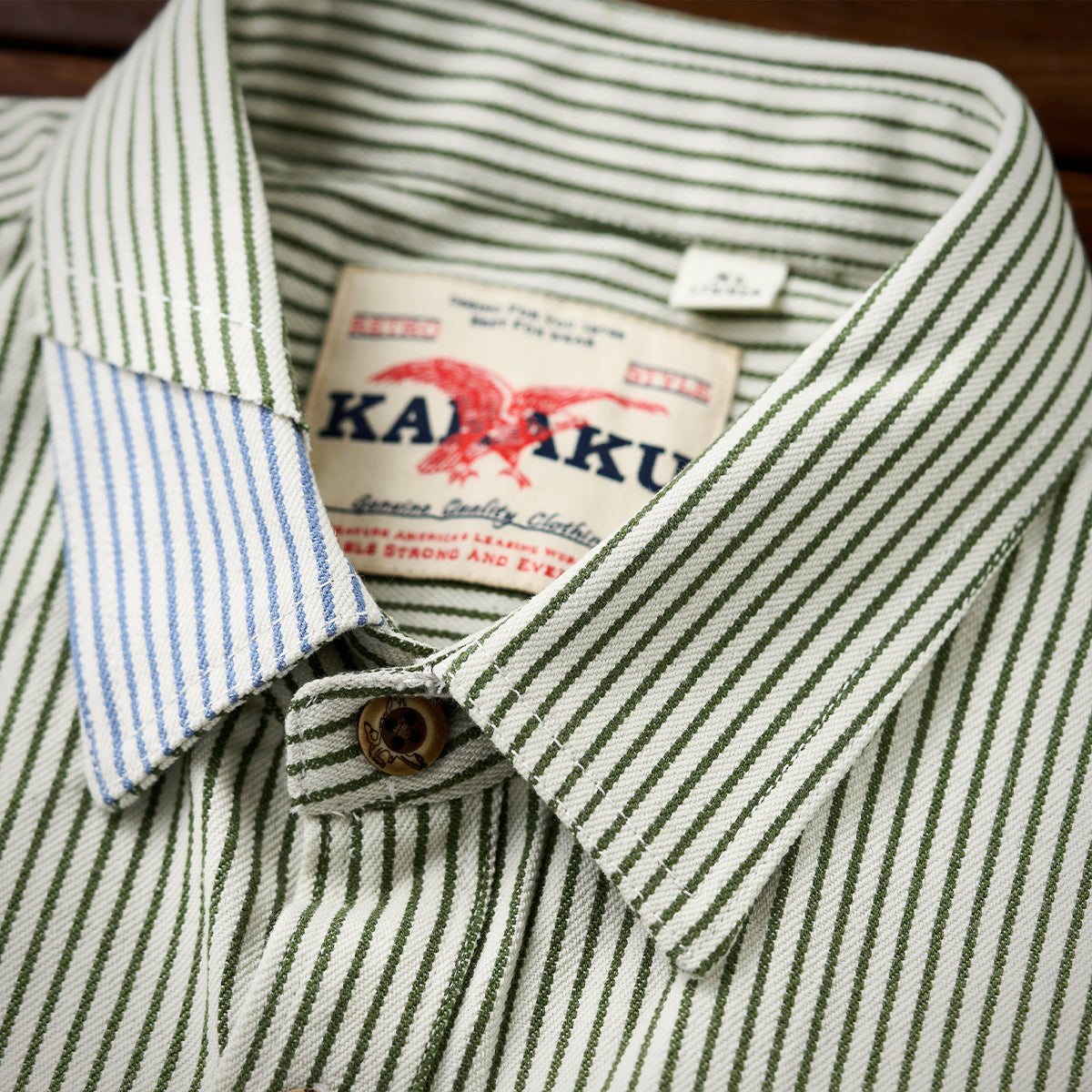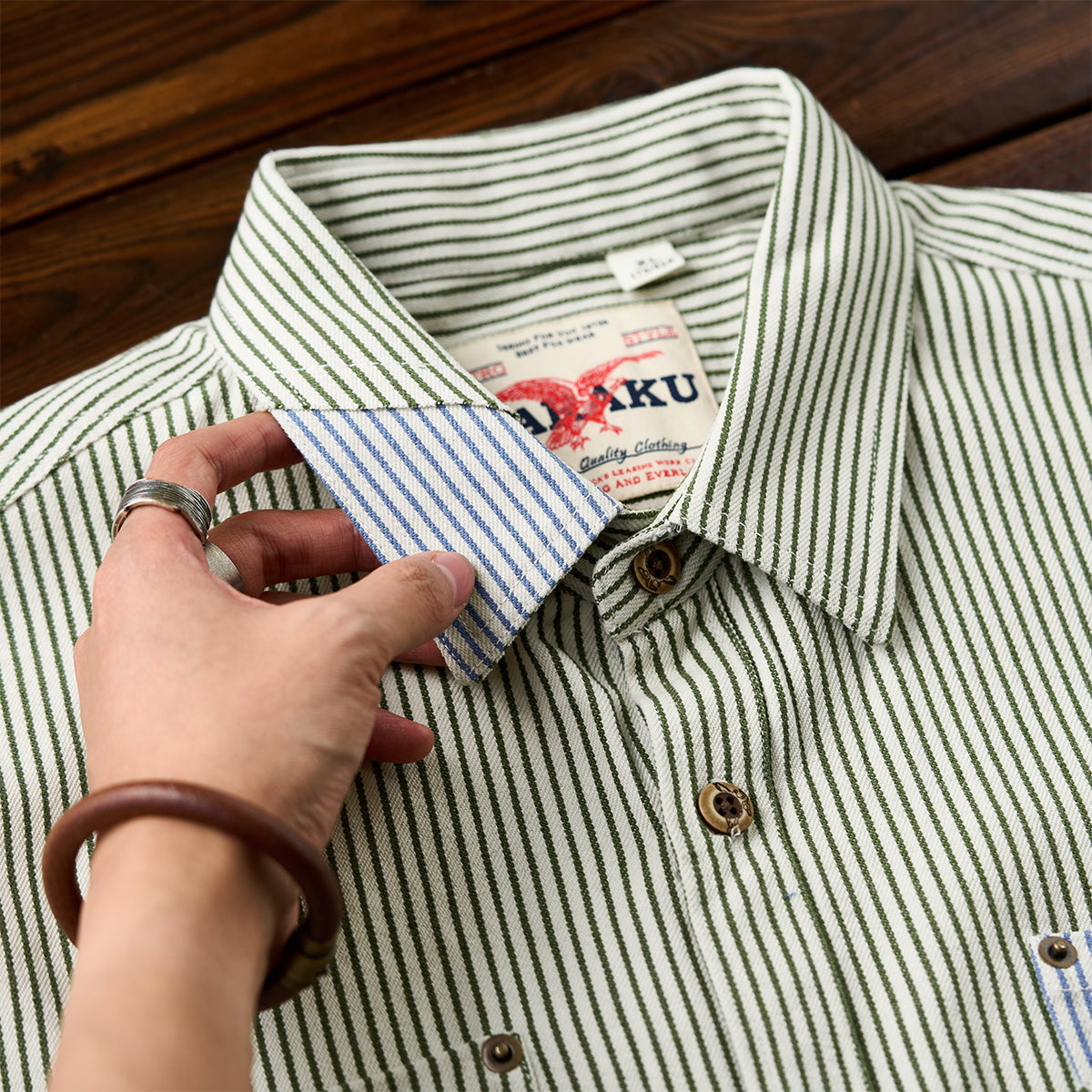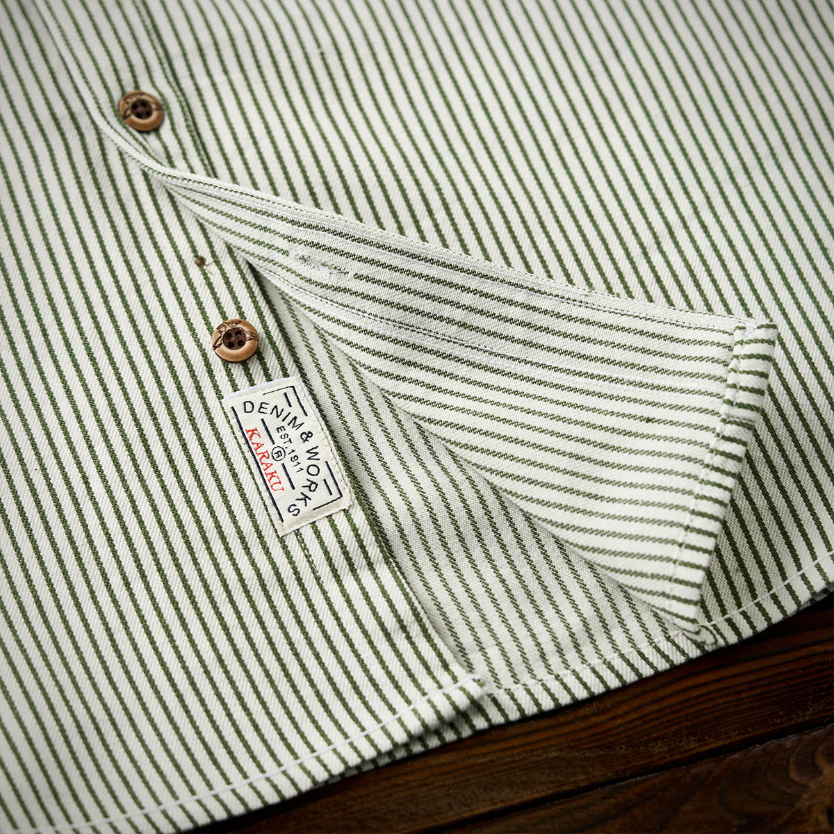 左右に胸ポケットが配されており、機能性を重視したワークシャツらしいデザインです。丈夫そうな木目調のボタンが使われており、ヴィンテージ感を演出しています。