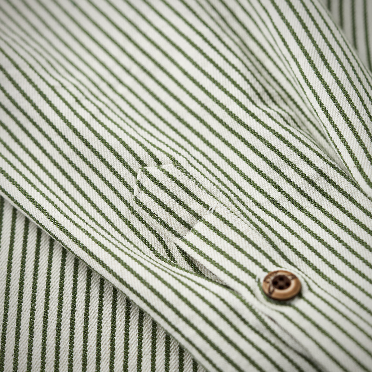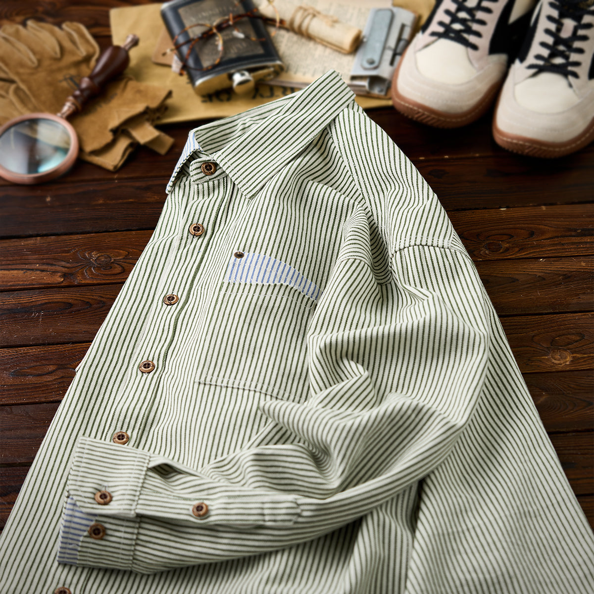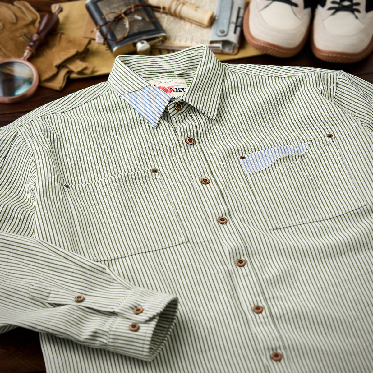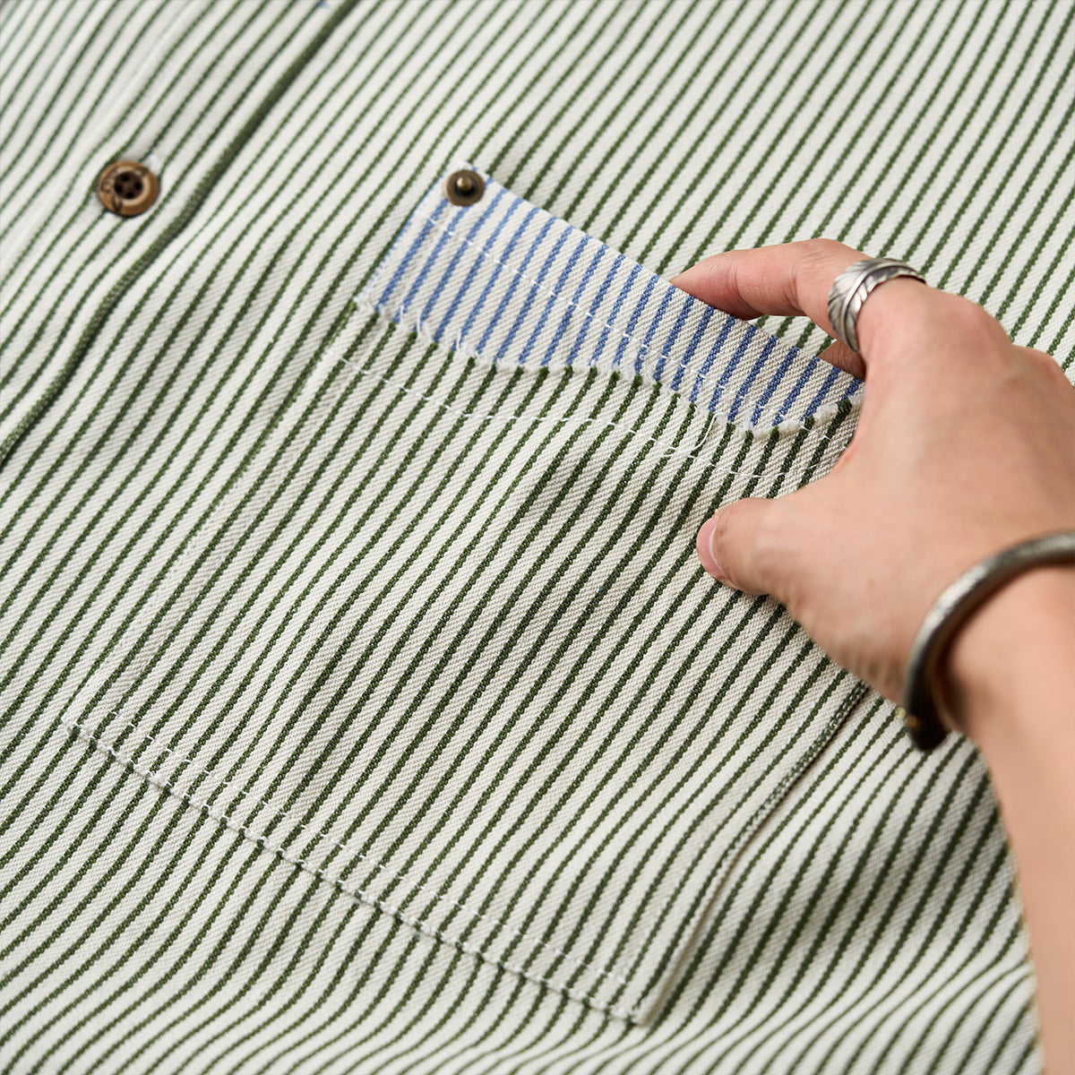 全体的に細いストライプ柄が採用されており、クラシックかつ控えめな印象を与えます。襟、ポケット、袖口部分に異なるブルーストライプが使用されており、特に目を引くデザイン要素となっています。