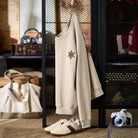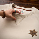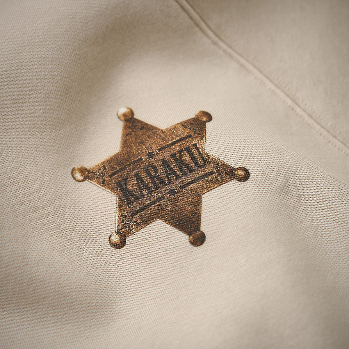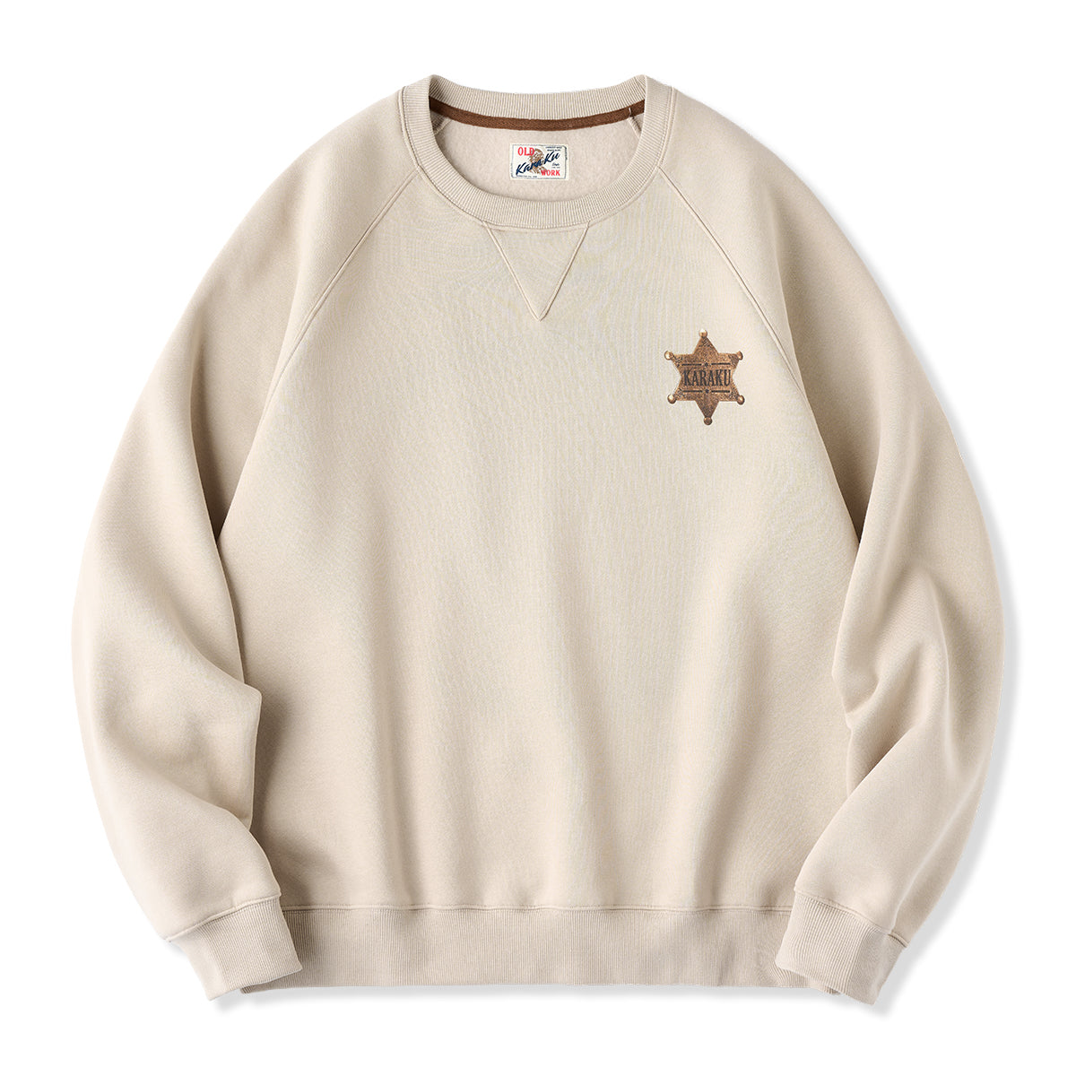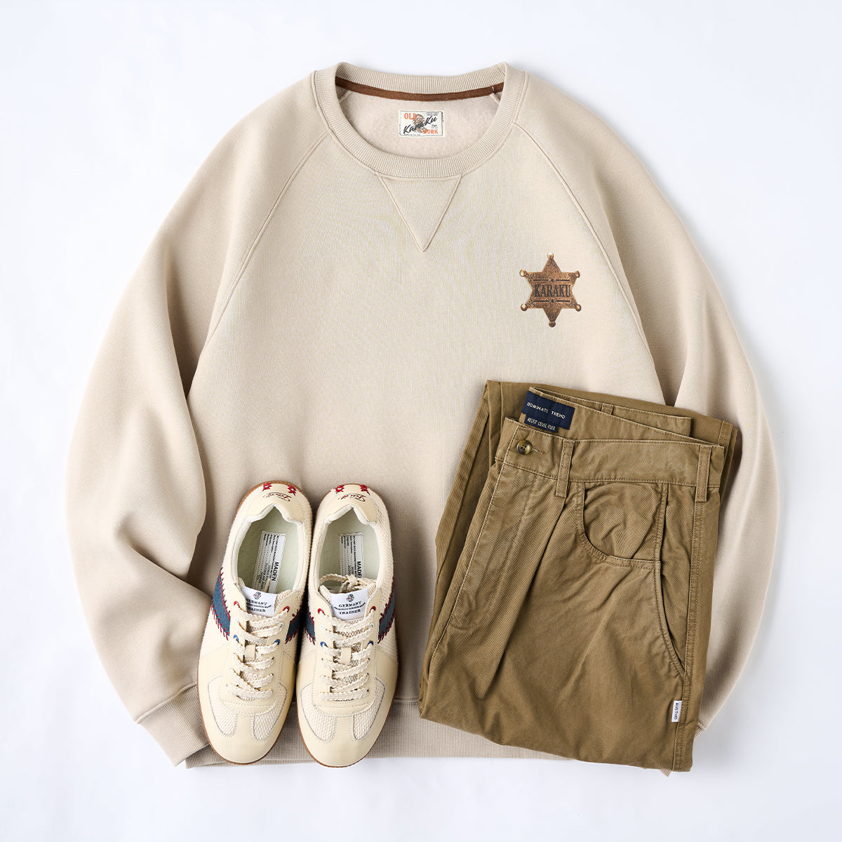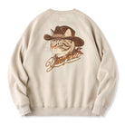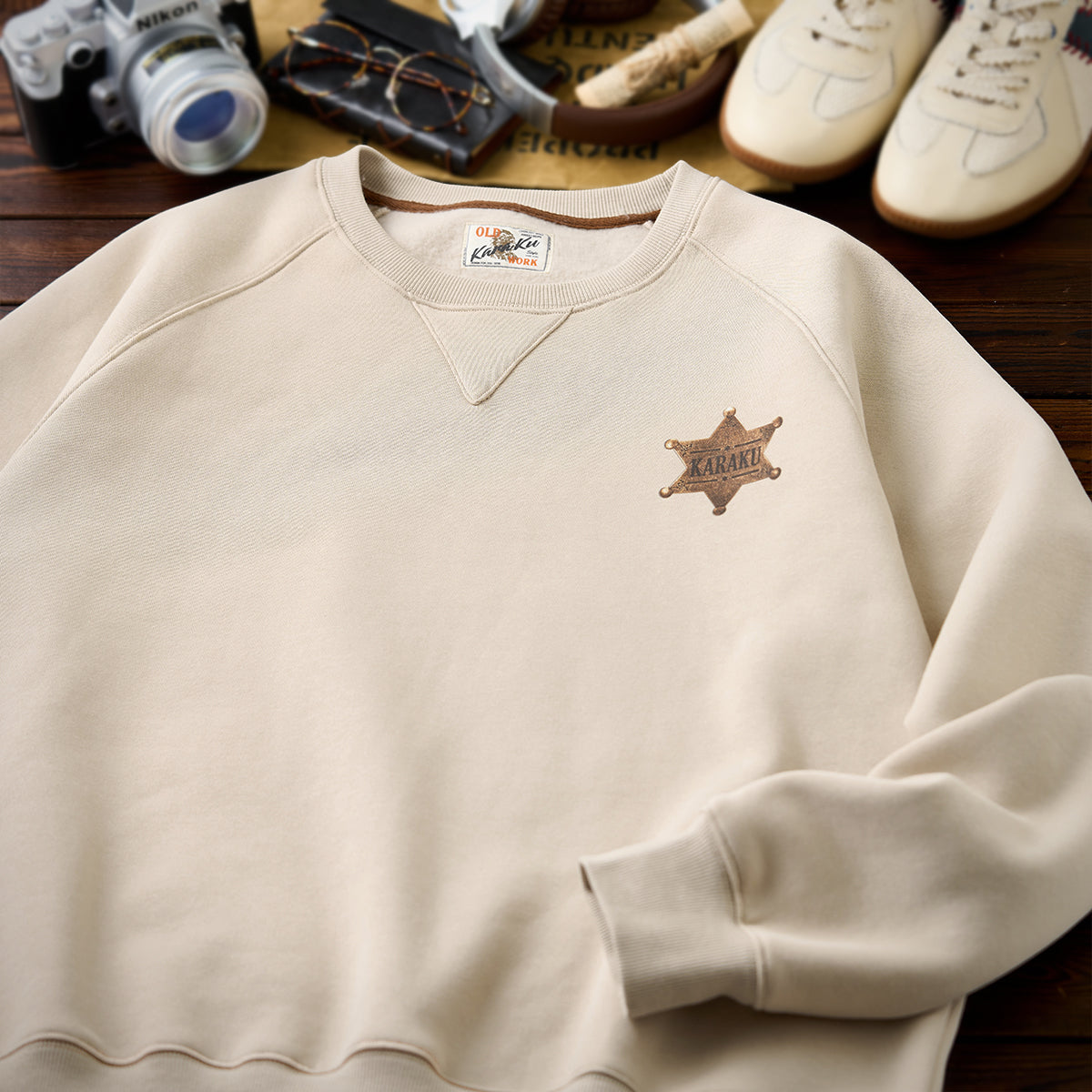 どこかワイルドでユーモラスな雰囲気漂う、ウエスタンハットをかぶったカウボーイ猫のバックプリントが印象的な裏起毛スウェット。猫の下にはループ模様で描かれた「yeehaw」の文字があしらわれ、遊び心たっぷりのデザインに。胸元には、メタル質感のkarakuパッチプリント が施され、さりげなくもアクセントになっています。ラグランスリーブのゆったりとしたシルエットで、動きやすくリラックス感も抜群。カジュアルコーデに遊び心をプラスしてくれる一着です。
