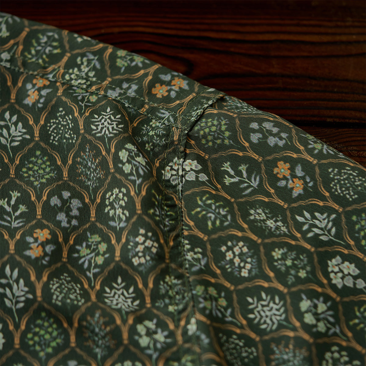 ドレープ感と程よい光沢のある生地は、ポリエステル100%素材を採用。しっとりと冷涼感を伴った滑らかな肌触りは抜群、汗ばむ時期でも快適な着心地をキープ。