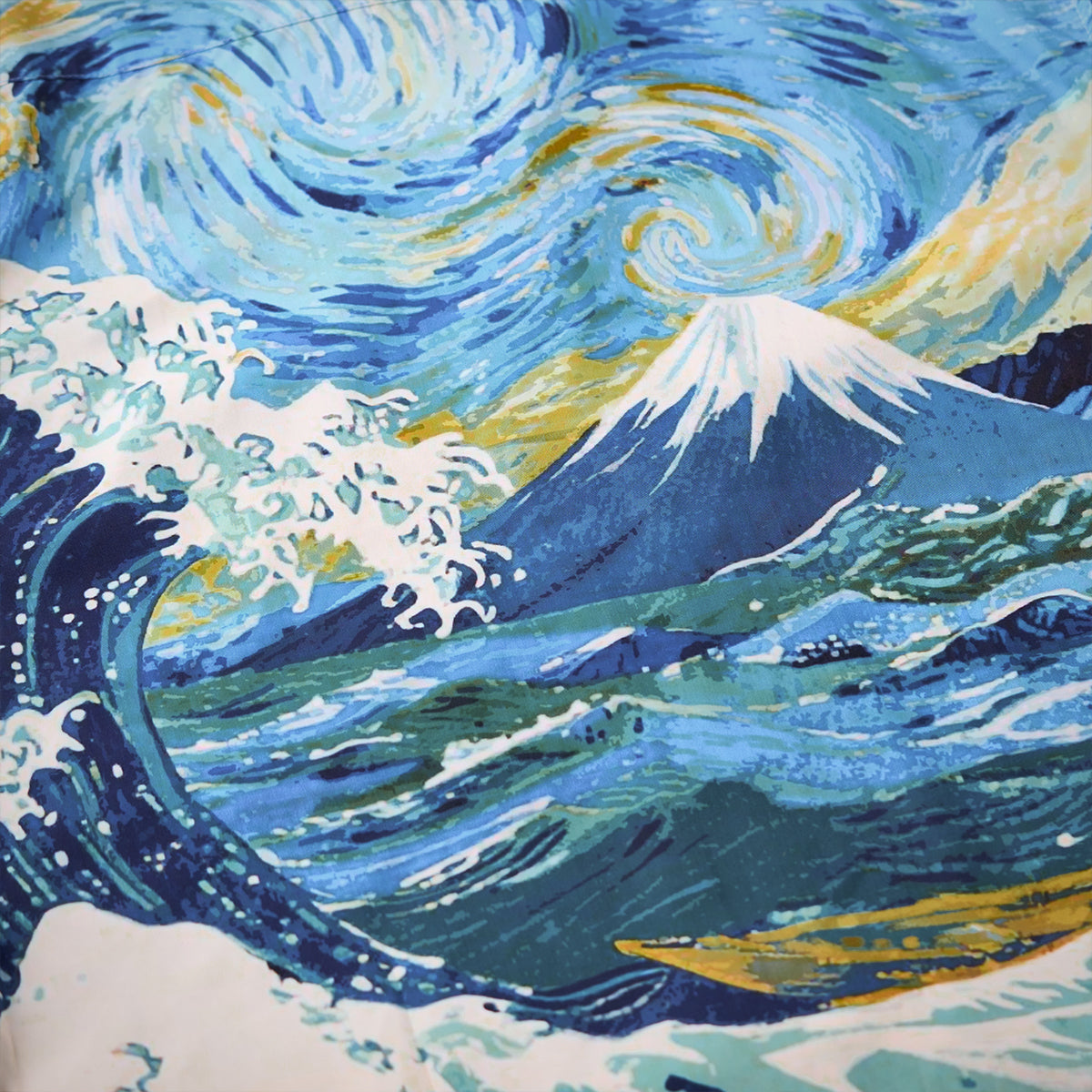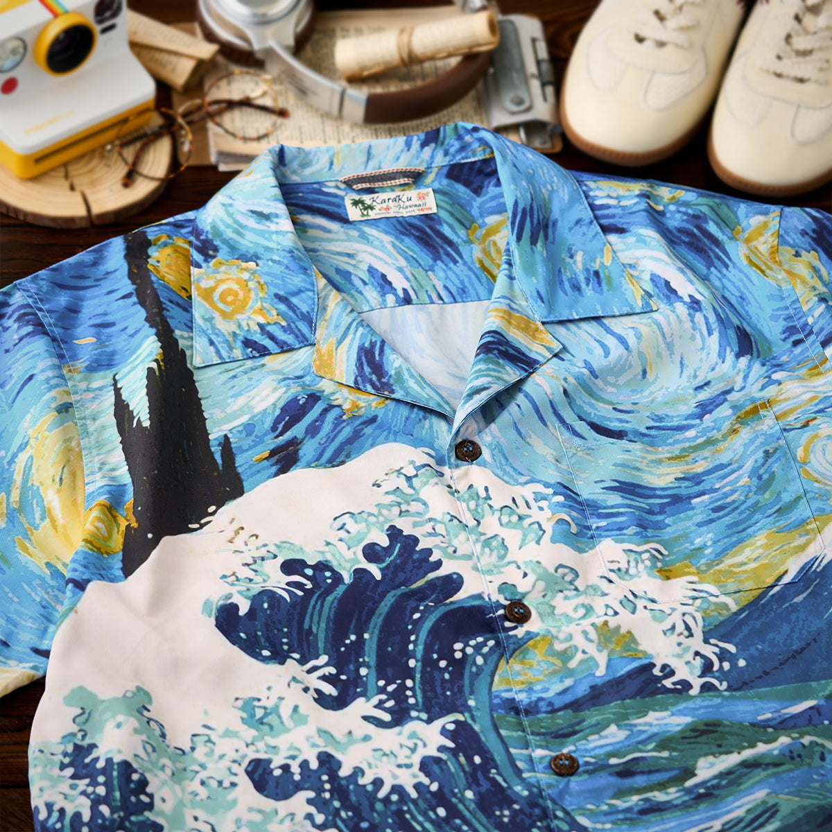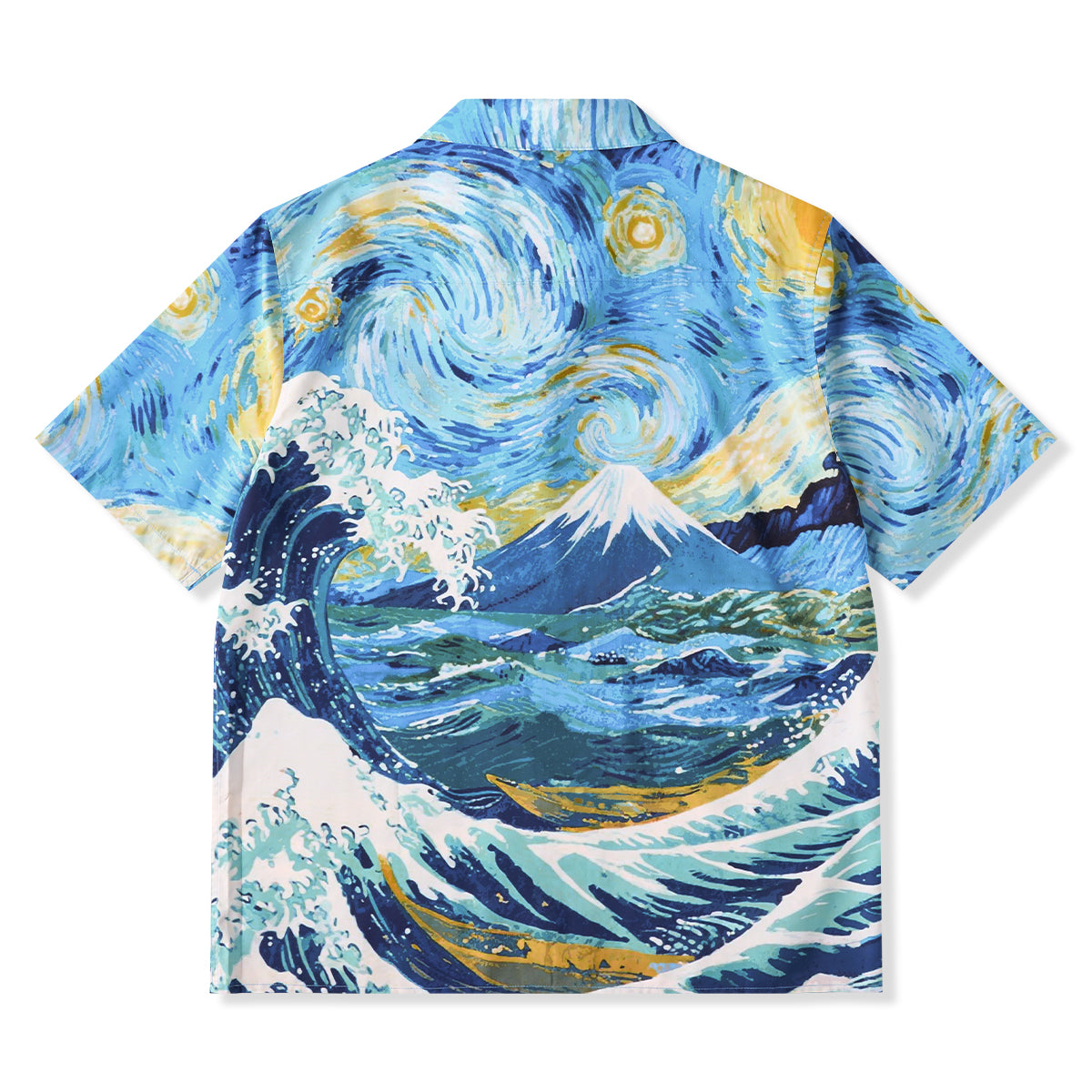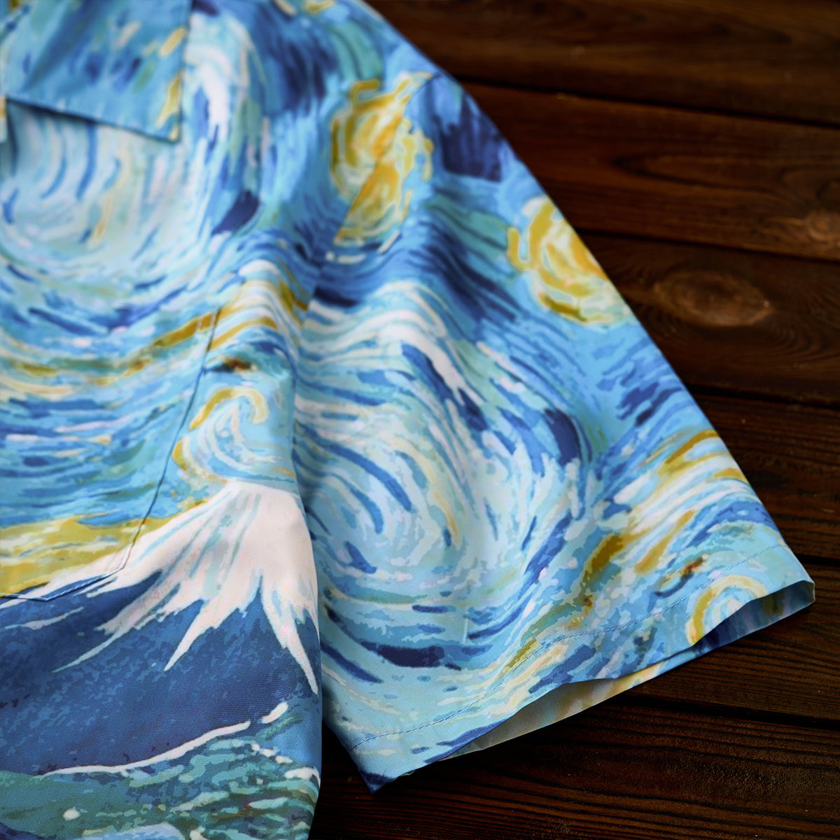 ゴッホの《星月夜》と葛飾北斎《神奈川沖浪裏》の力強い波の美がひとつに融合されたアロハシャツ。大胆な筆致と色彩を、アロハシャツのキャンバスに落とし込みました。深いブルーと煌めくイエローが織りなす宇宙、迫りくる波が刻む自然の息吹――まるで夢の中を旅するような、幻想的な一枚に仕上がっています。リラックス感のあるオープンカラー仕様で、暑い季節にも快適に羽織っていただけます。クラシックな柄ながら、スタイリング次第でモードにも、和モダンにも。アートピースのような一着を、日常に取り入れてみませんか。