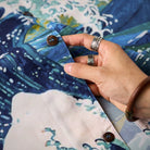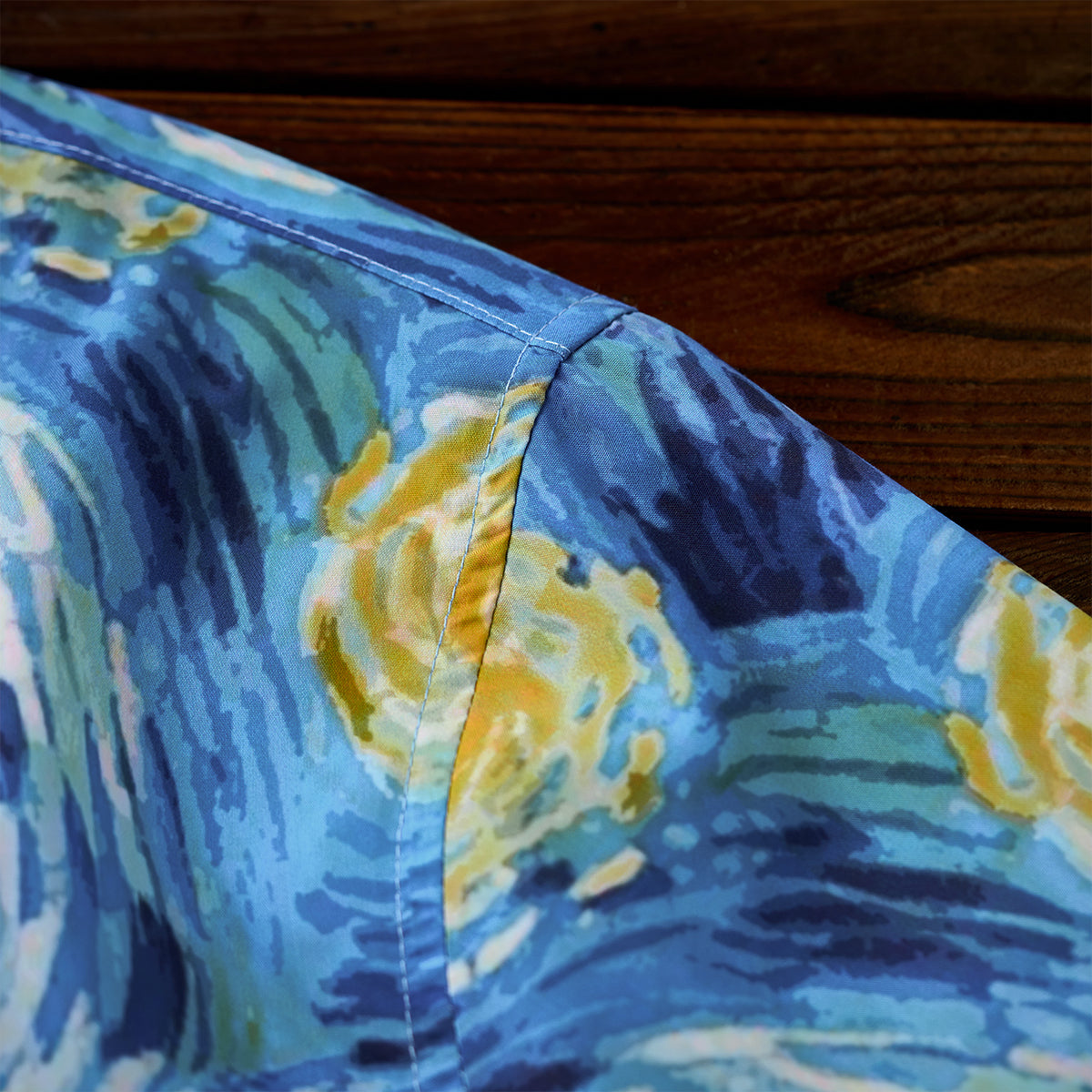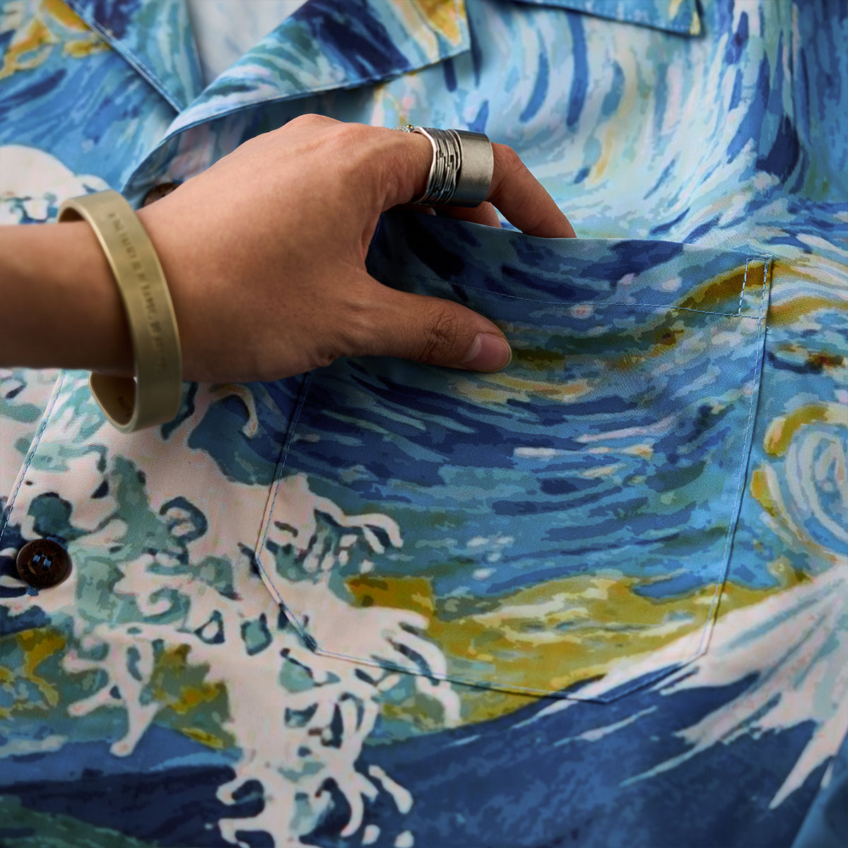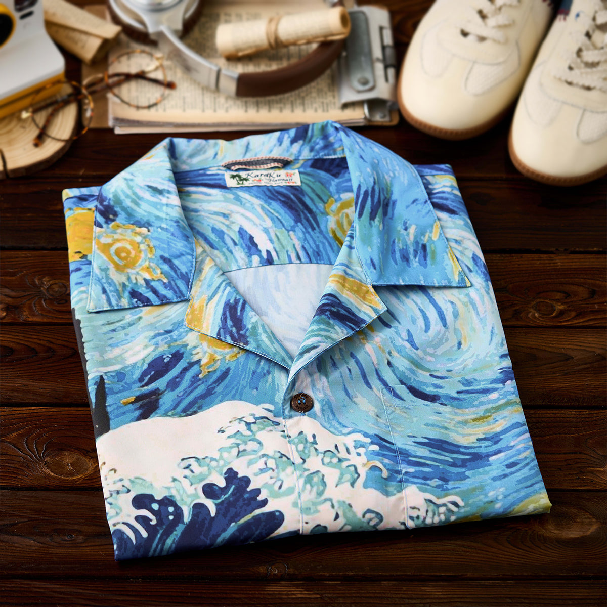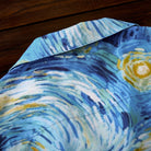ゴッホの《星月夜》と葛飾北斎《神奈川沖浪裏》の力強い波の美がひとつに融合されたアロハシャツ。大胆な筆致と色彩を、アロハシャツのキャンバスに落とし込みました。深いブルーと煌めくイエローが織りなす宇宙、迫りくる波が刻む自然の息吹――まるで夢の中を旅するような、幻想的な一枚に仕上がっています。リラックス感のあるオープンカラー仕様で、暑い季節にも快適に羽織っていただけます。クラシックな柄ながら、スタイリング次第でモードにも、和モダンにも。アートピースのような一着を、日常に取り入れてみませんか。
