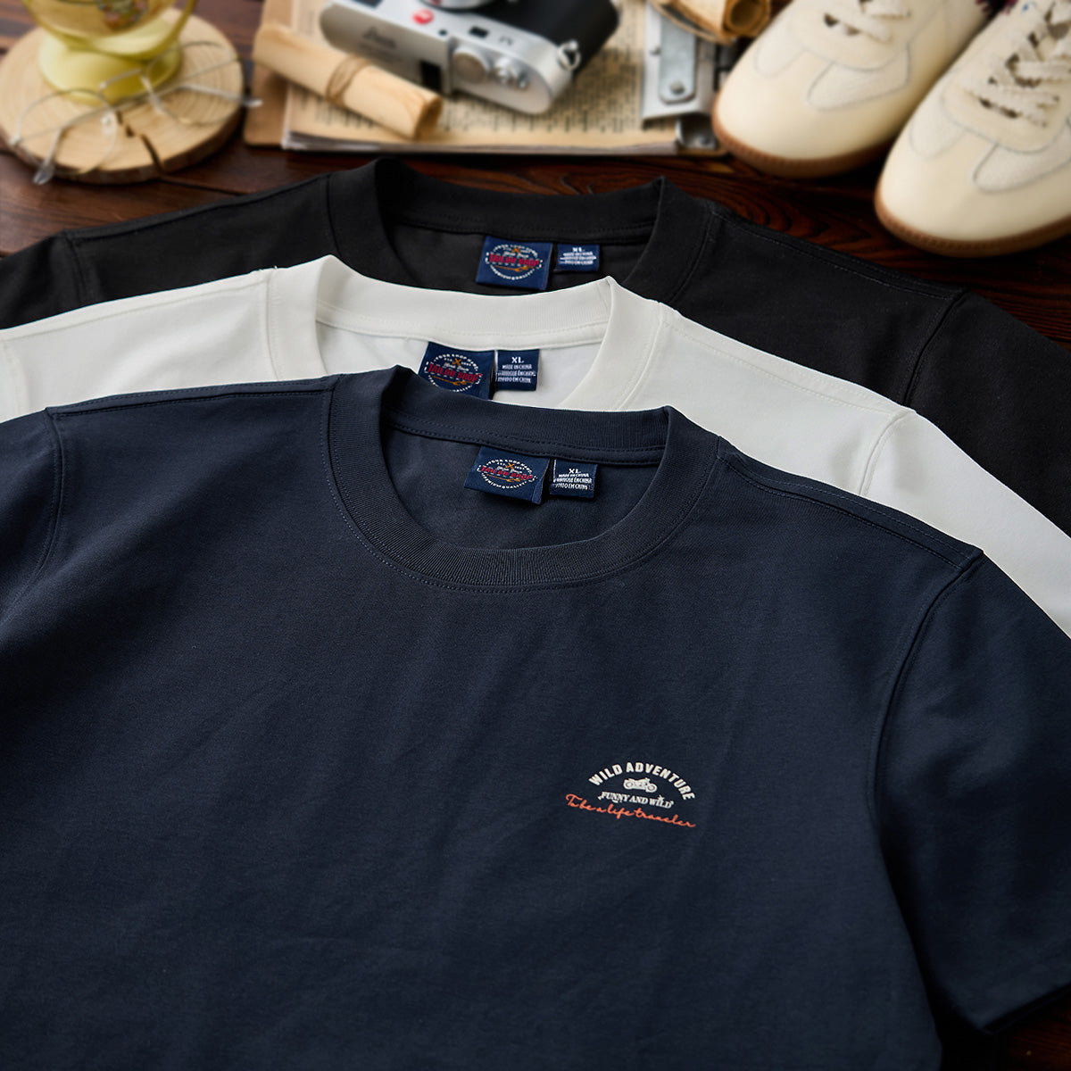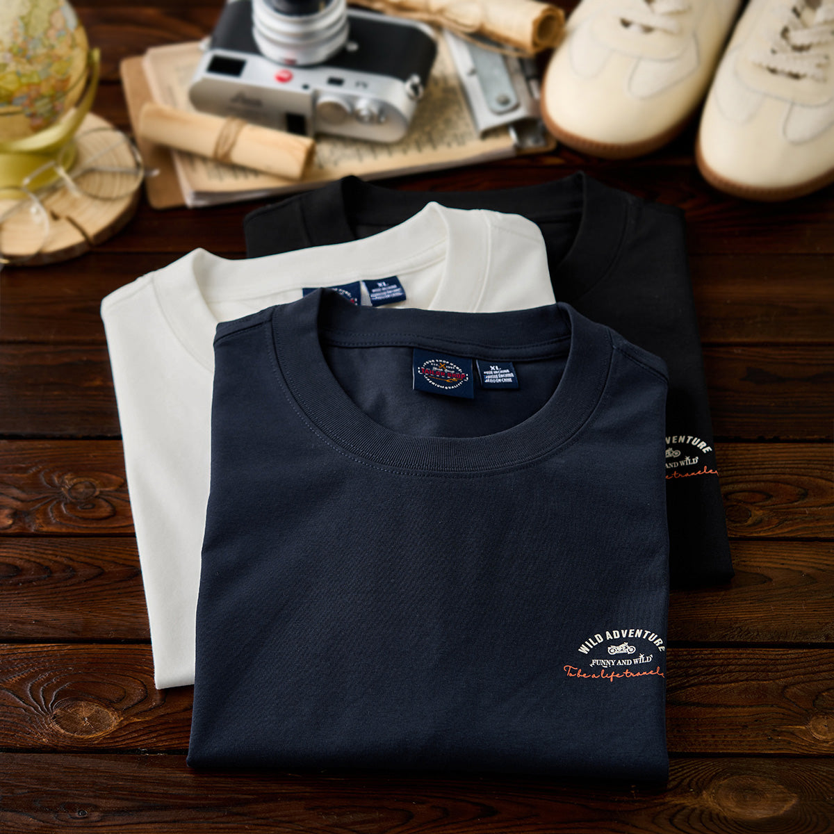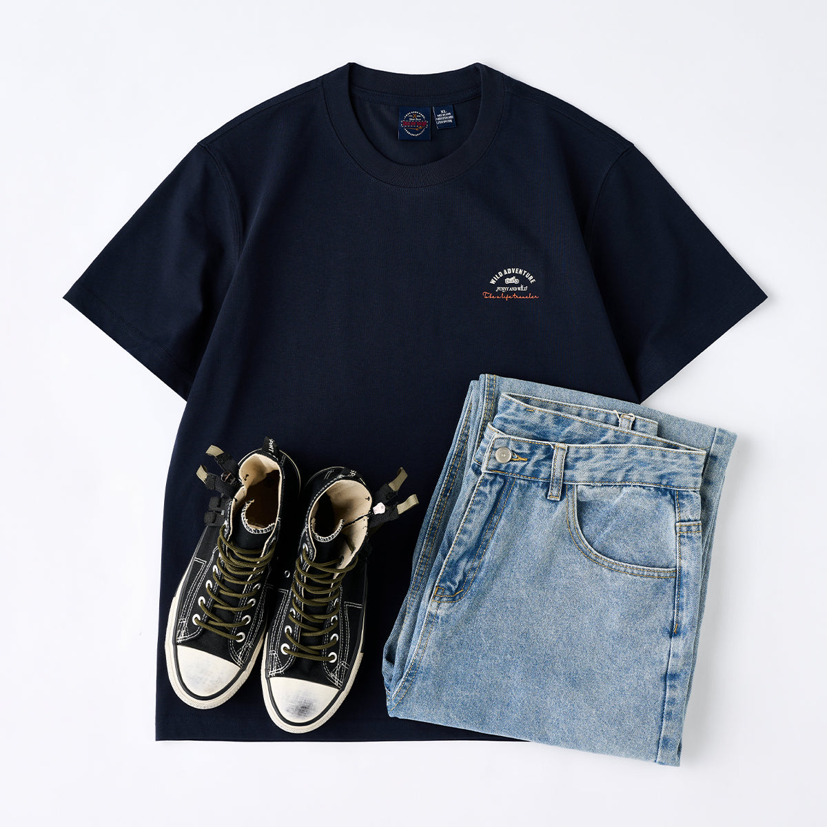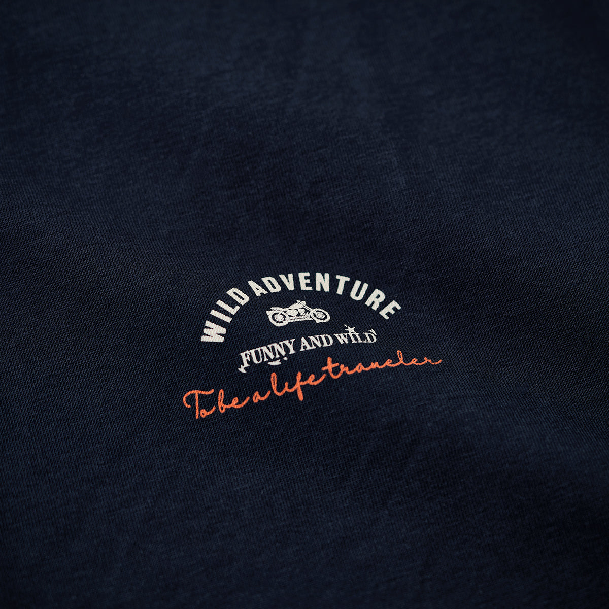 小さなオートバイプリントが胸の左側に配置されて、クラシックなイラストは、ヴィンテージ感と伝統を感じさせる。大きな「WILD ADVENTURE」「FUNNY AND WILD」というテキストが周囲に配置、モトクロス競技の興奮とスリルを強調。