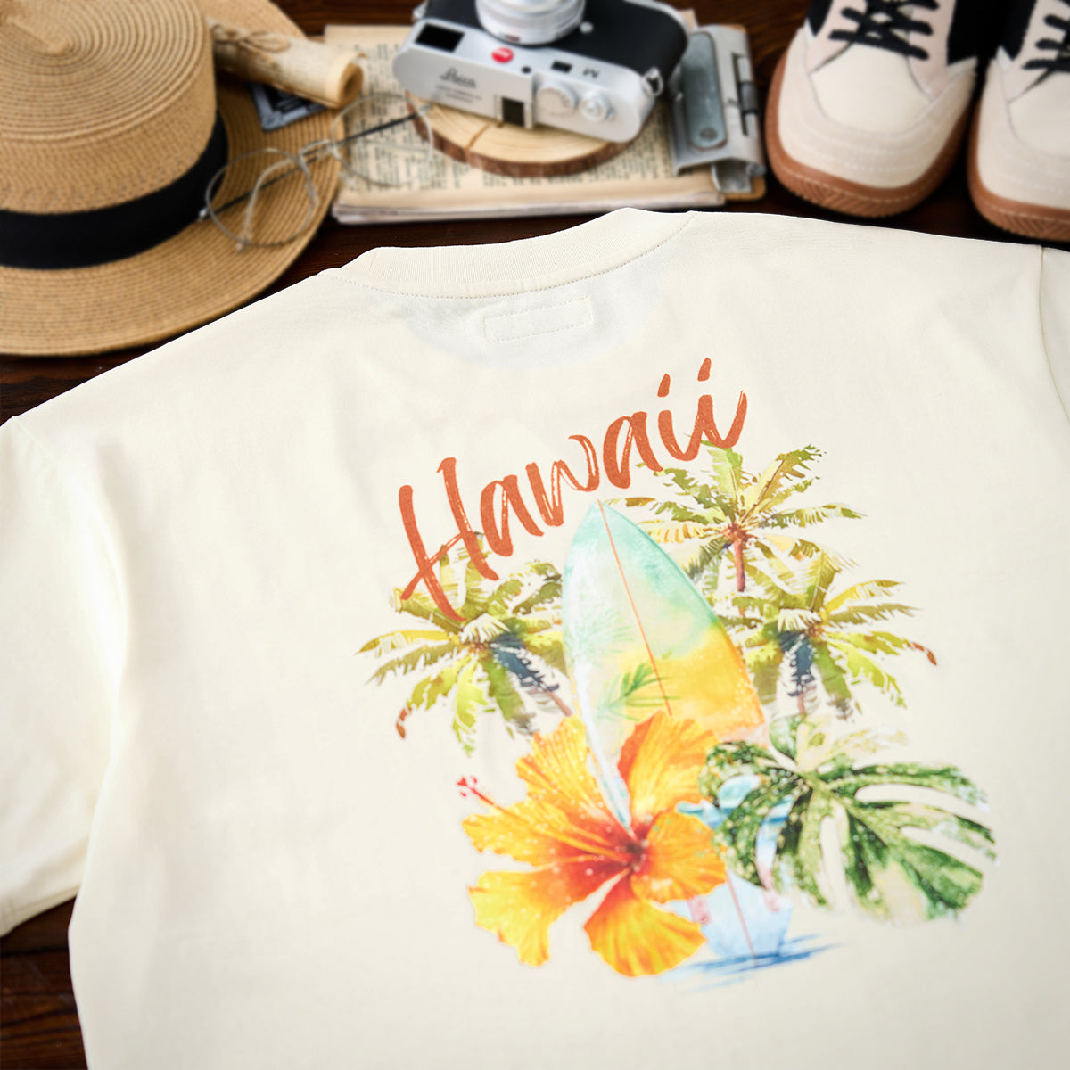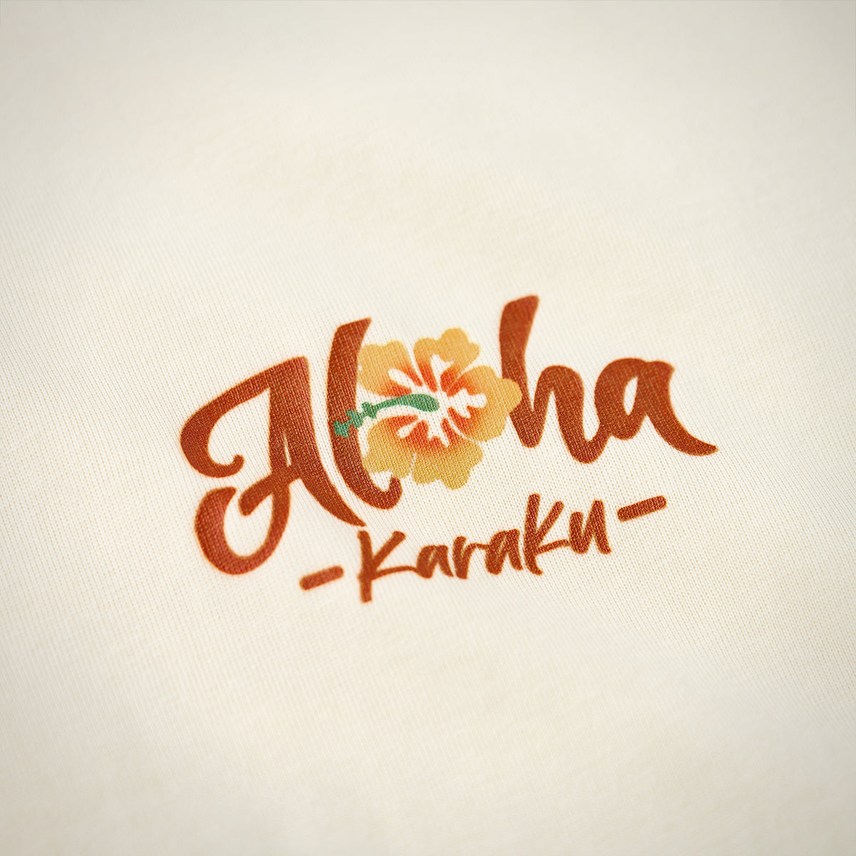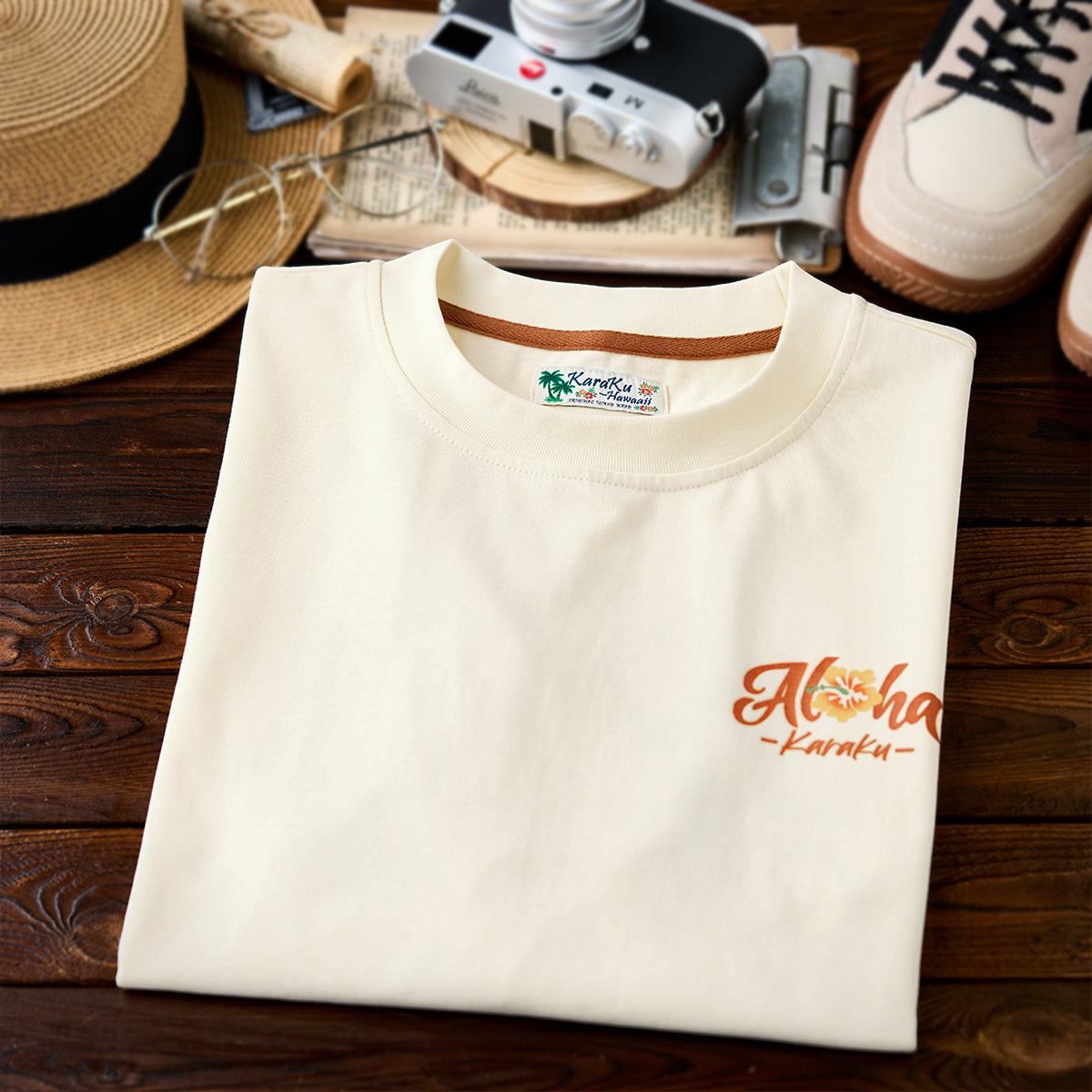 南国ムード漂うハワイアンモチーフの水彩風プリントを大胆にあしらったコットンTシャツ。サーフボードやモンステラ、ハイビスカス、ヤシの木などが重なり合い、リゾート気分を演出します。フロントの胸元には、「alohakaraku」のロゴプリントをワンポイントに。フロントはシンプルに仕上げ、バックプリントとのコントラストが映える一枚に。一枚で主役になる、アートとファッションが出会ったTシャツです。