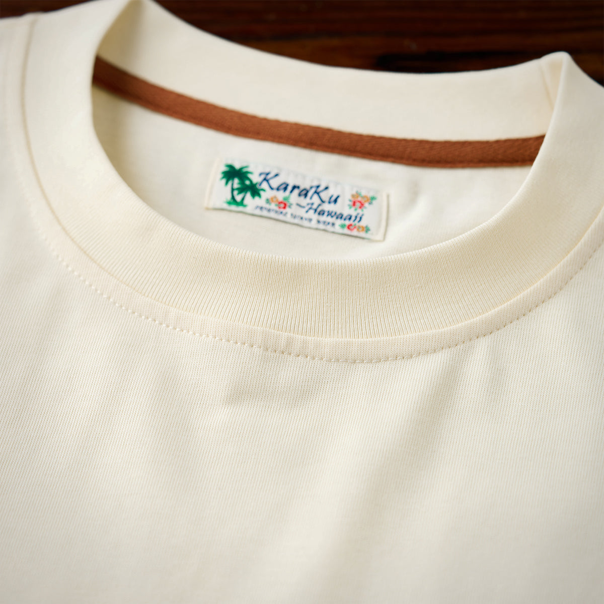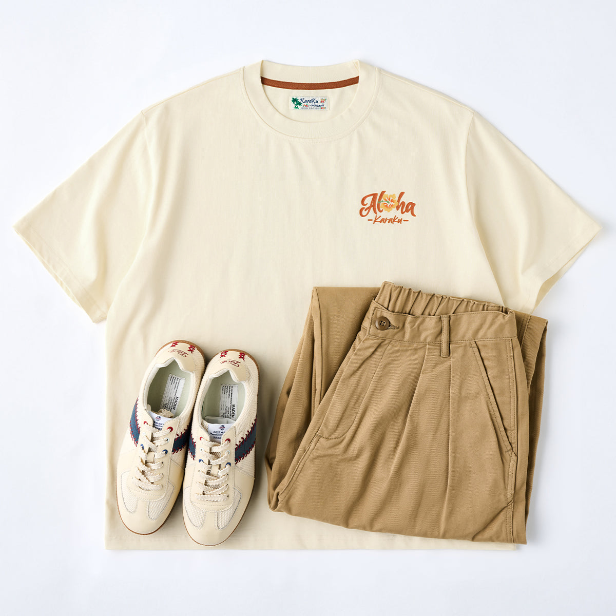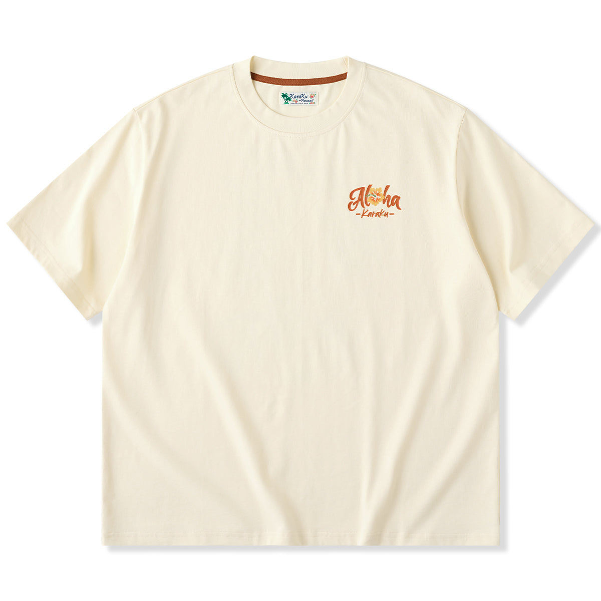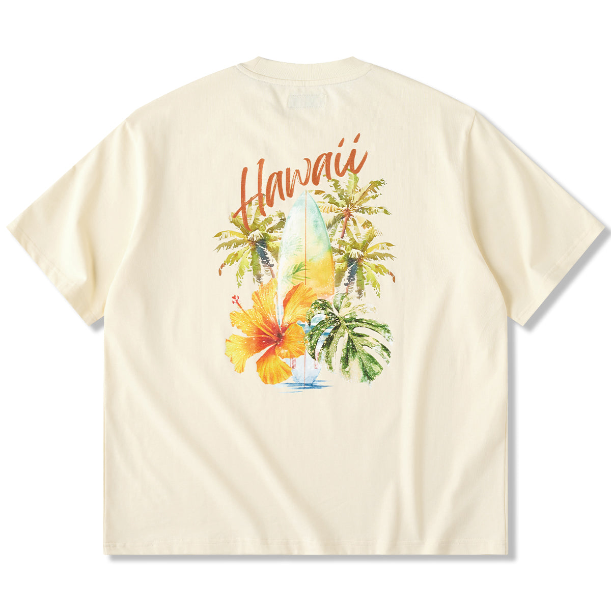 南国ムード漂うハワイアンモチーフの水彩風プリントを大胆にあしらったコットンTシャツ。サーフボードやモンステラ、ハイビスカス、ヤシの木などが重なり合い、リゾート気分を演出します。フロントの胸元には、「alohakaraku」のロゴプリントをワンポイントに。フロントはシンプルに仕上げ、バックプリントとのコントラストが映える一枚に。一枚で主役になる、アートとファッションが出会ったTシャツです。