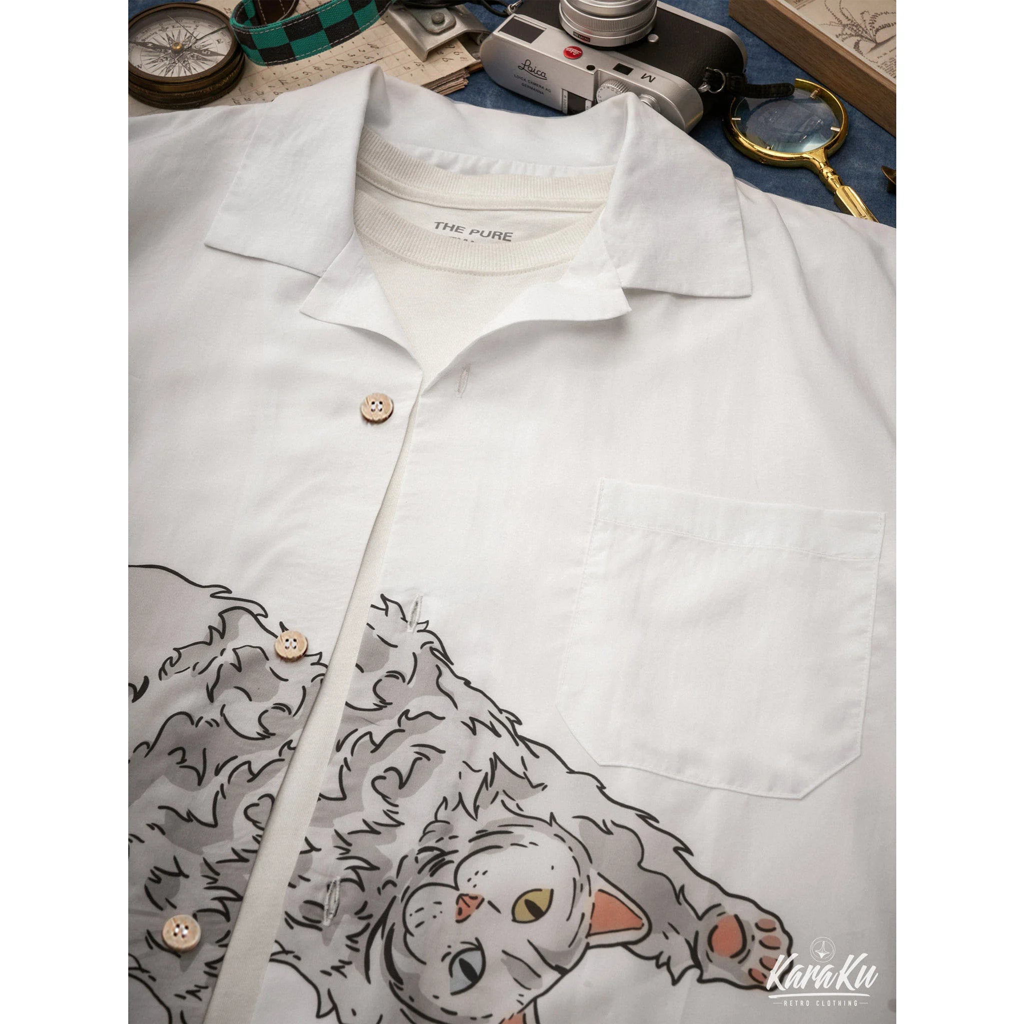 Ilustrasi comel seekor kucing yang mengintai keluar dari bahagian atas poket dilukis di dada kiri, menjadikannya menonjol.