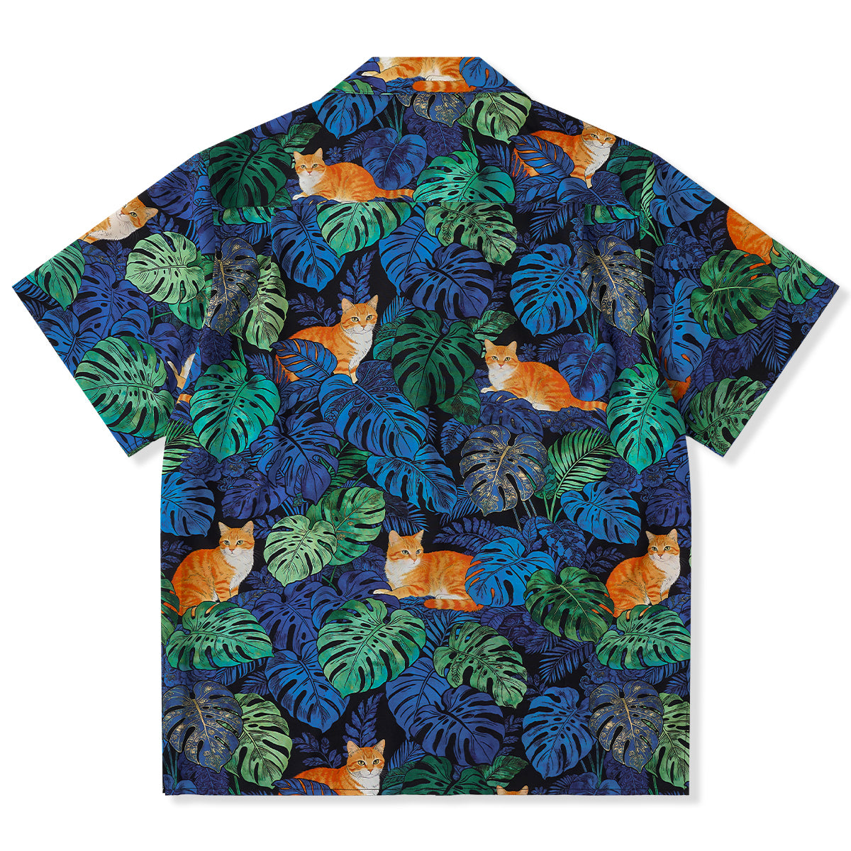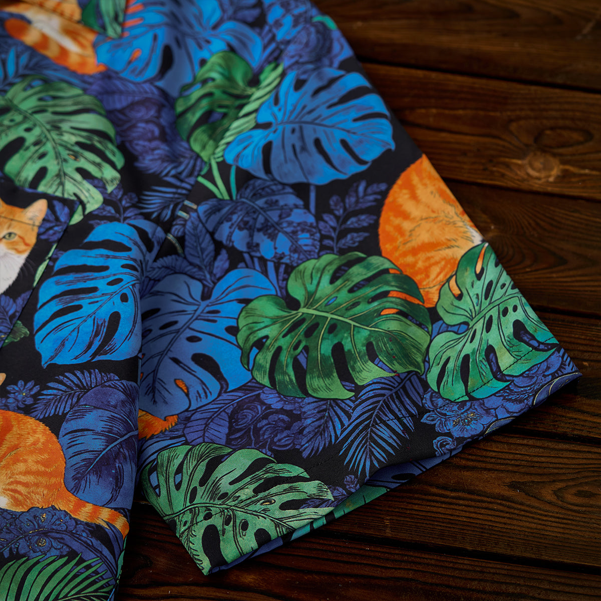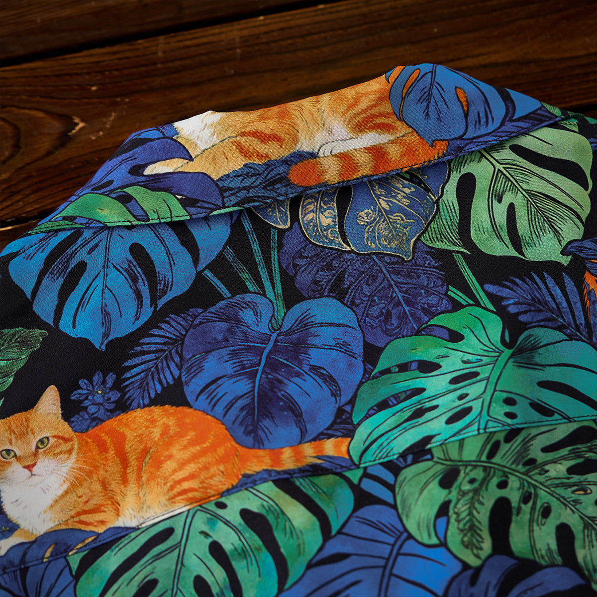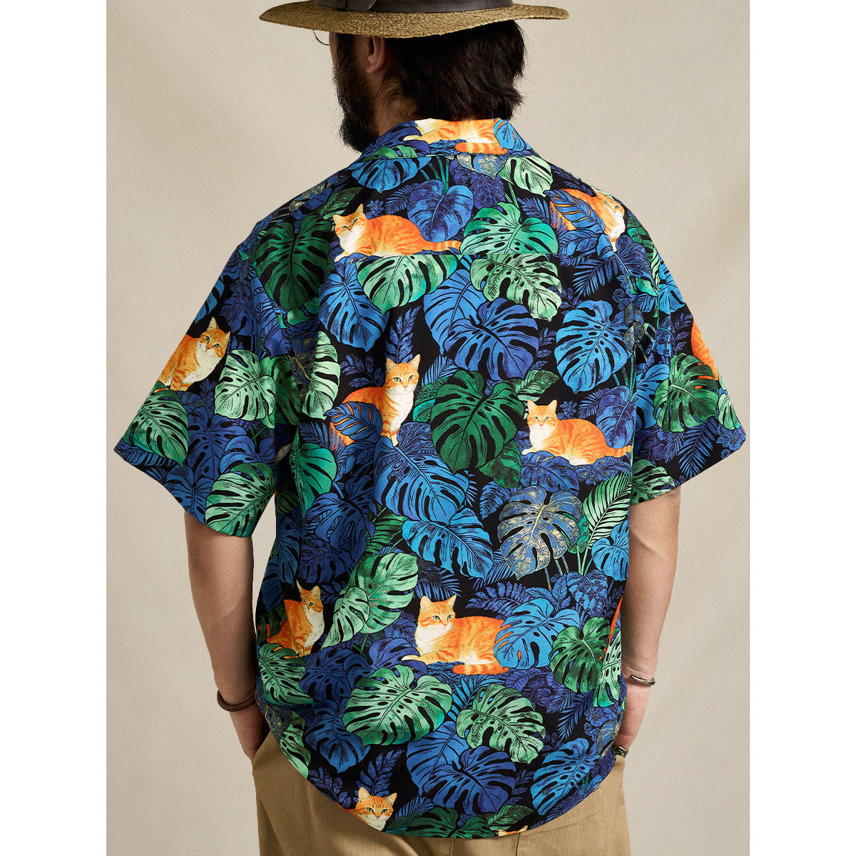 夏のリゾート気分をそのまま楽しめる、遊び心あふれる総柄アロハシャツ。鮮やかなブルーグリーンのモンステラや熱帯植物の合間で、オレンジ色の茶トラ猫がゆったりとくつろぐデザインは、目を惹く補色の配色で仕上げました。ゆったりとしたキューバカラーの襟と軽やかな素材感で、海辺の散歩やカジュアルな街着にもぴったり。着るだけで夏らしいリラックスムードを演出できる一枚です。
