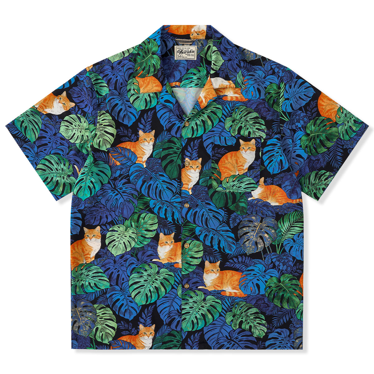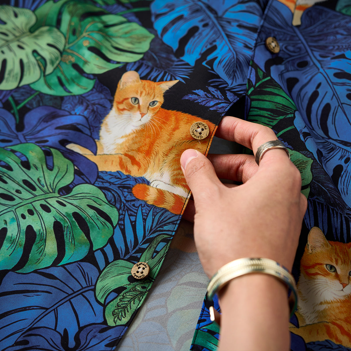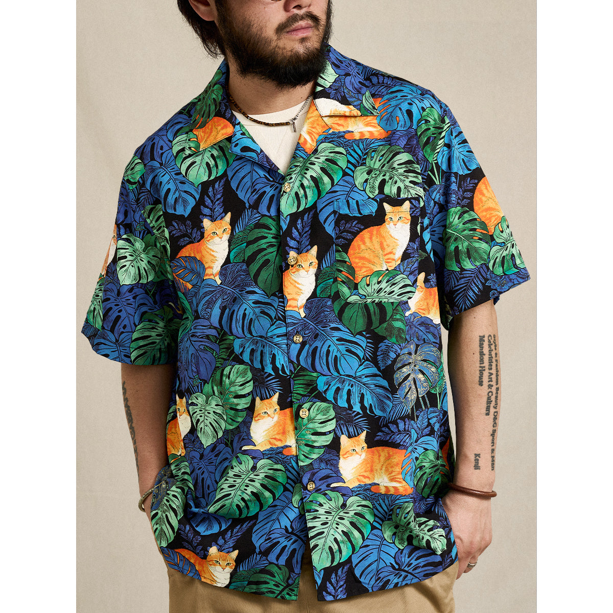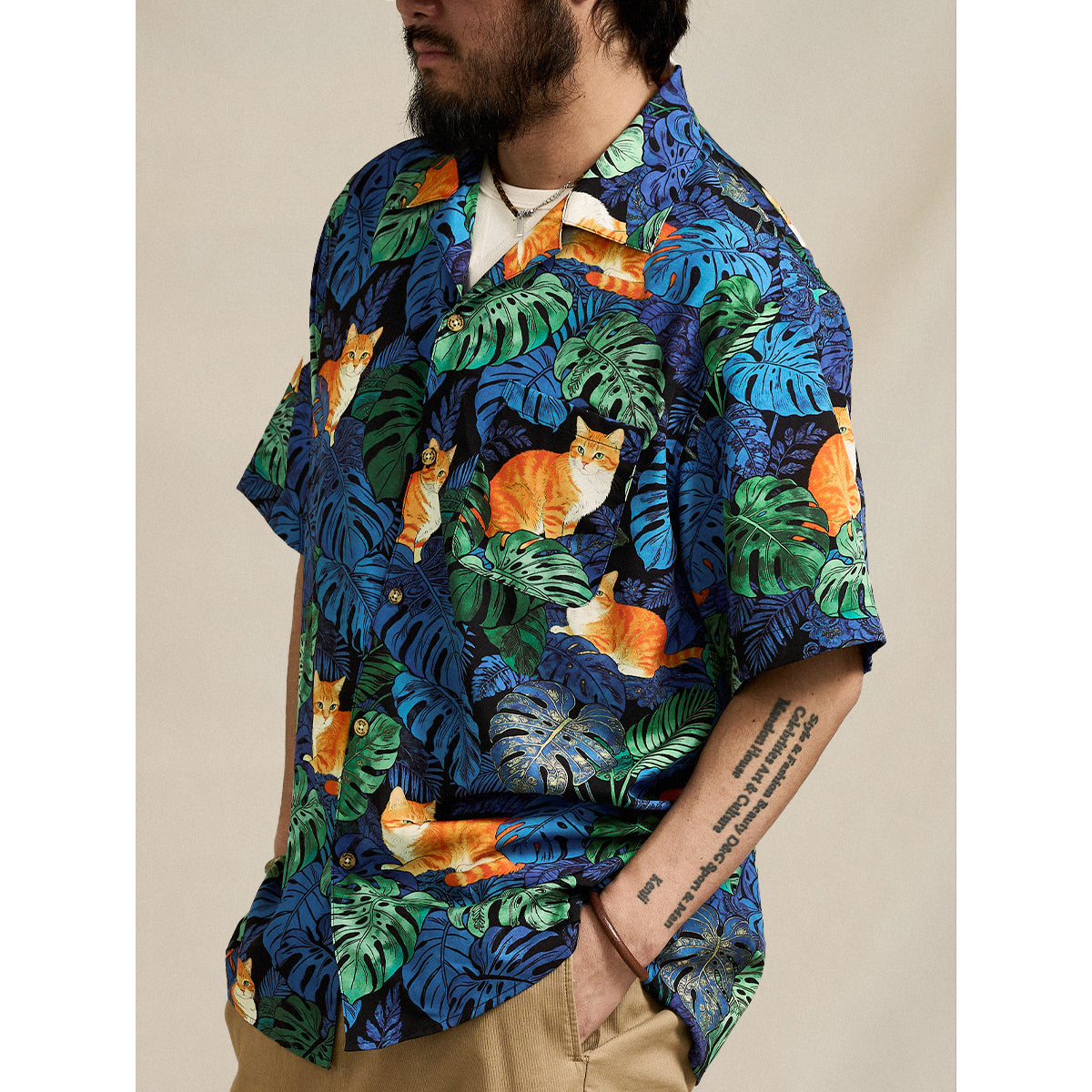 夏のリゾート気分をそのまま楽しめる、遊び心あふれる総柄アロハシャツ。鮮やかなブルーグリーンのモンステラや熱帯植物の合間で、オレンジ色の茶トラ猫がゆったりとくつろぐデザインは、目を惹く補色の配色で仕上げました。ゆったりとしたキューバカラーの襟と軽やかな素材感で、海辺の散歩やカジュアルな街着にもぴったり。着るだけで夏らしいリラックスムードを演出できる一枚です。