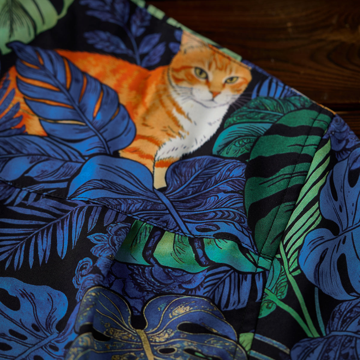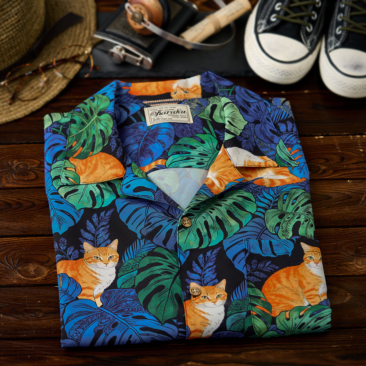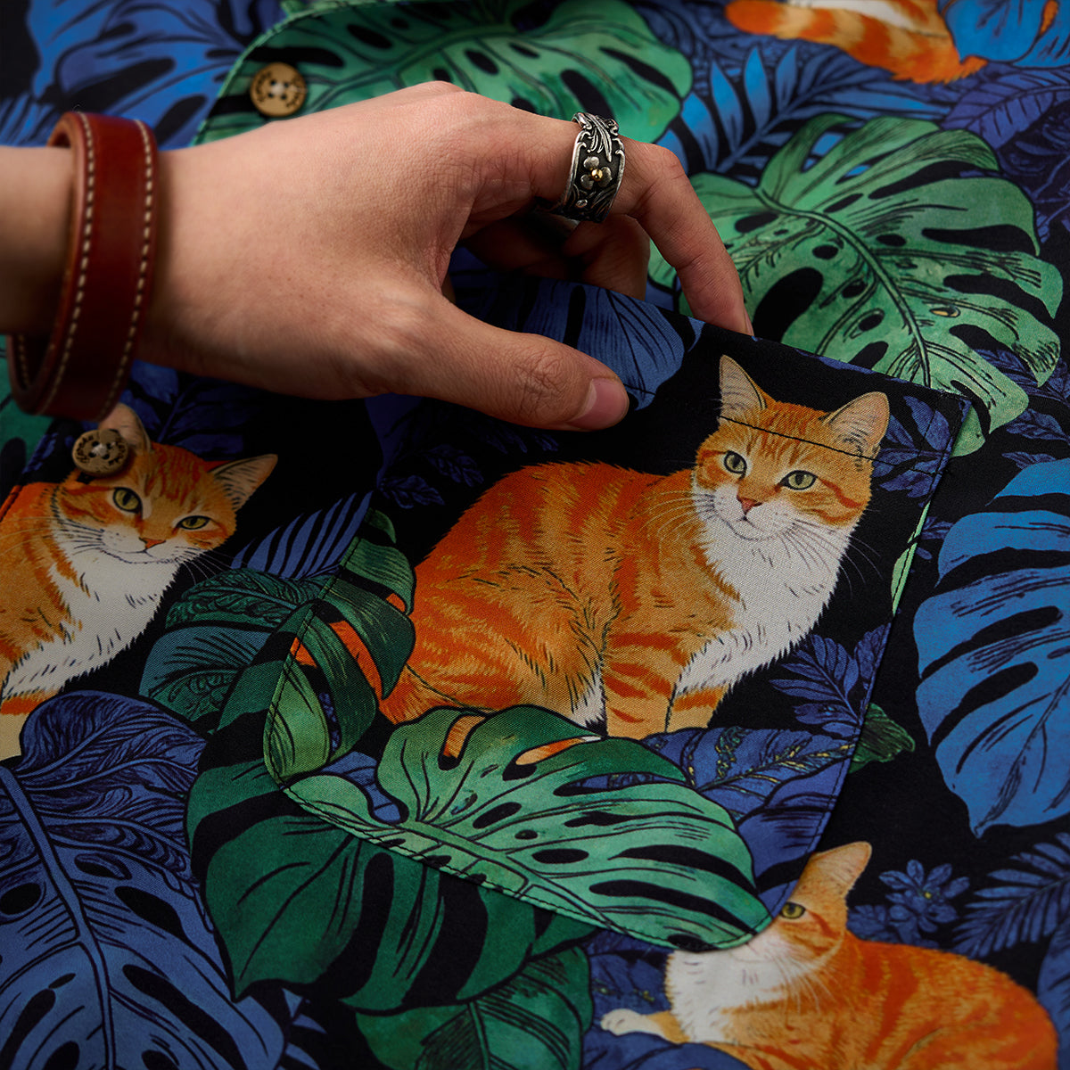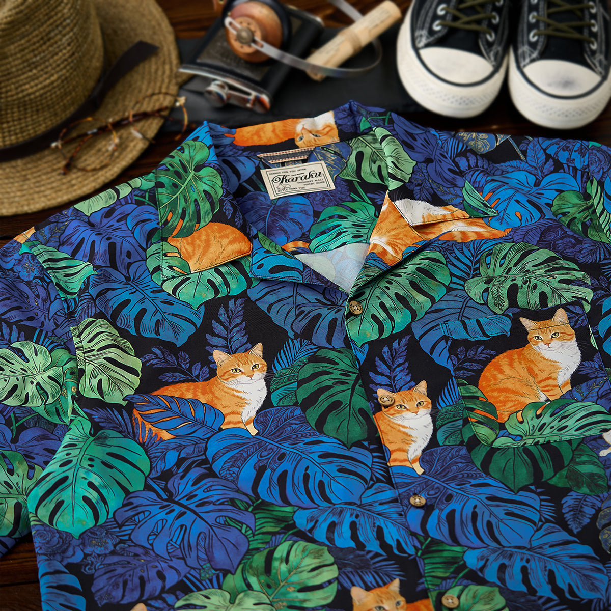 夏のリゾート気分をそのまま楽しめる、遊び心あふれる総柄アロハシャツ。鮮やかなブルーグリーンのモンステラや熱帯植物の合間で、オレンジ色の茶トラ猫がゆったりとくつろぐデザインは、目を惹く補色の配色で仕上げました。ゆったりとしたキューバカラーの襟と軽やかな素材感で、海辺の散歩やカジュアルな街着にもぴったり。着るだけで夏らしいリラックスムードを演出できる一枚です。
