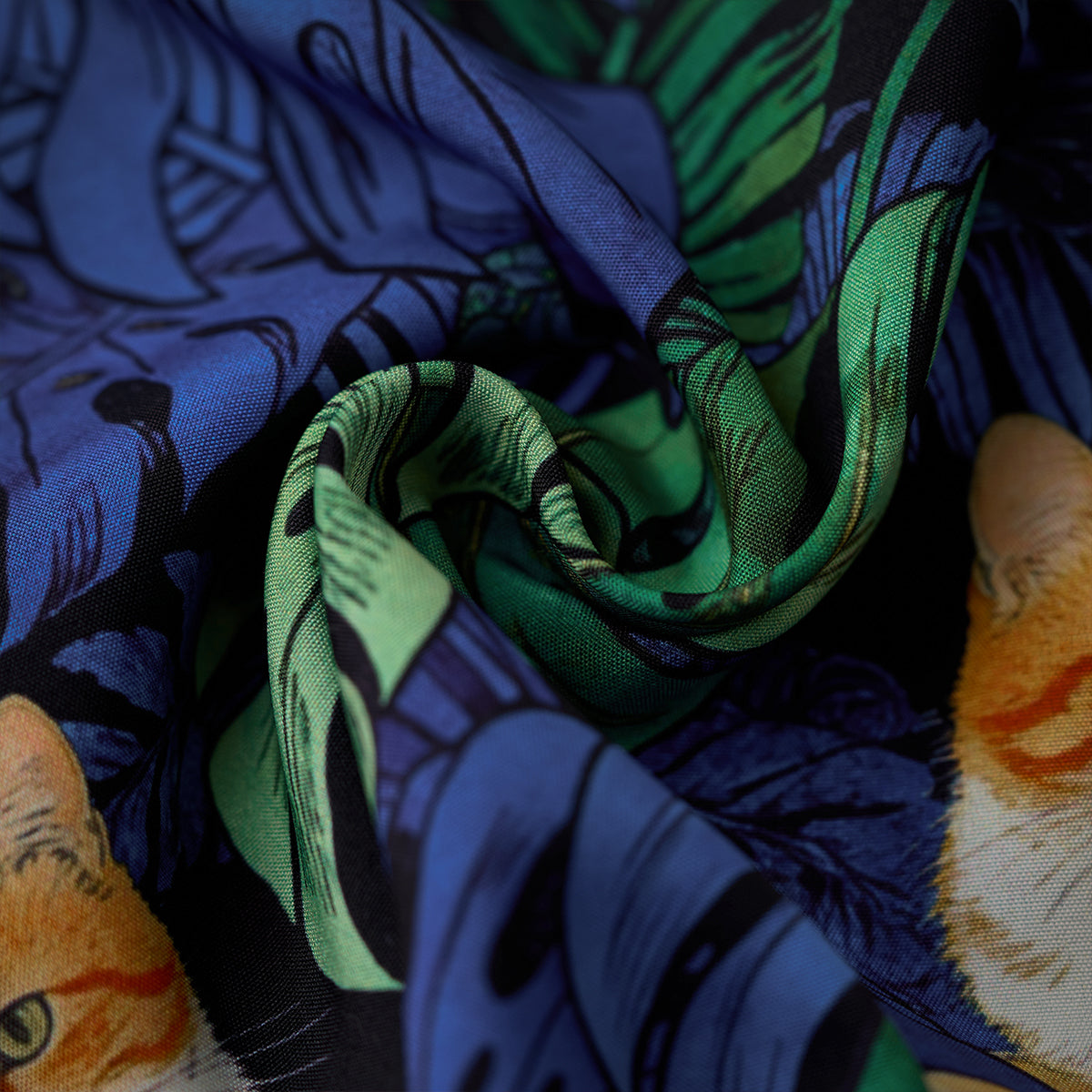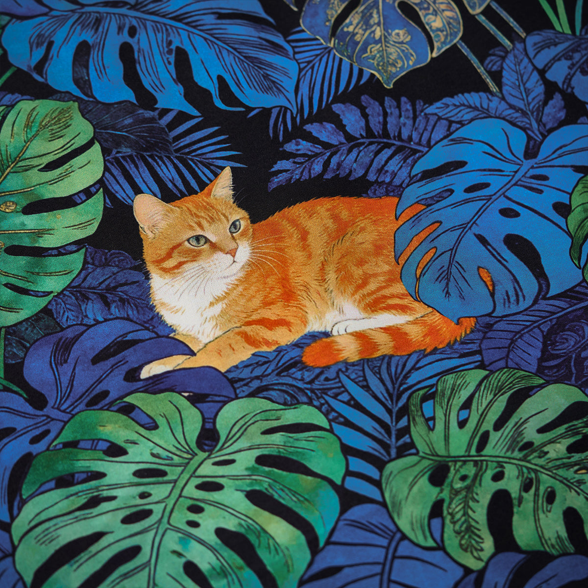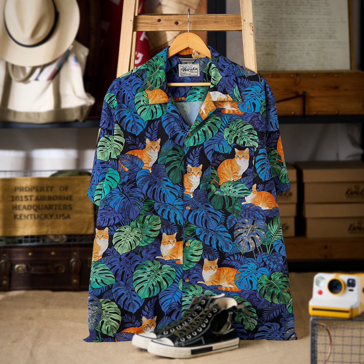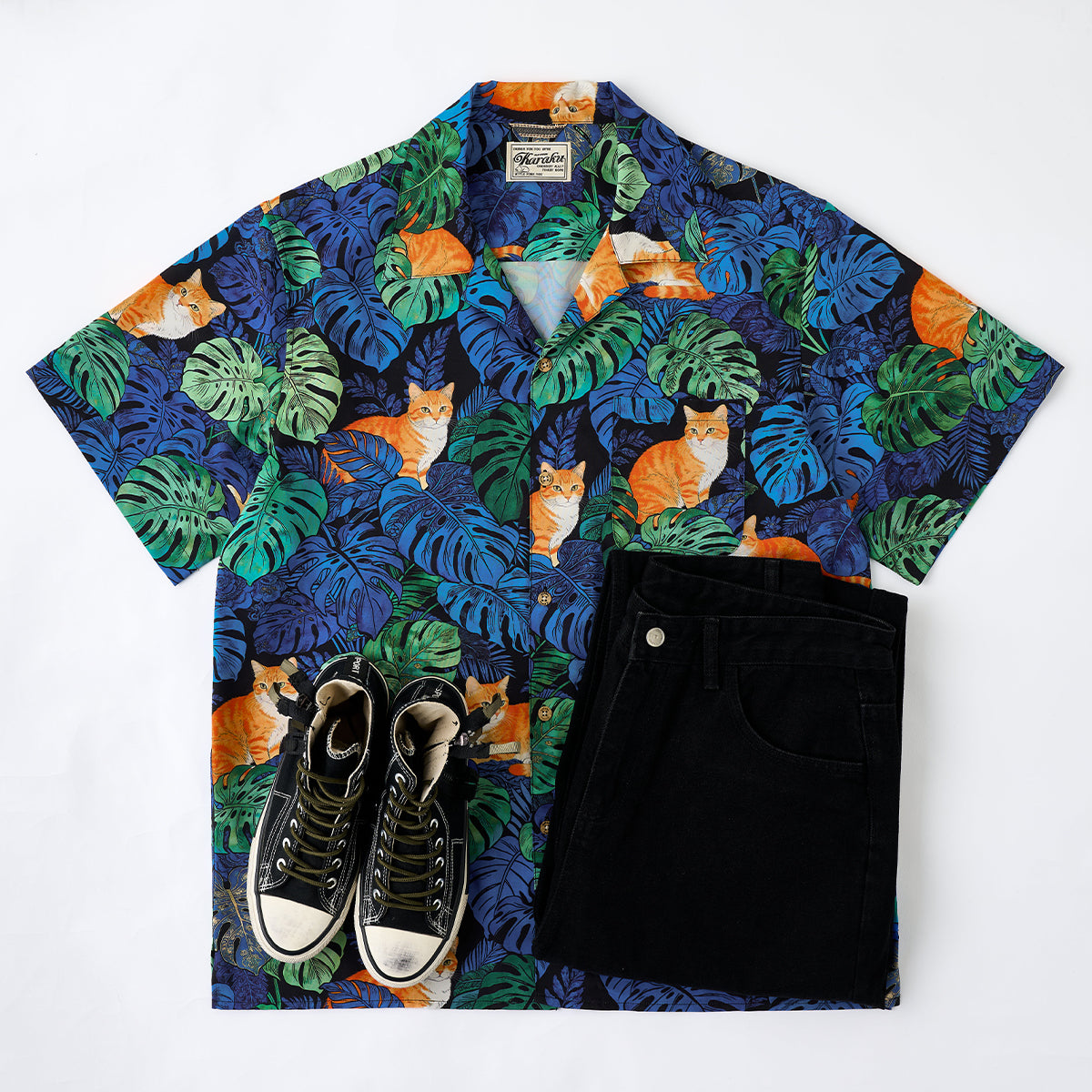夏のリゾート気分をそのまま楽しめる、遊び心あふれる総柄アロハシャツ。鮮やかなブルーグリーンのモンステラや熱帯植物の合間で、オレンジ色の茶トラ猫がゆったりとくつろぐデザインは、目を惹く補色の配色で仕上げました。ゆったりとしたキューバカラーの襟と軽やかな素材感で、海辺の散歩やカジュアルな街着にもぴったり。着るだけで夏らしいリラックスムードを演出できる一枚です。