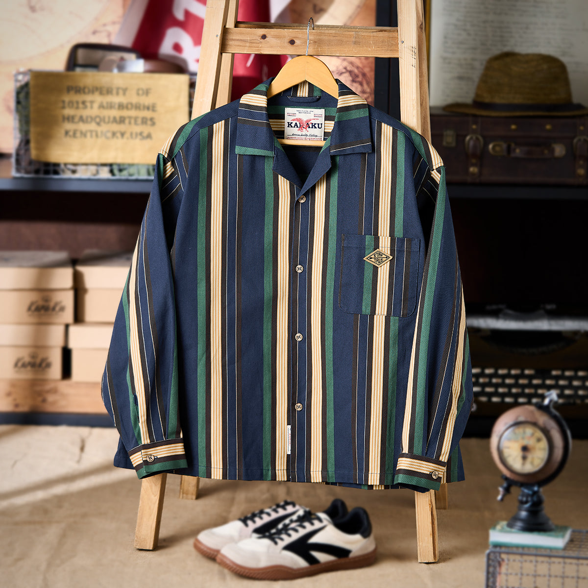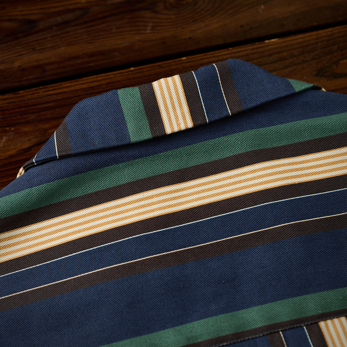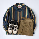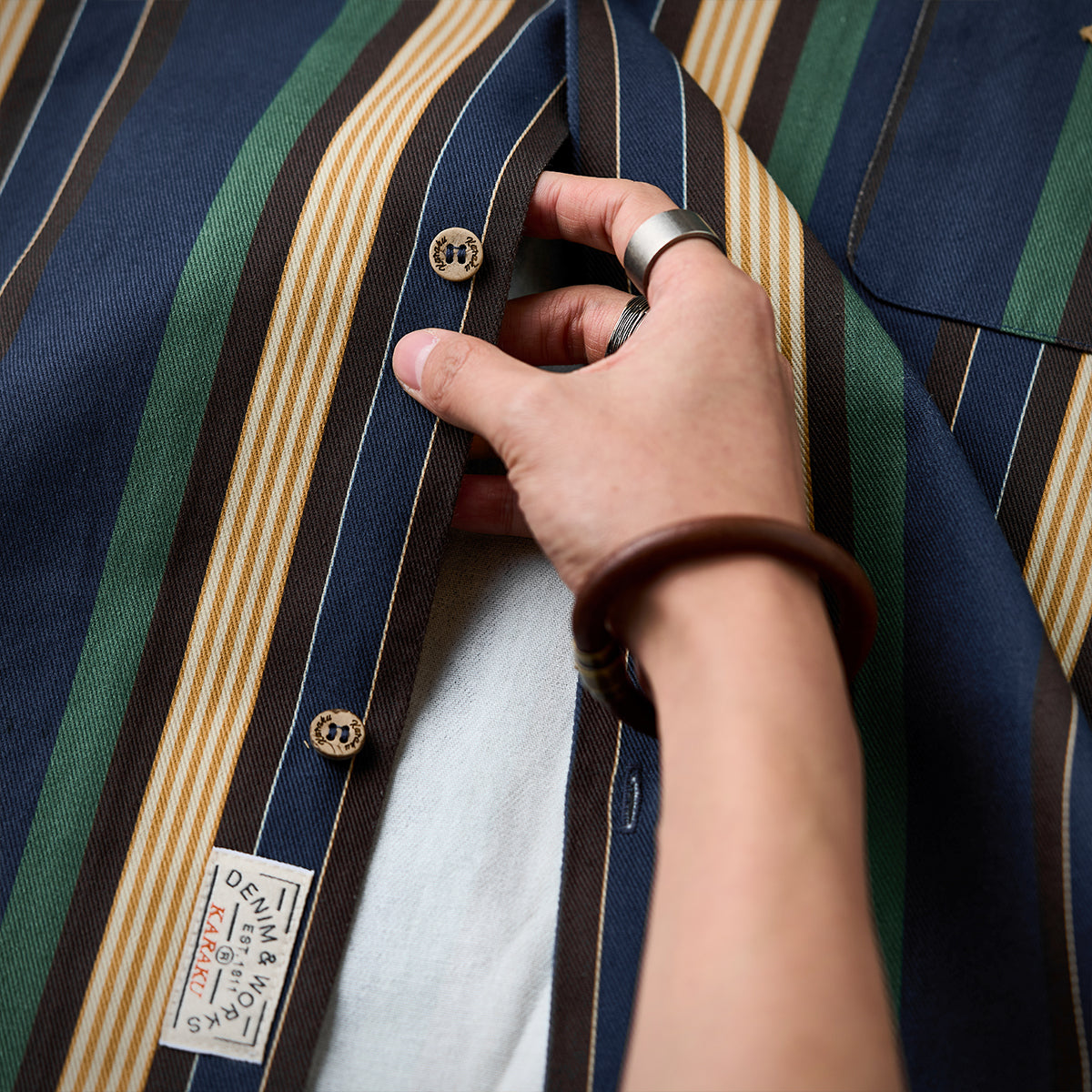 【予約】「STAY TRUE」刺繍ワッペン マルチストライプ柄オープンカラーシャツ
