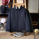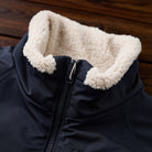 襟元はスタンドカラーで、首元をしっかりと覆います。防寒性が高く、カジュアルながらも上品な雰囲気を演出しています。