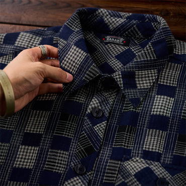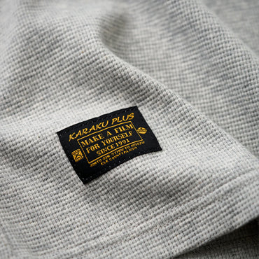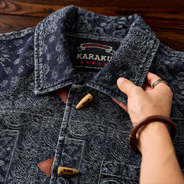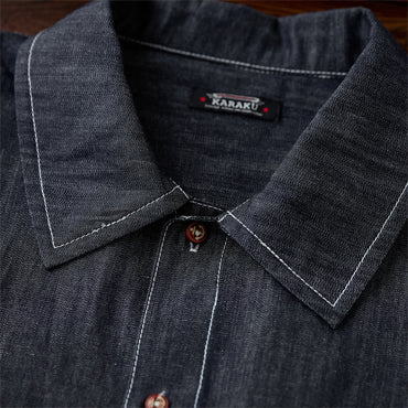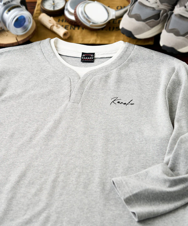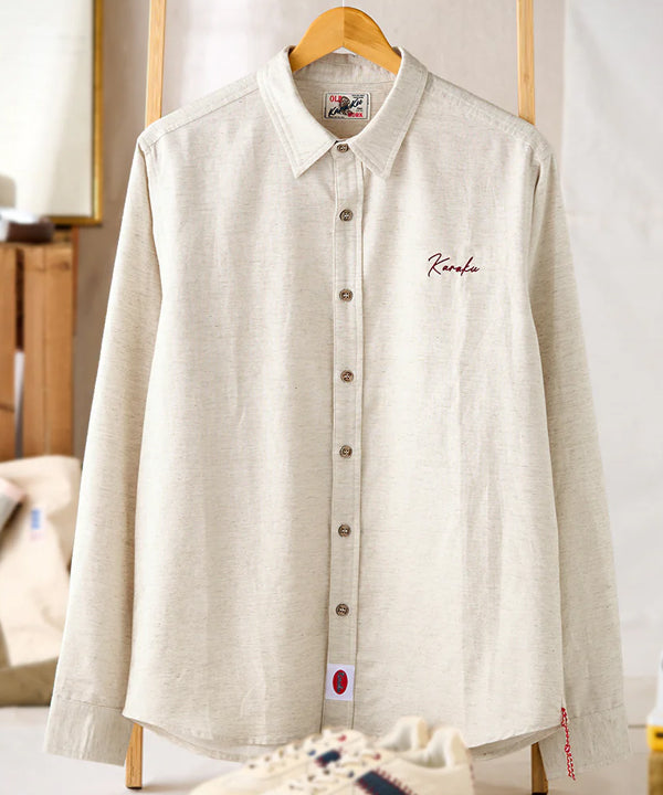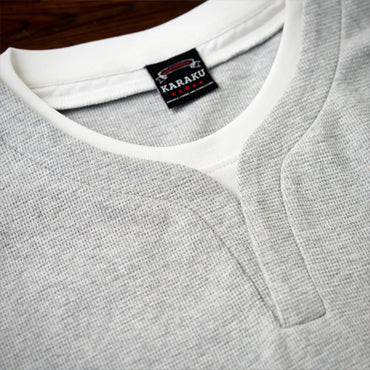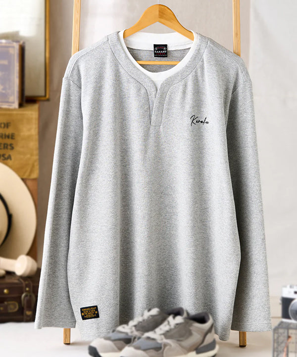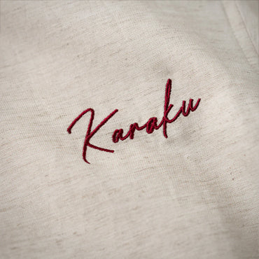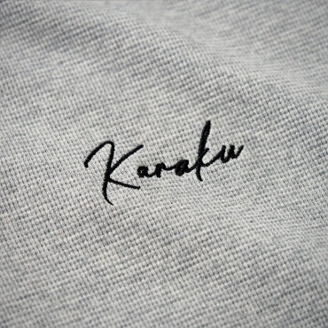 襟元に白いフェイクレイヤードのデザインが施されて、重ね着したような奥行き感を演出します。首元に明るい色を配置することで、顔周りを明るく引き立たせる効果があります。左胸部分に施された「Karaku」の刺繍は、控えめでありながらデザインのアクセントとして機能します。筆記体風のフォントは、カジュアルさと上品さを絶妙にバランスしています。